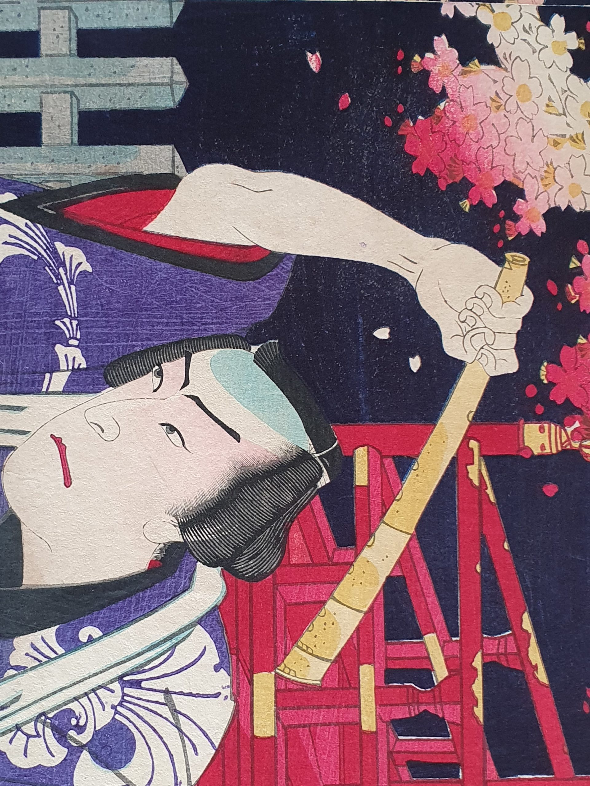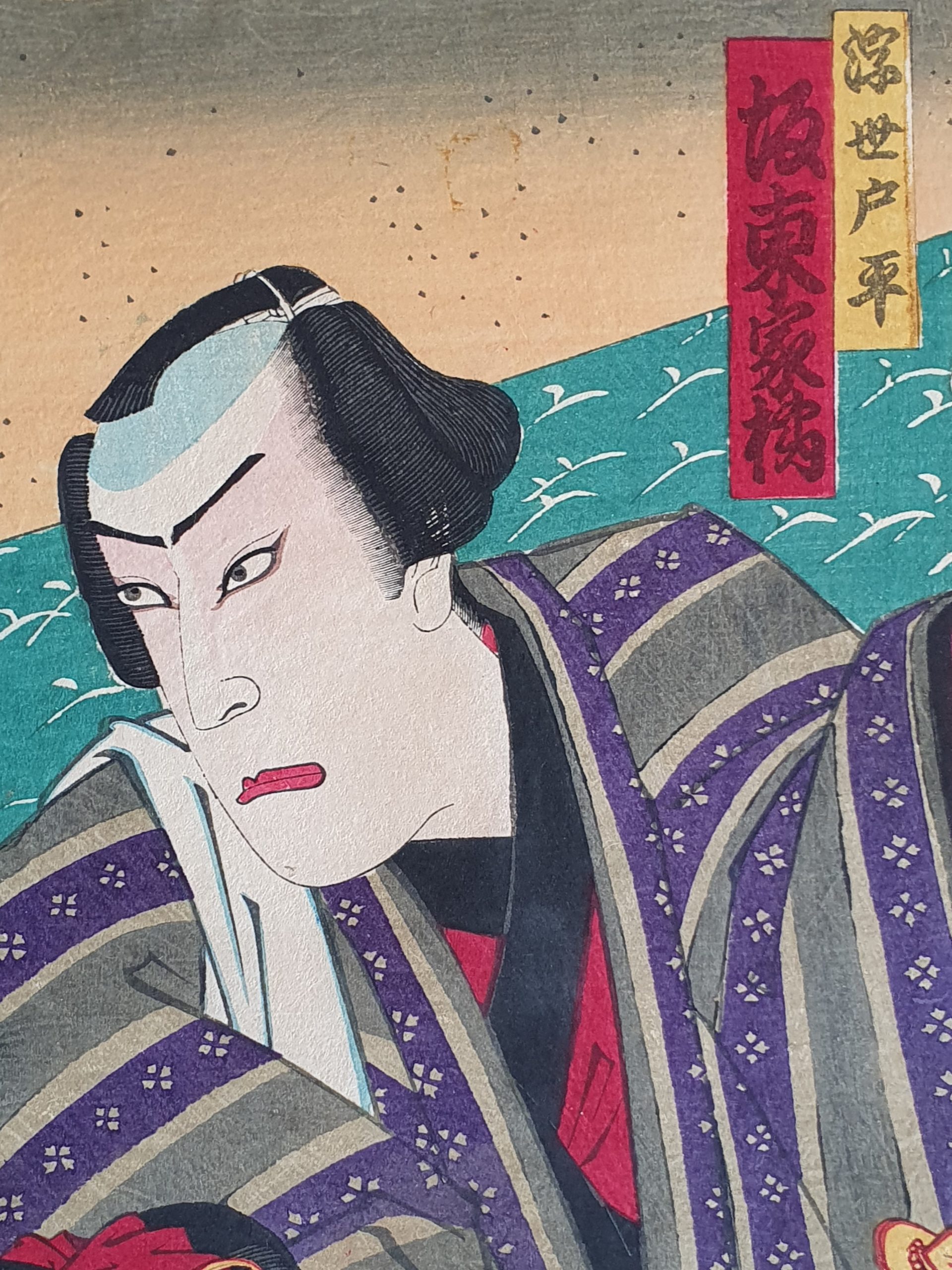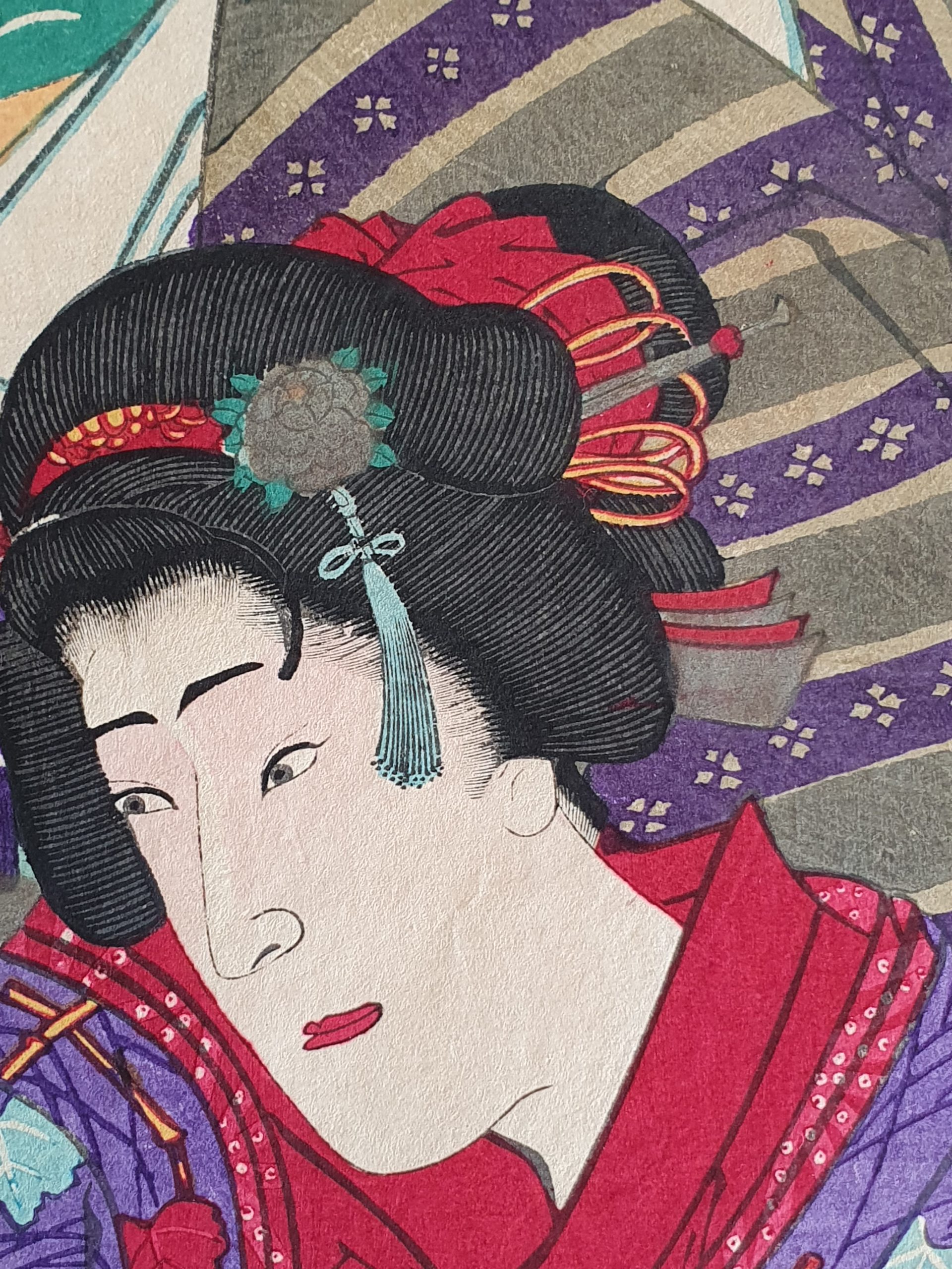 Kunichika Toyohara est l’un des plus importants artiste de l’ère Meiji. Il est renommé pour ses portraits d’acteurs (yakusha-e). Grâce à son talent et l’utilisation d’une innovante couleur vive, des violets et des rouges profonds, il a su préserver et apporter une touche de modernité dans l’Ukiyo traditionnel.