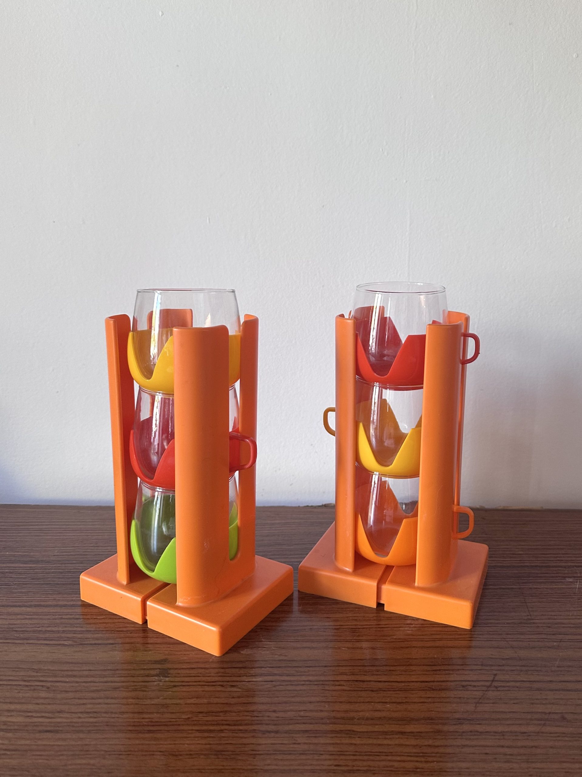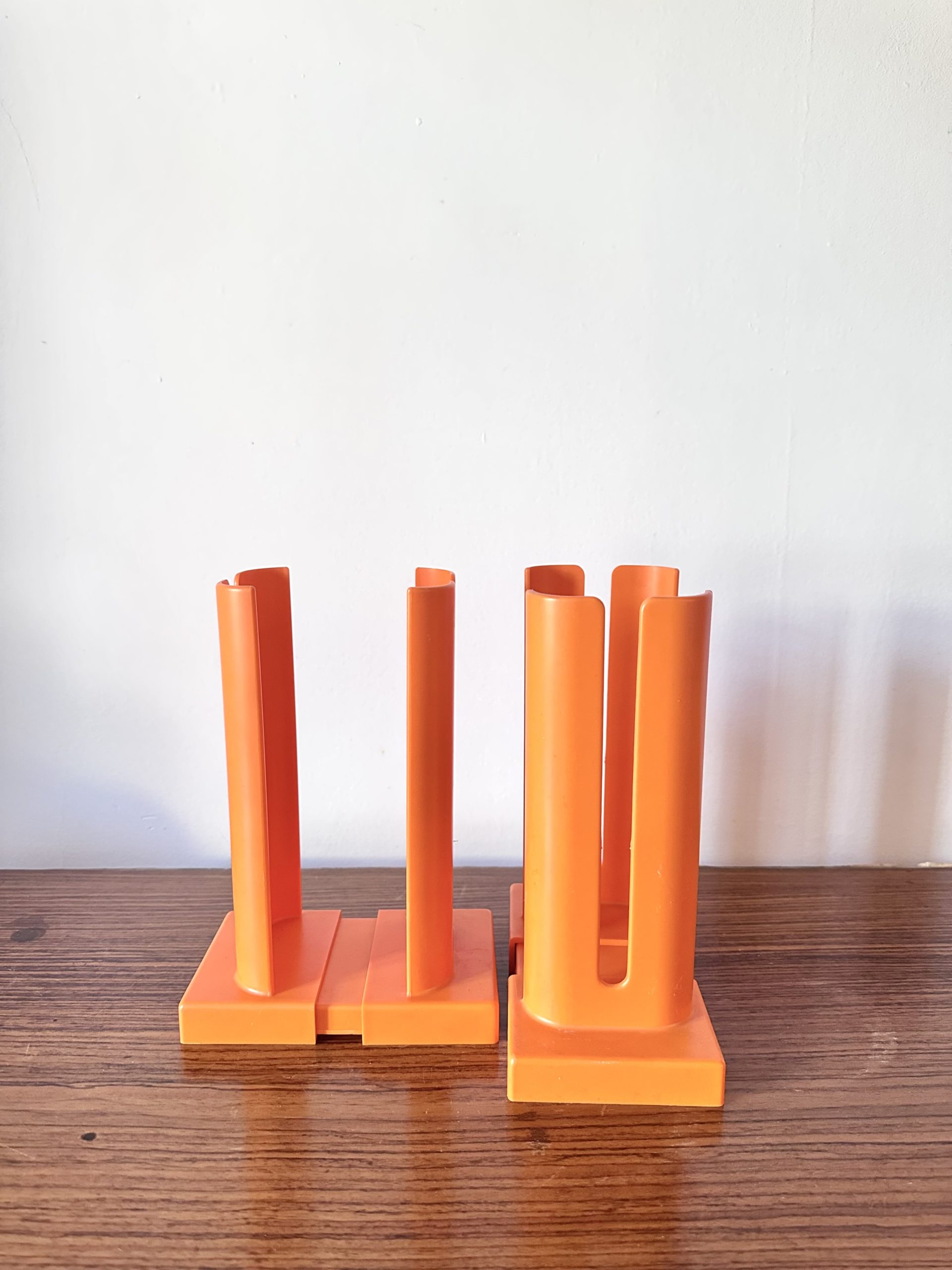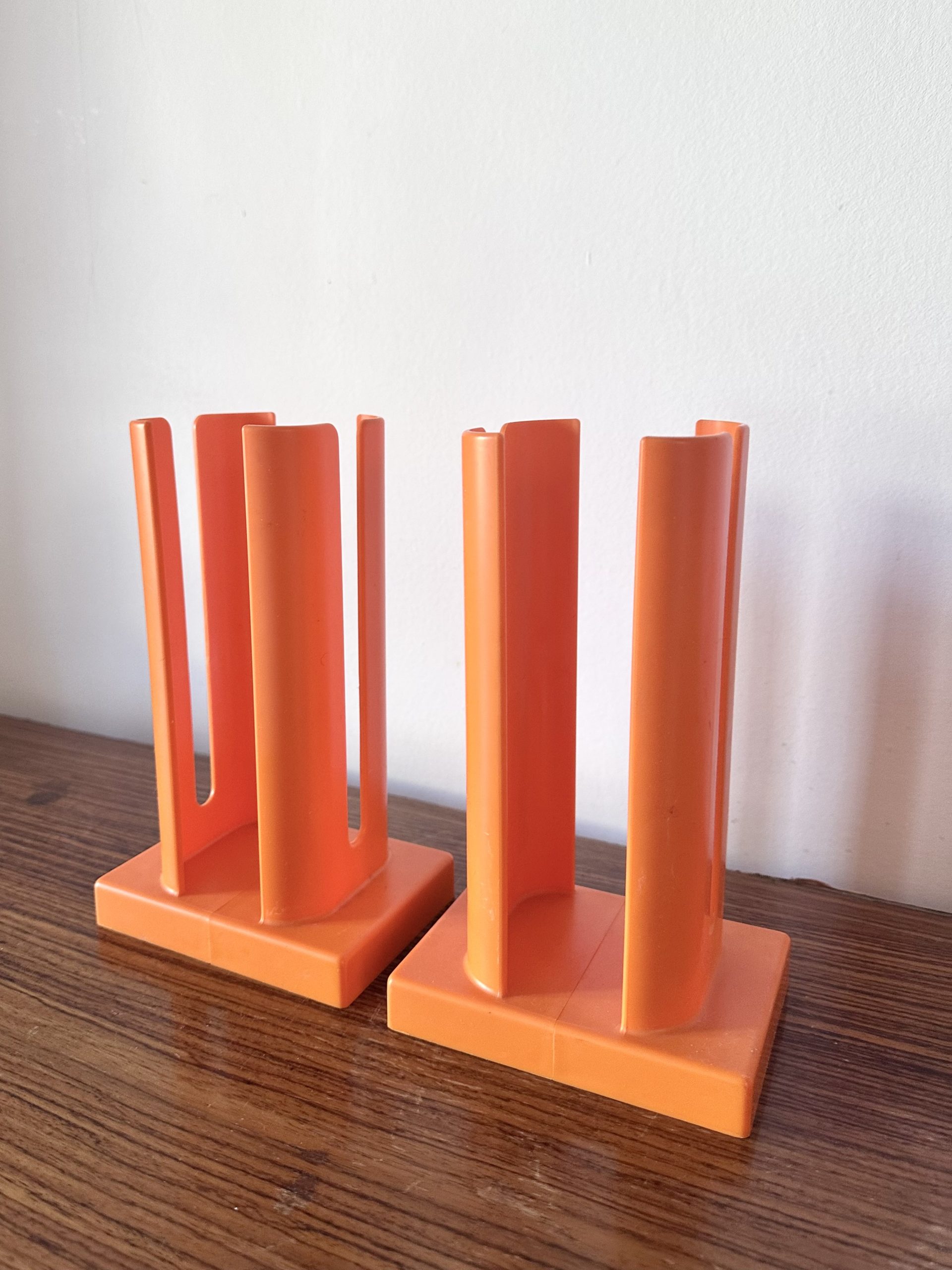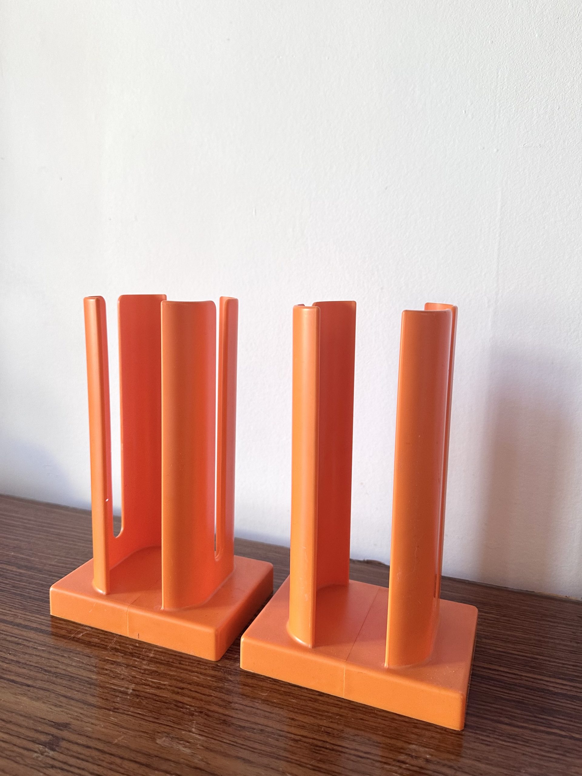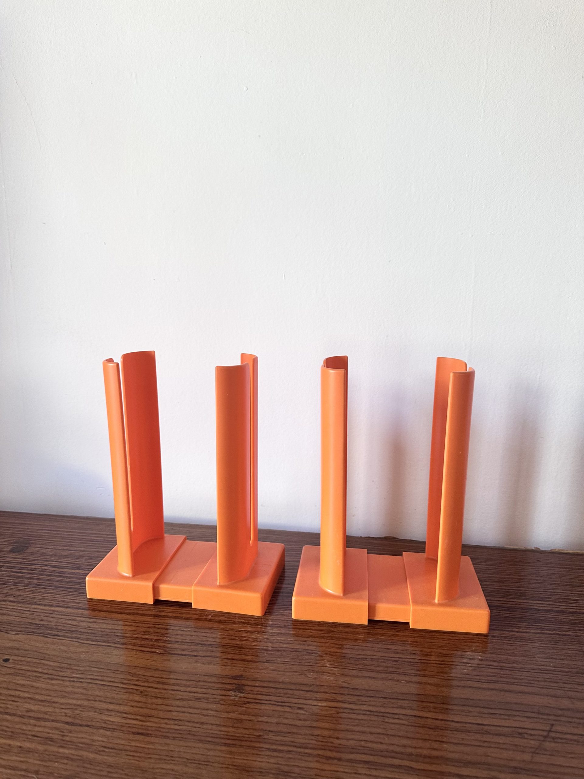 Paire de porte-tasses Schumm en plastique orange, au design Space Age typique des années 1970.