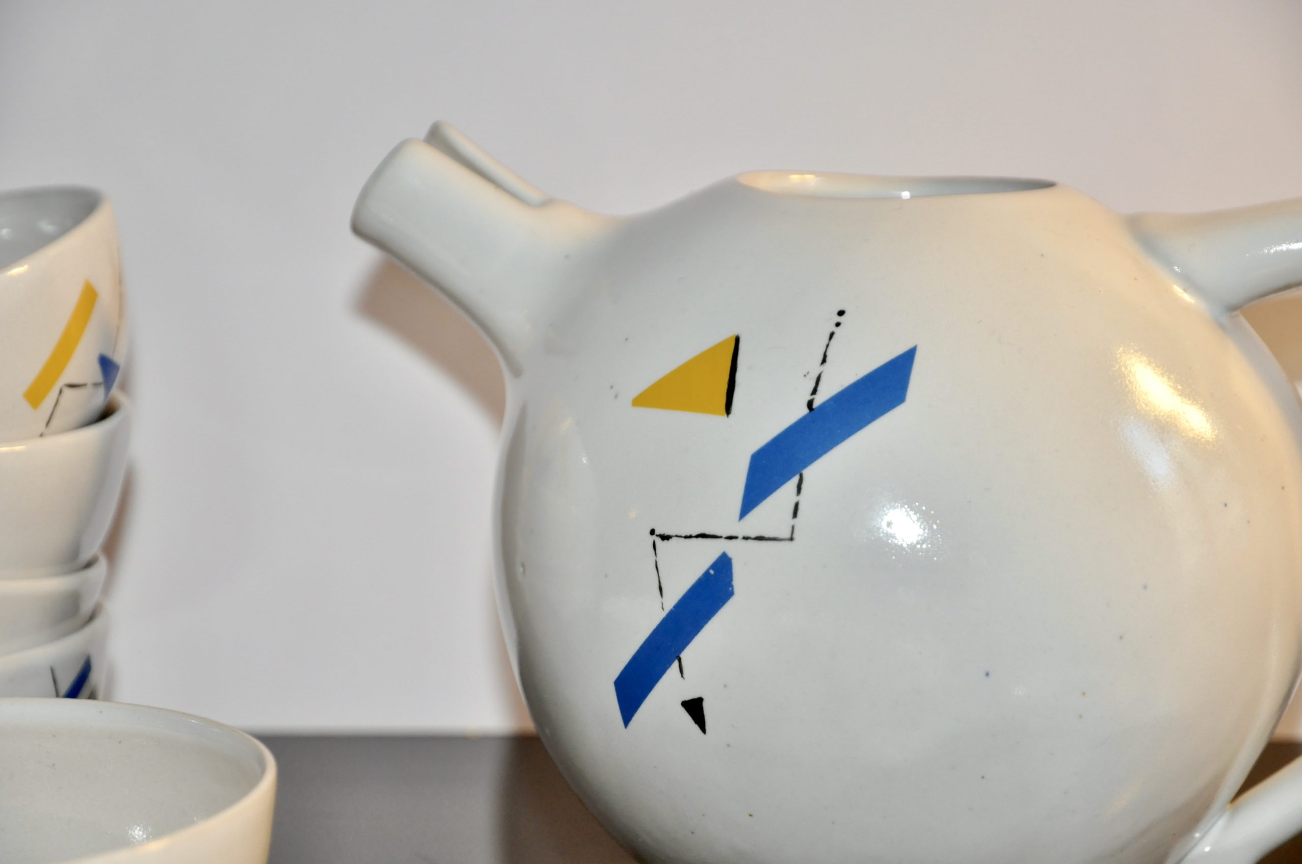Le motif rappelle les décors du style « Memphis » et se compose de rectangles et de triangles en transfert d’image posé sur un émail blanc mat.