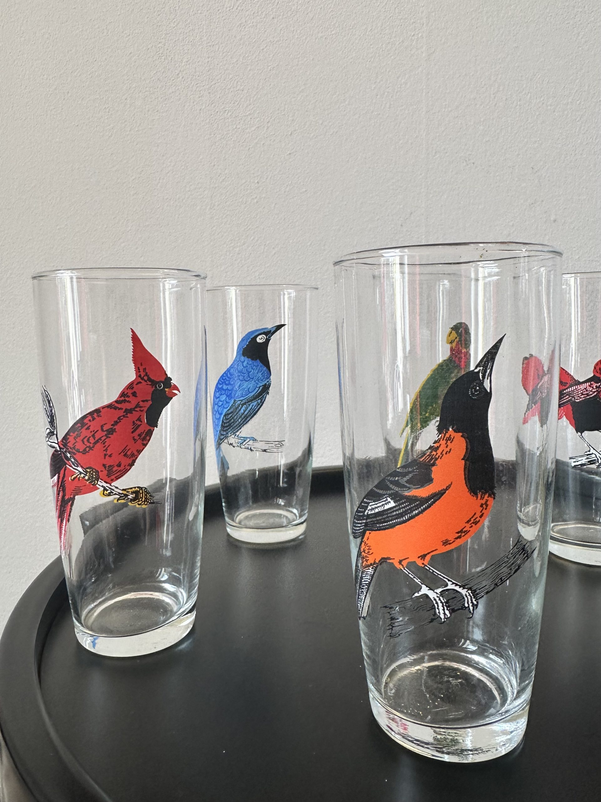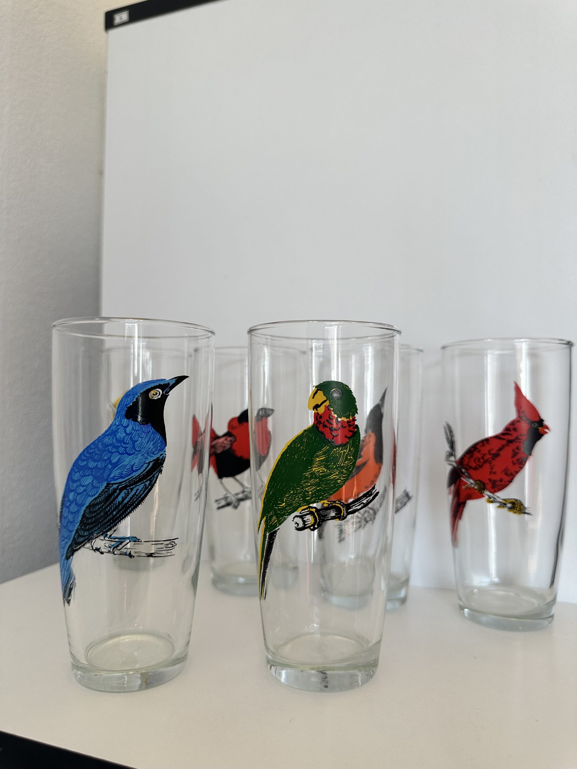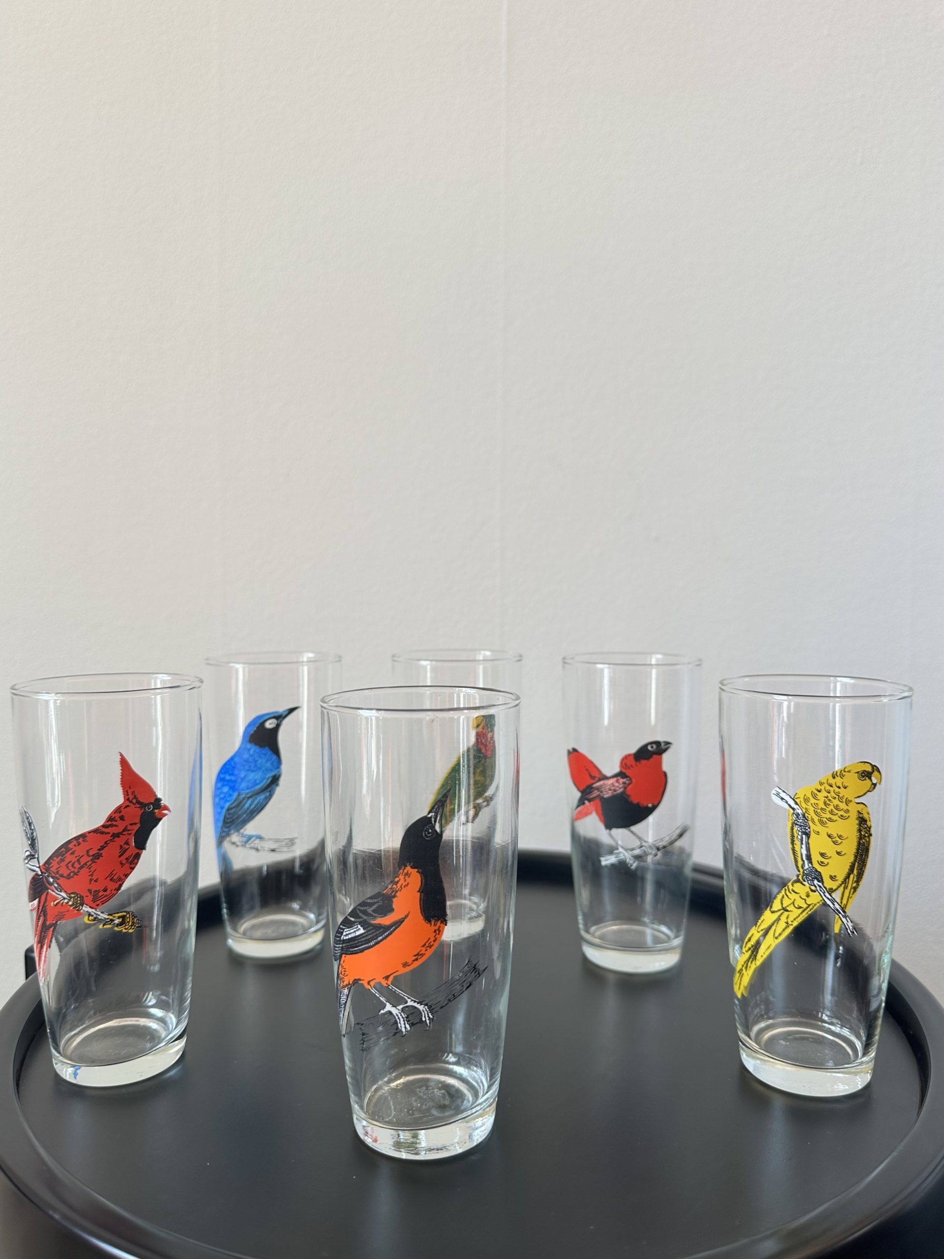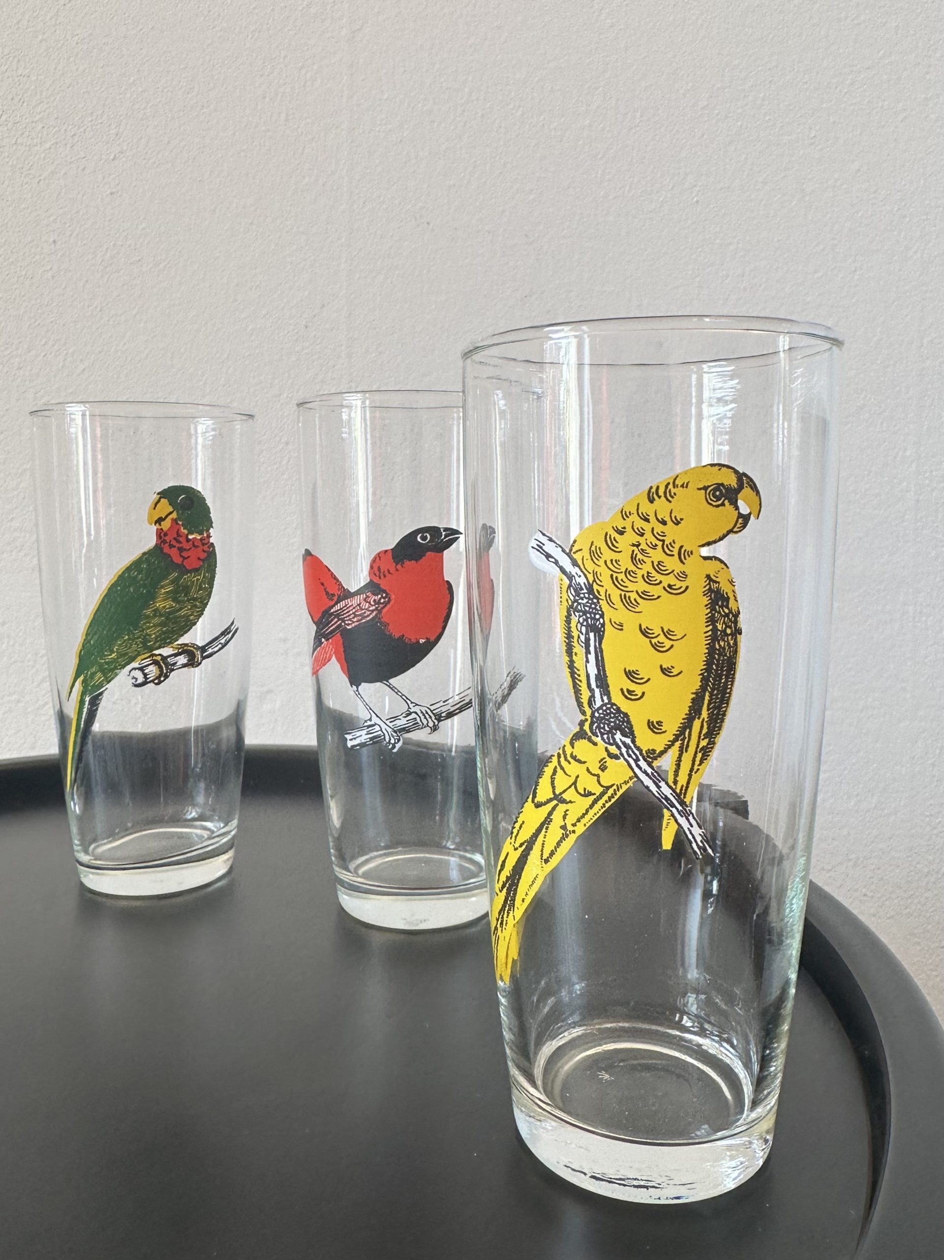 Il s’agit de 6 verres à eau des années 1950 avec des représentations d’oiseau coloré.