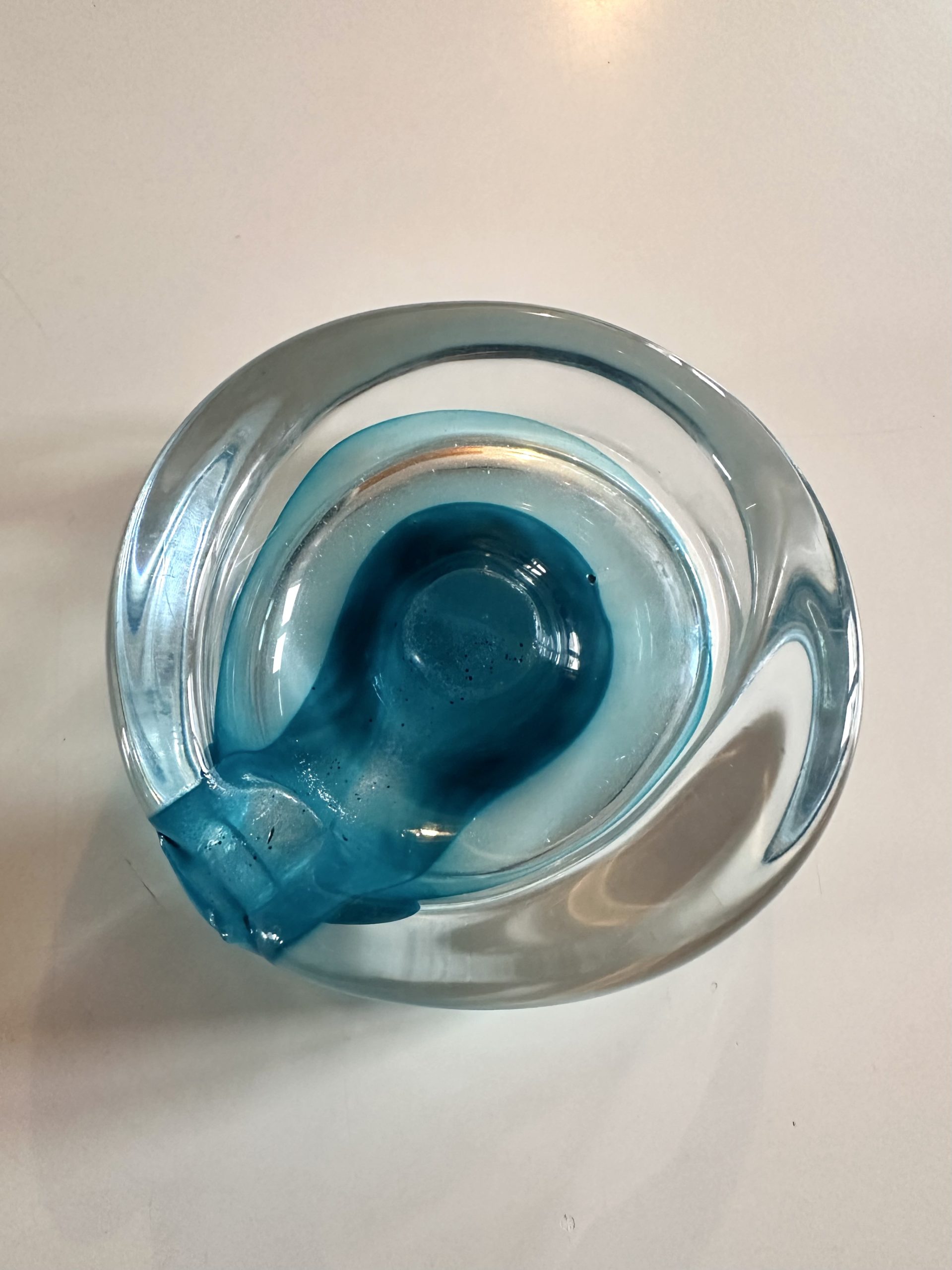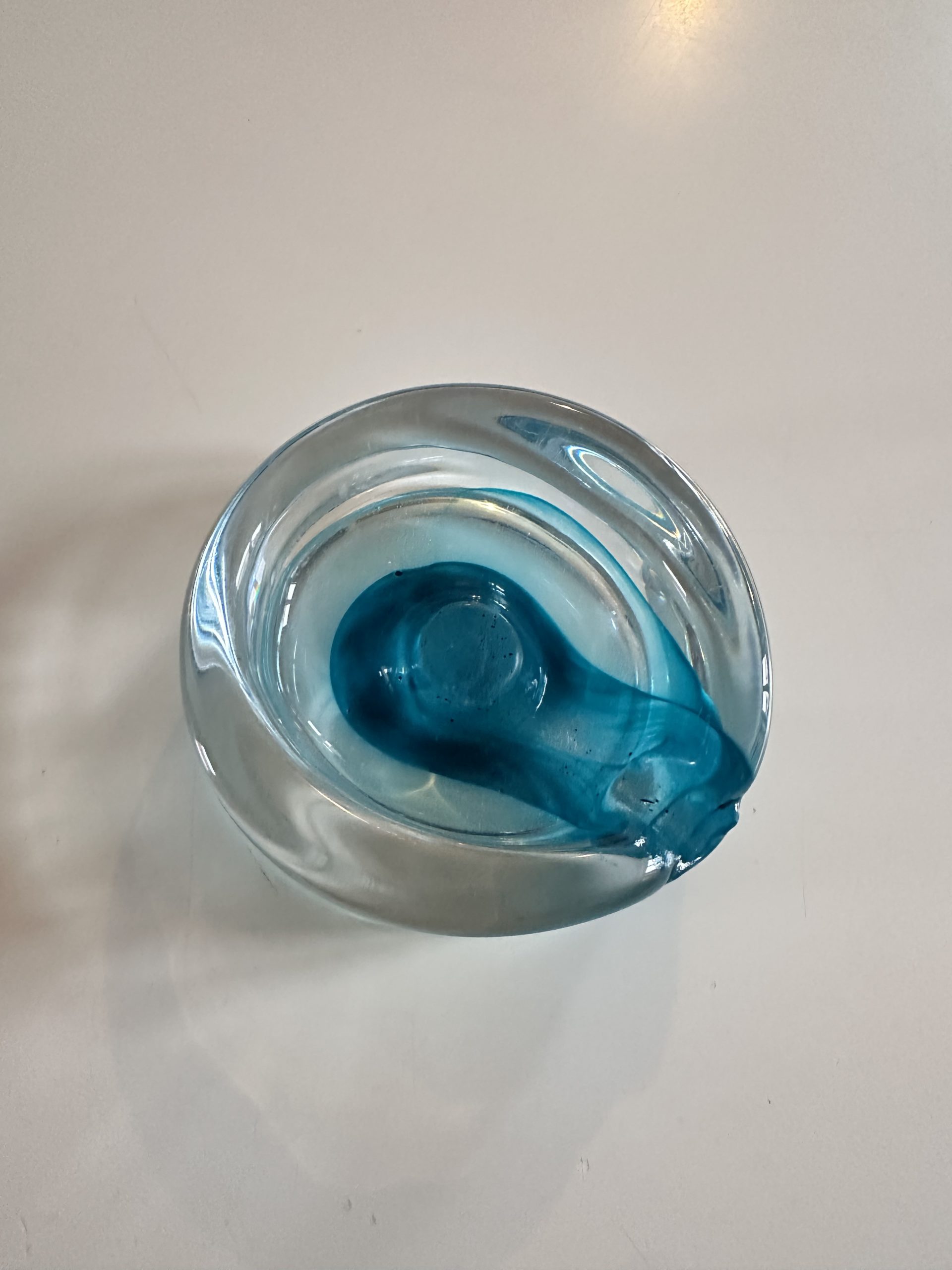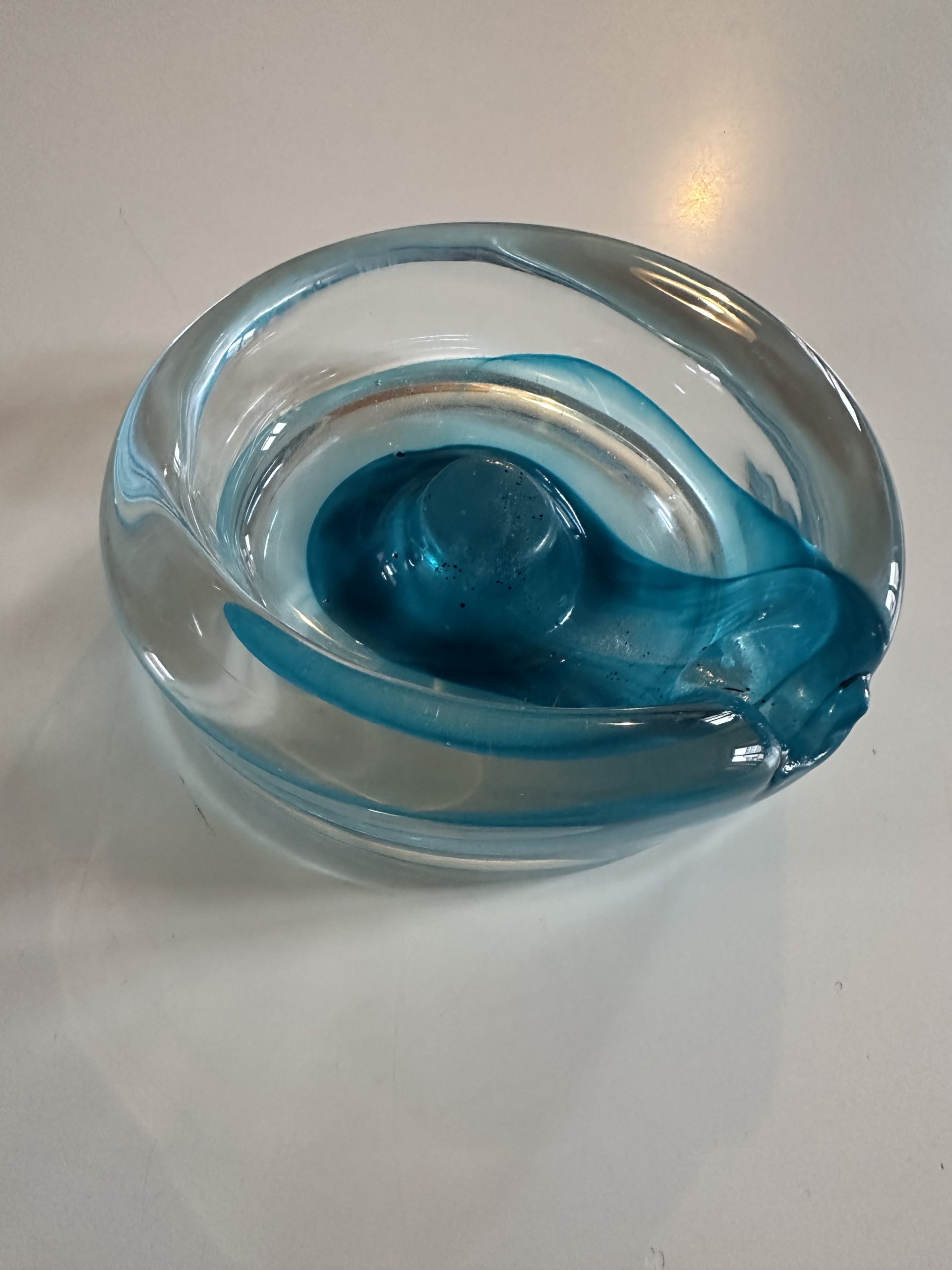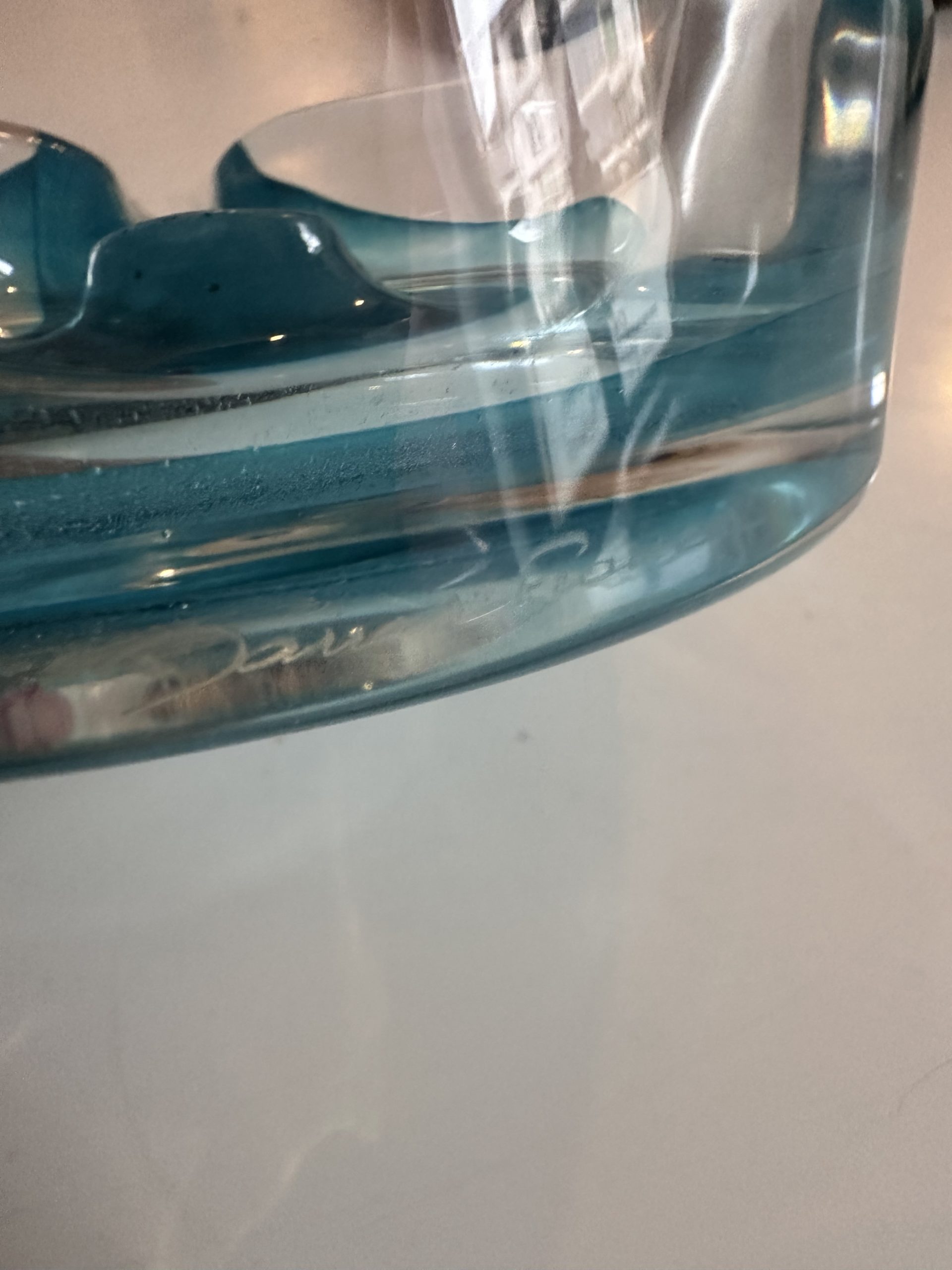 Il s’agit d’un sublime cendrier ou vide poche en cristal avec une vague de verre turquoise. Il est signé Daum France et il date des années 1970.
