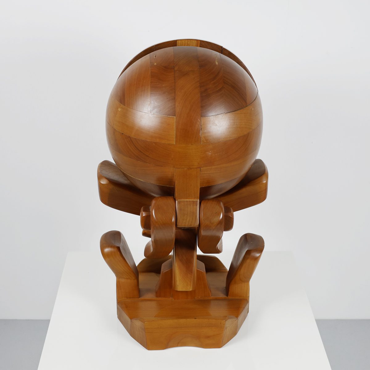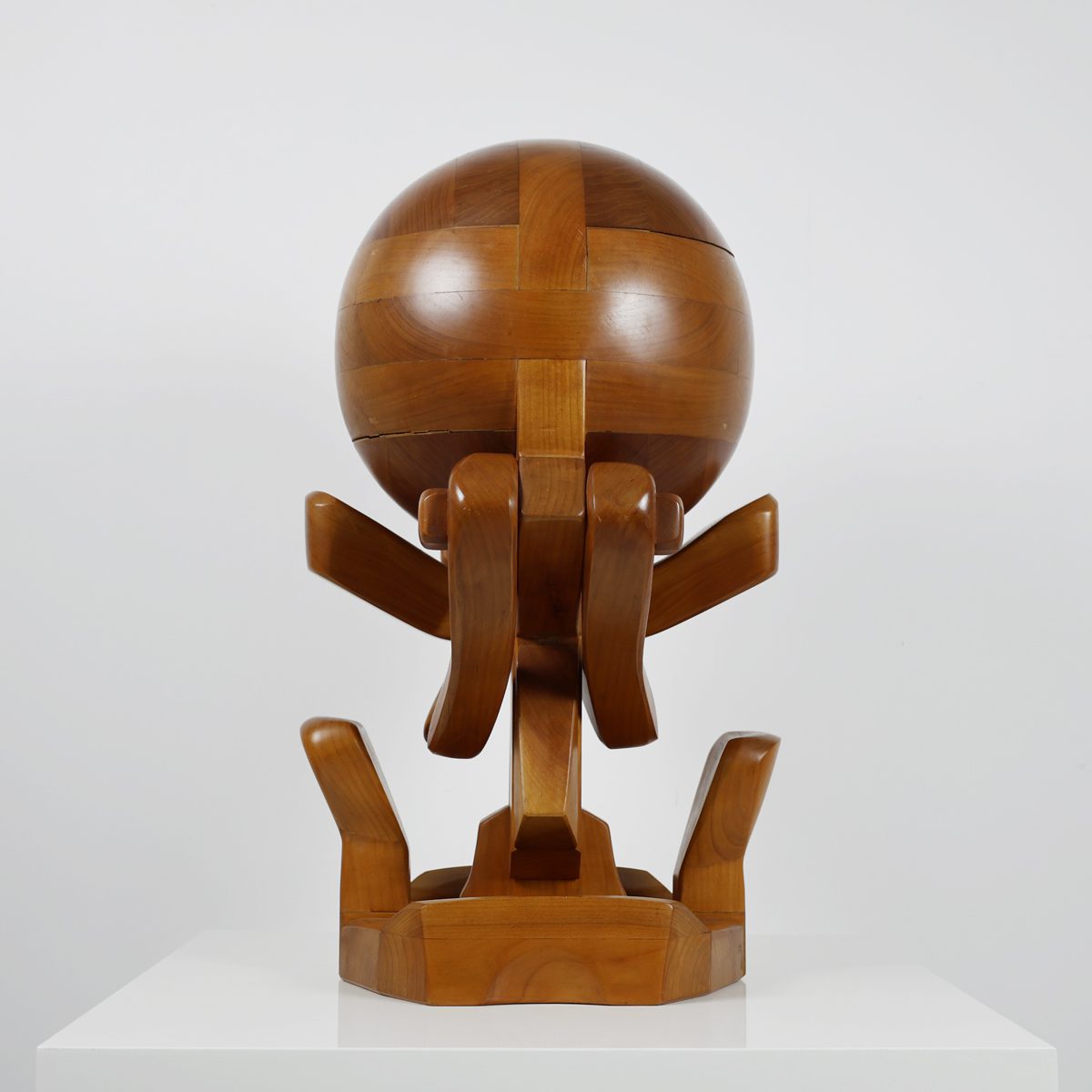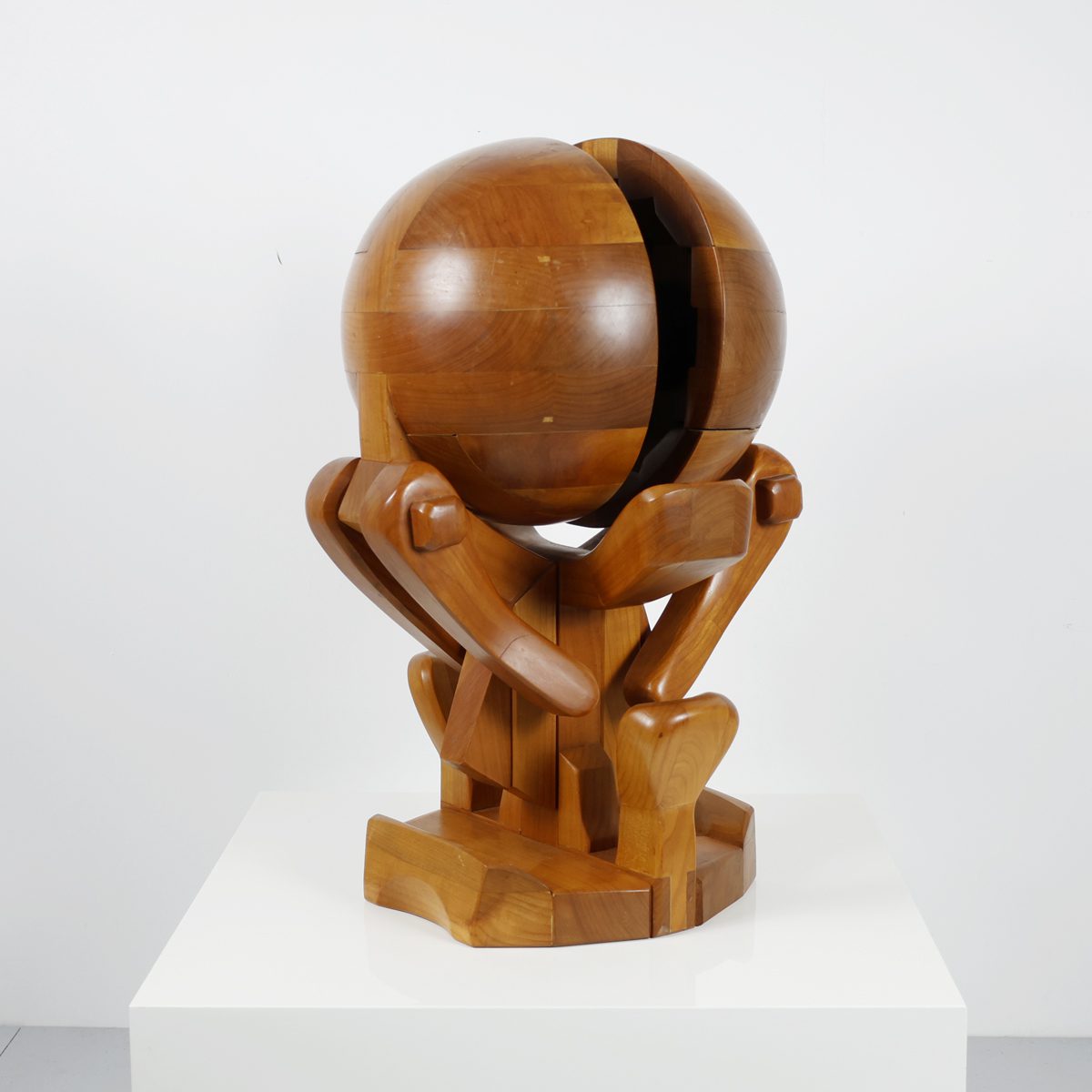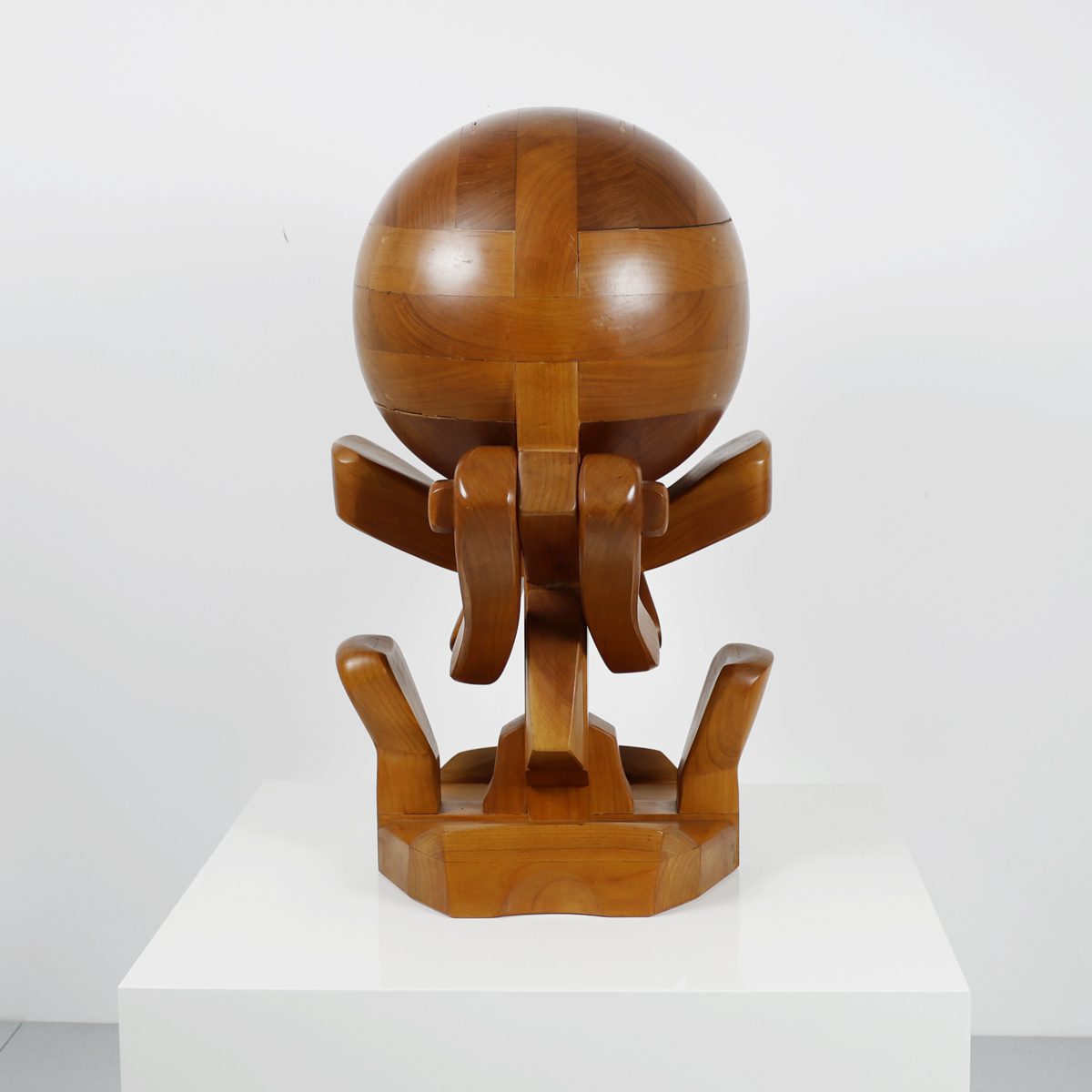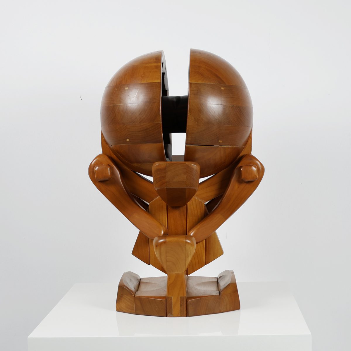 Grande sculpture en bois brutaliste de l’artiste suisse André Condé, elle est en bon état.