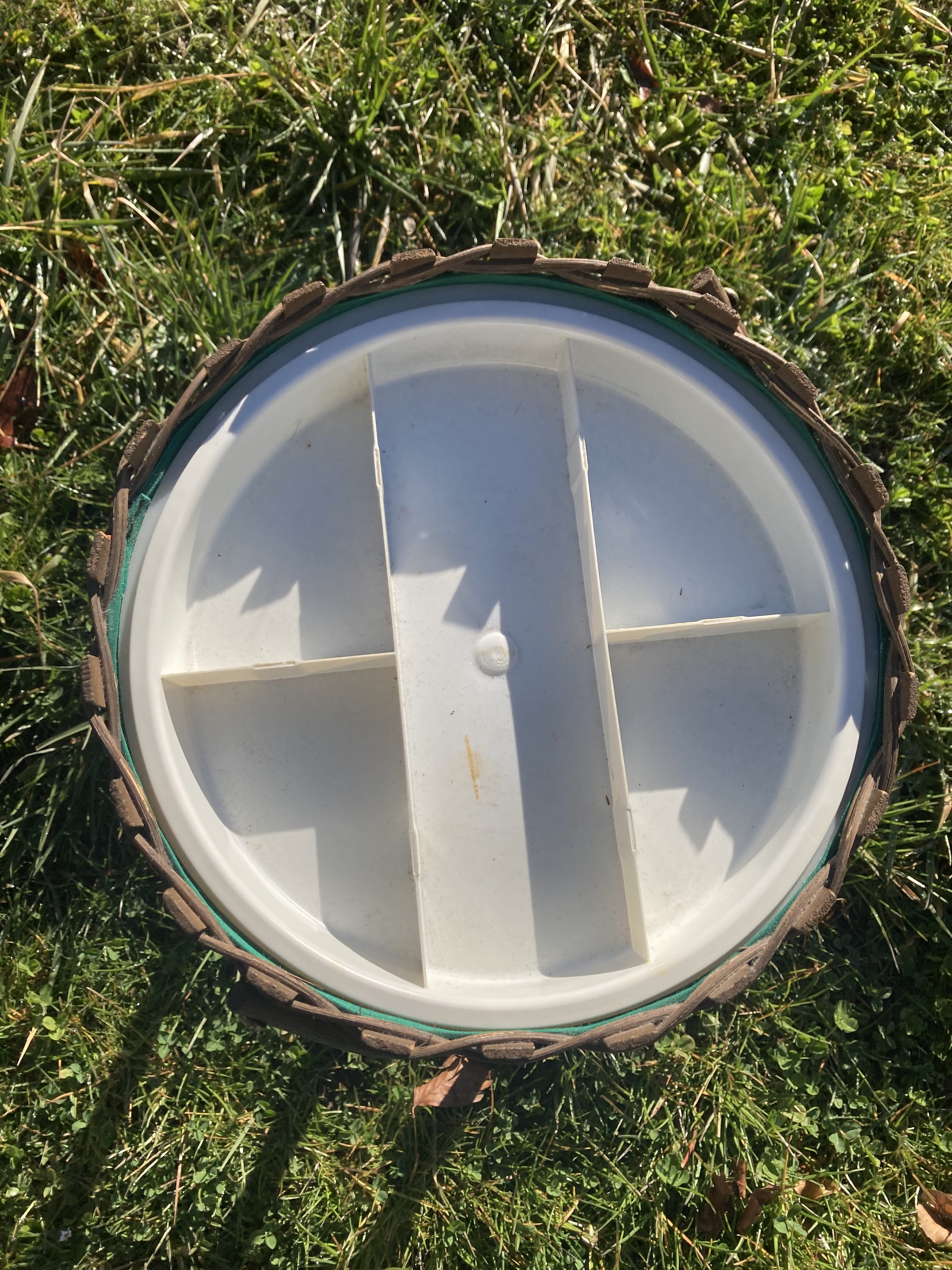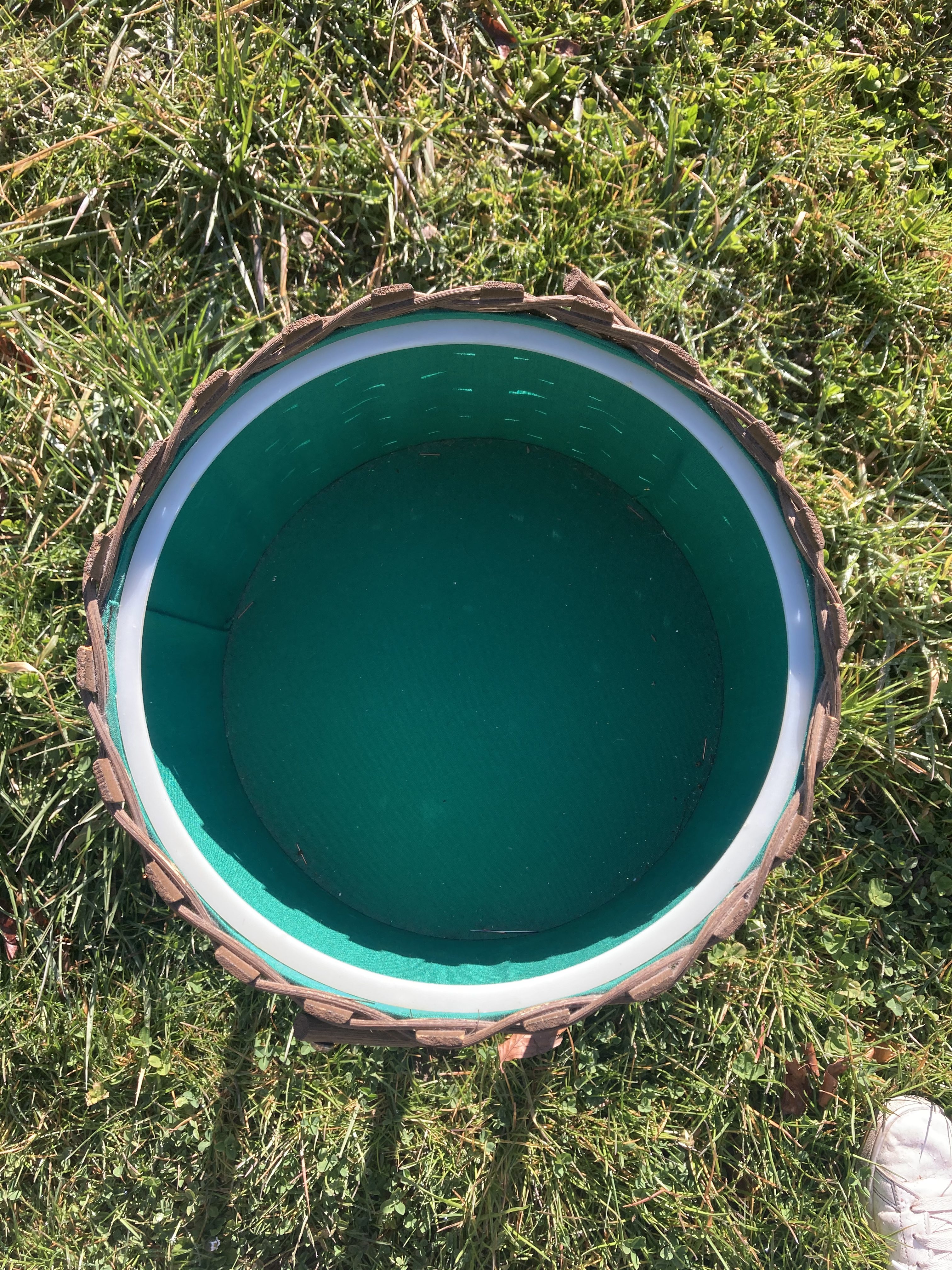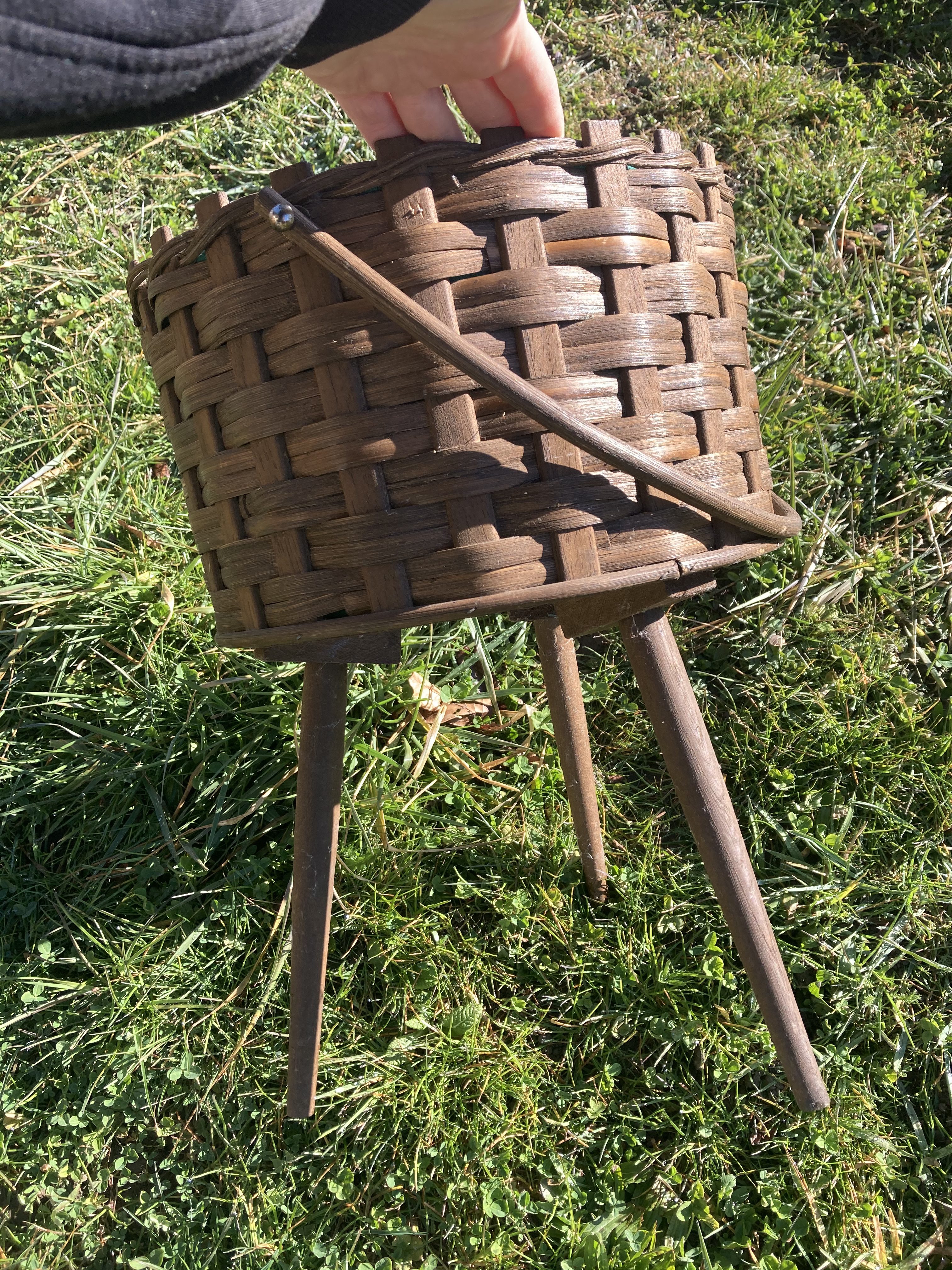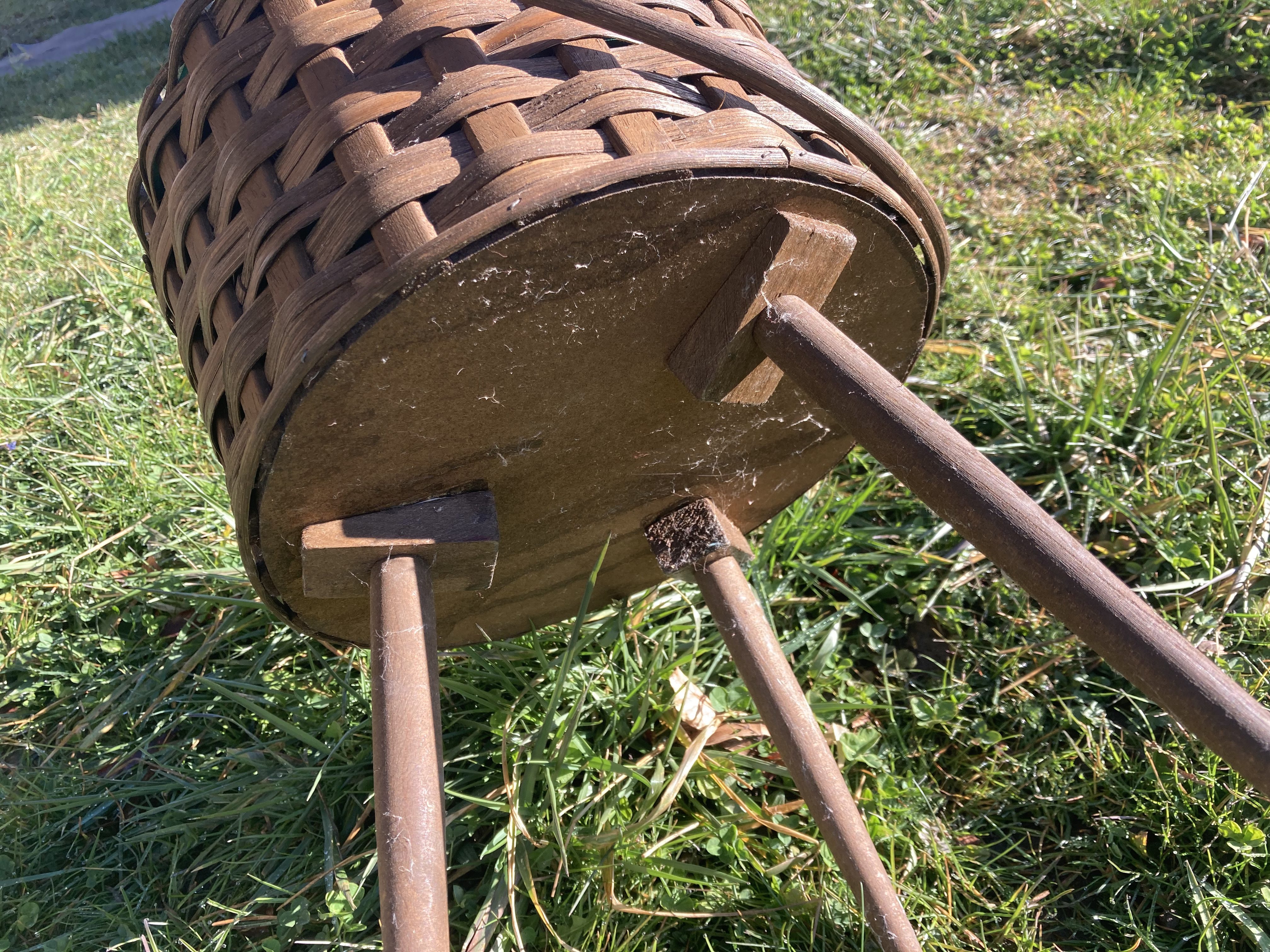 Très jolie boîte à couture ancienne sur pieds. Tressée en osier.