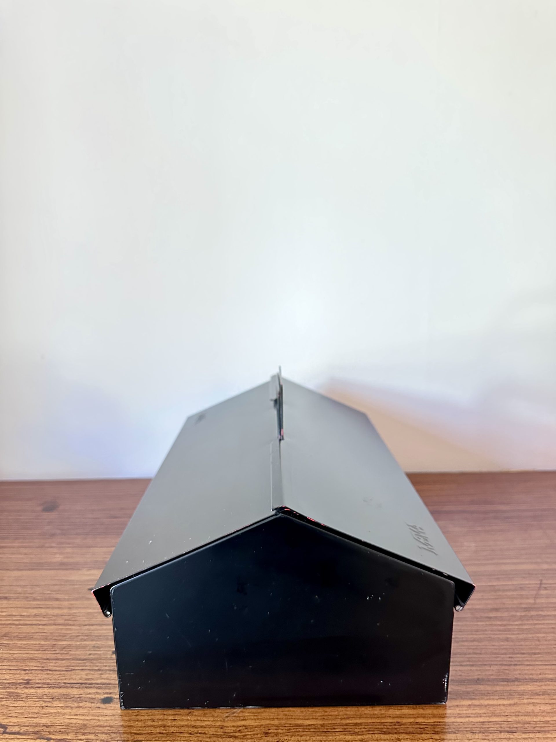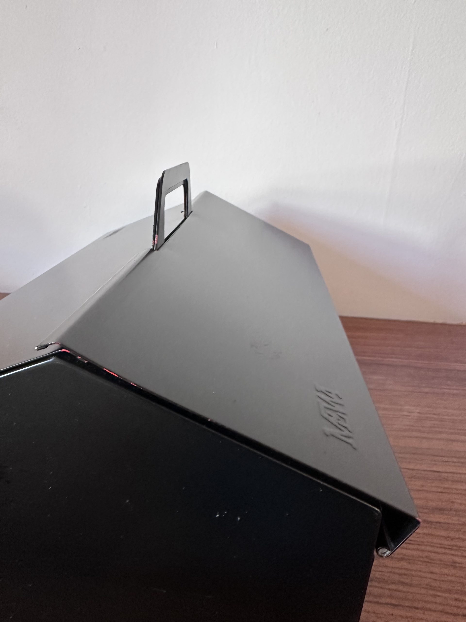 Le dessus était initialement rouge et a été repeint en noir. On aperçoit encore très légèrement la peinture rouge à certains endroits, notamment sur quelques arêtes, mais cela reste discret et la reprise a été plutôt bien faite. Ce repeint lui donne aujourd’hui une allure plus épurée et plus design.