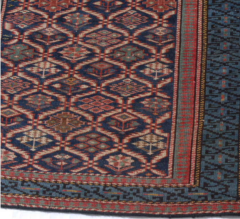 Kilim ancien d’origine à définir, du Caucase ou du Daghestan. Ce tapis, tissé à plat en laine sur laine, propose un visuel d’une grande simplicité mais fourmille de détails quand on y regarde de plus près. Réalisé avec une grande précision et des couleurs vives et sobres, ce kilim rythmé par des losanges saura donner beaucoup de chaleur dans la pièce ou il saura déposé.
