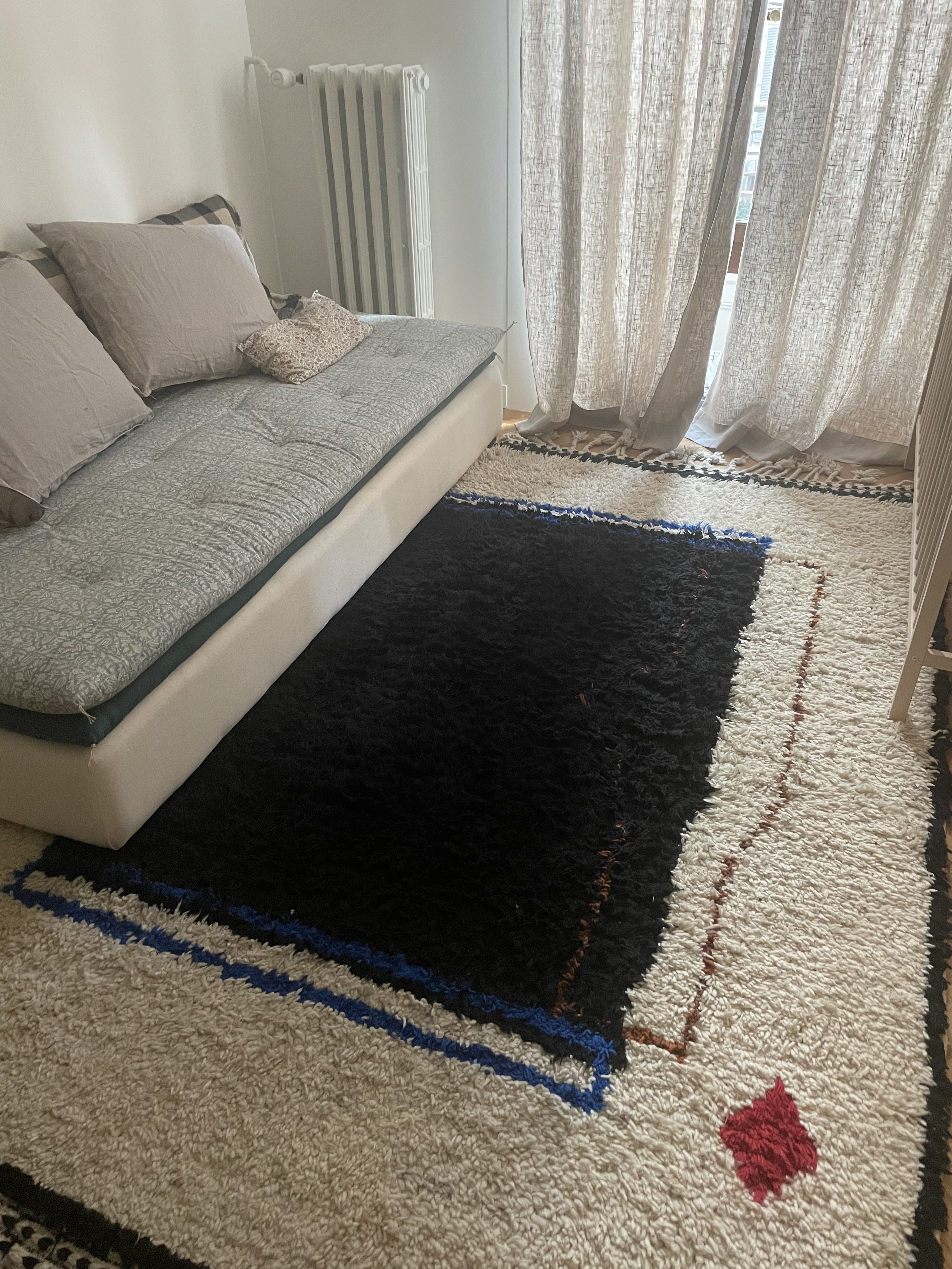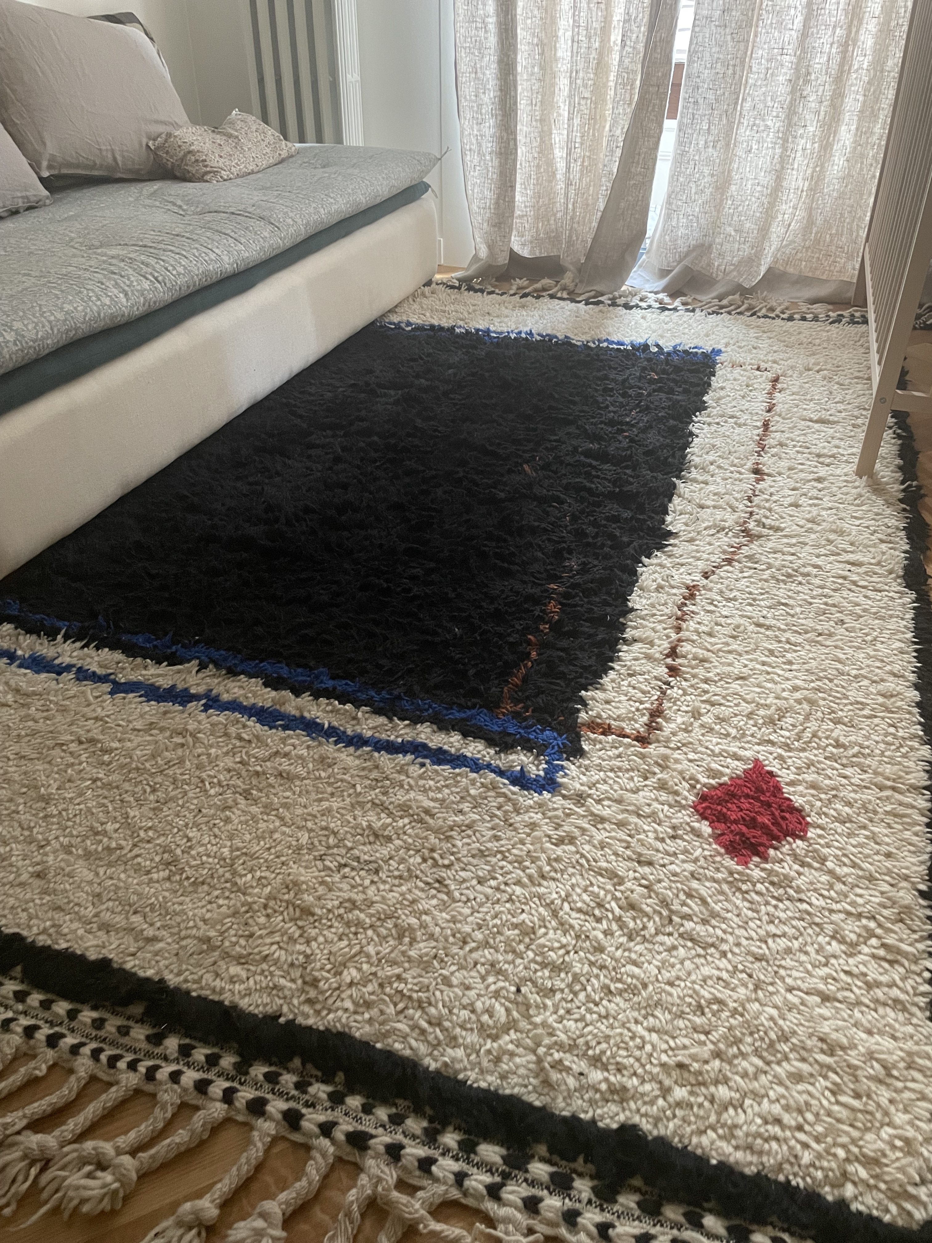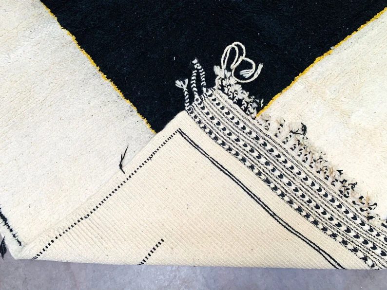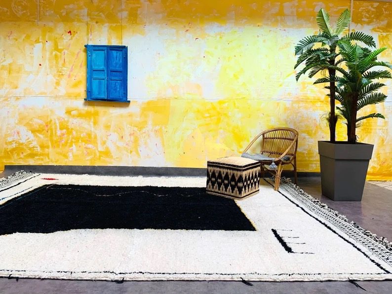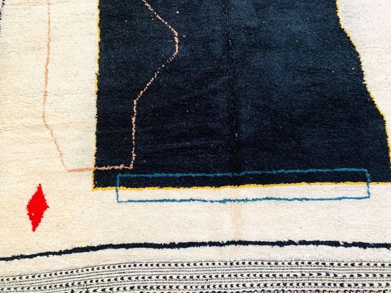 Le tapis Beni Ourain est un tapis artisanal marocain, réalisé entre le moyen Atlas et l’océan Atlantique du Maroc. Les femmes de cette région utilisaient de la laine de mouton douce et la garnissaient parfaitement de larges formes de diamants et de petits détails parfaits.
