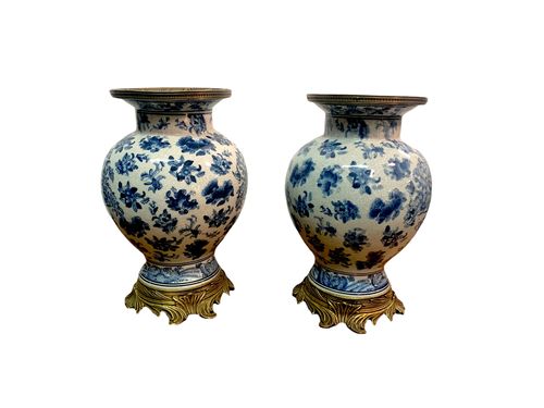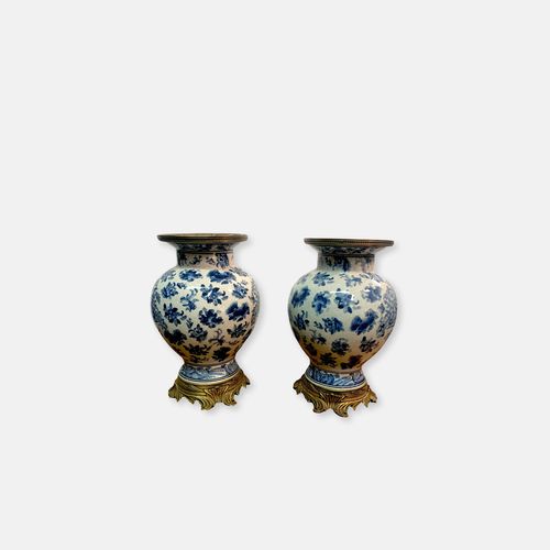 Verkauftes ProduktPaire de jarre/vase à gingembre, porcelaine bleu blanc, tête et socle en bronze.