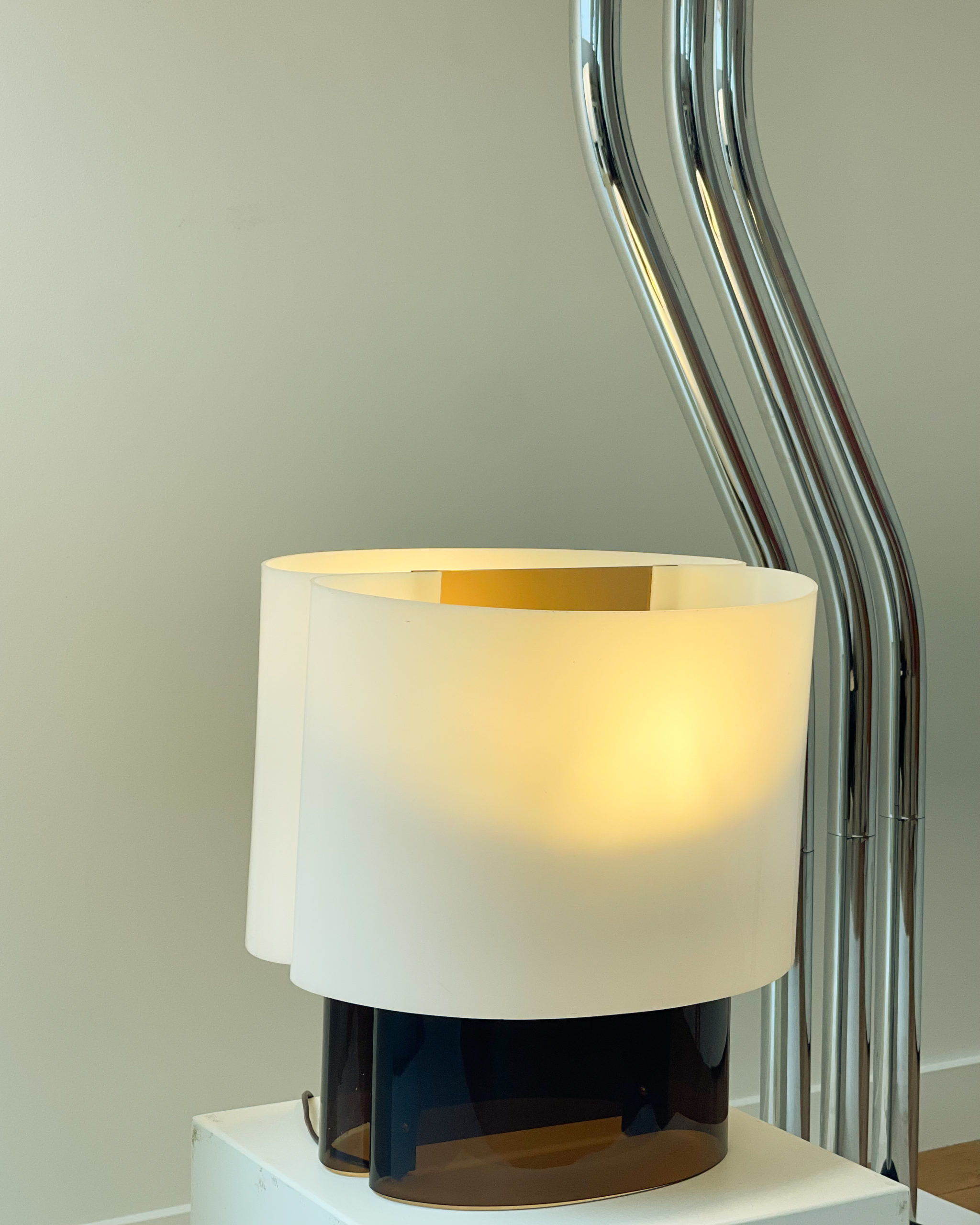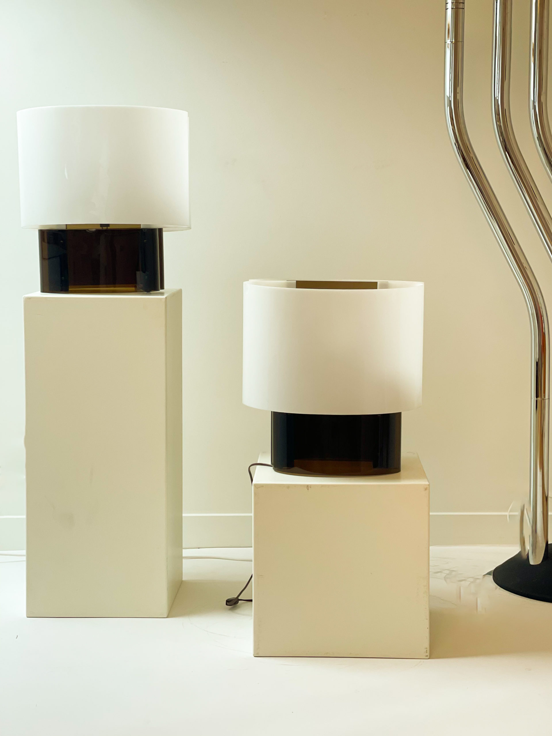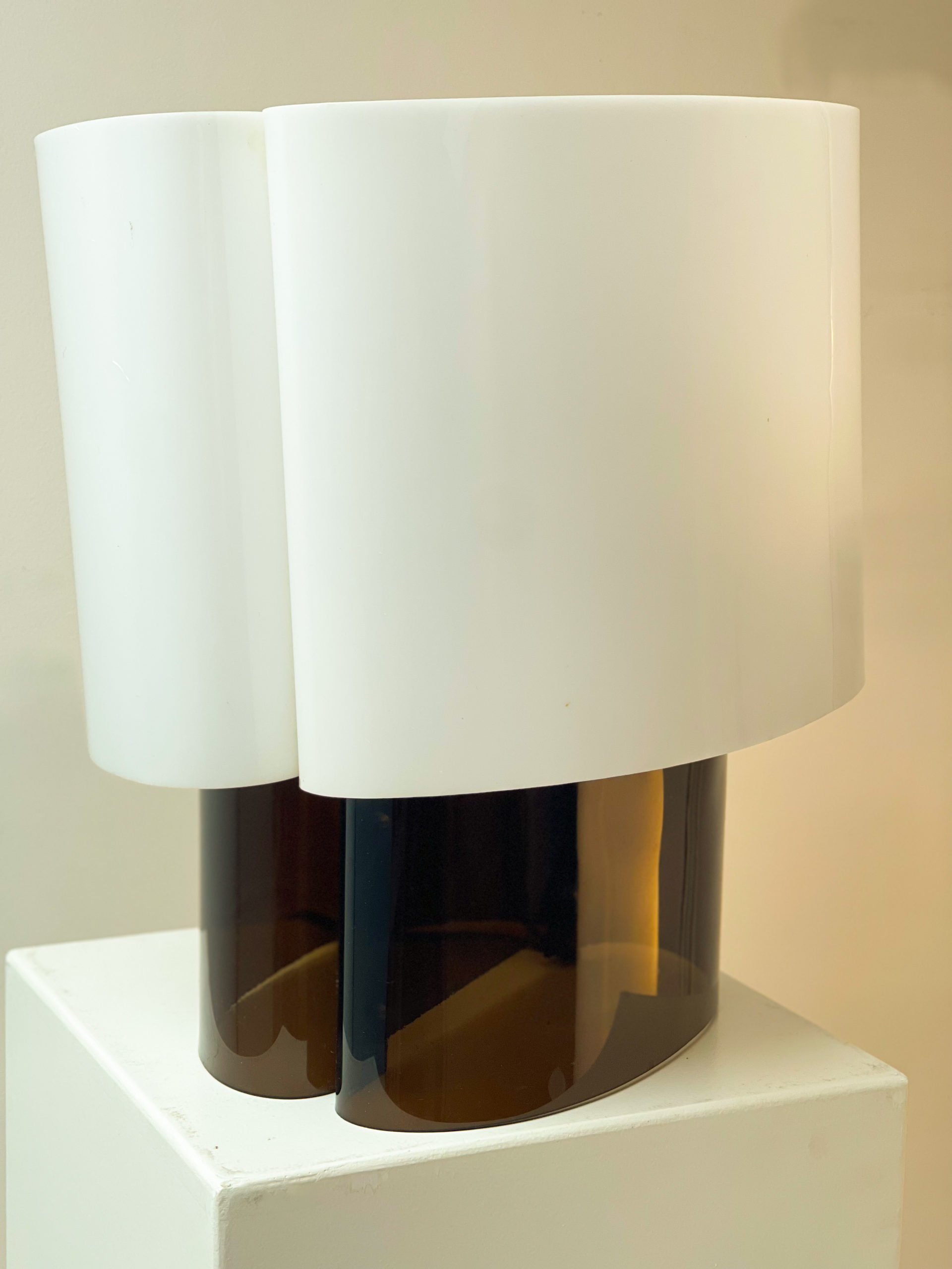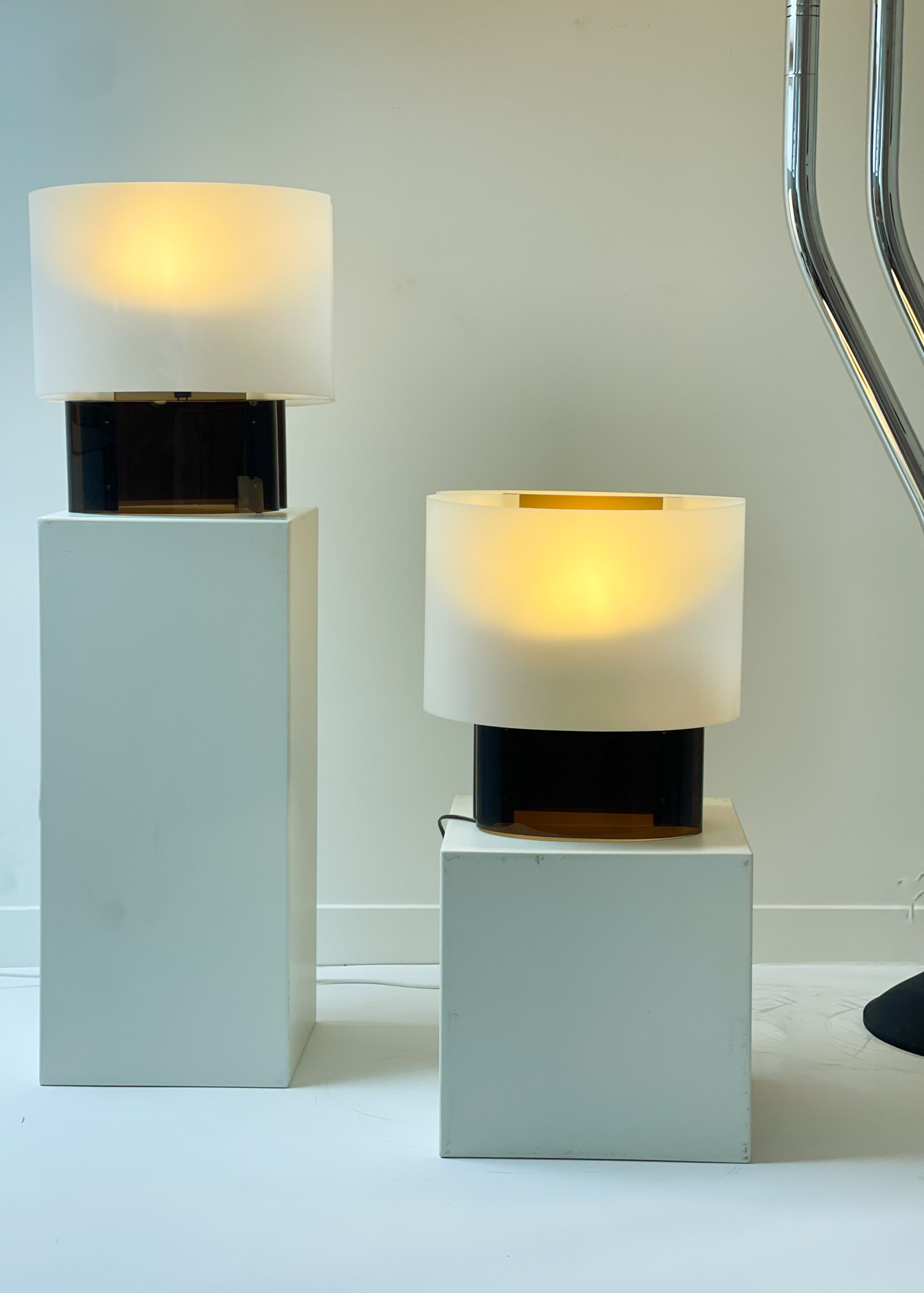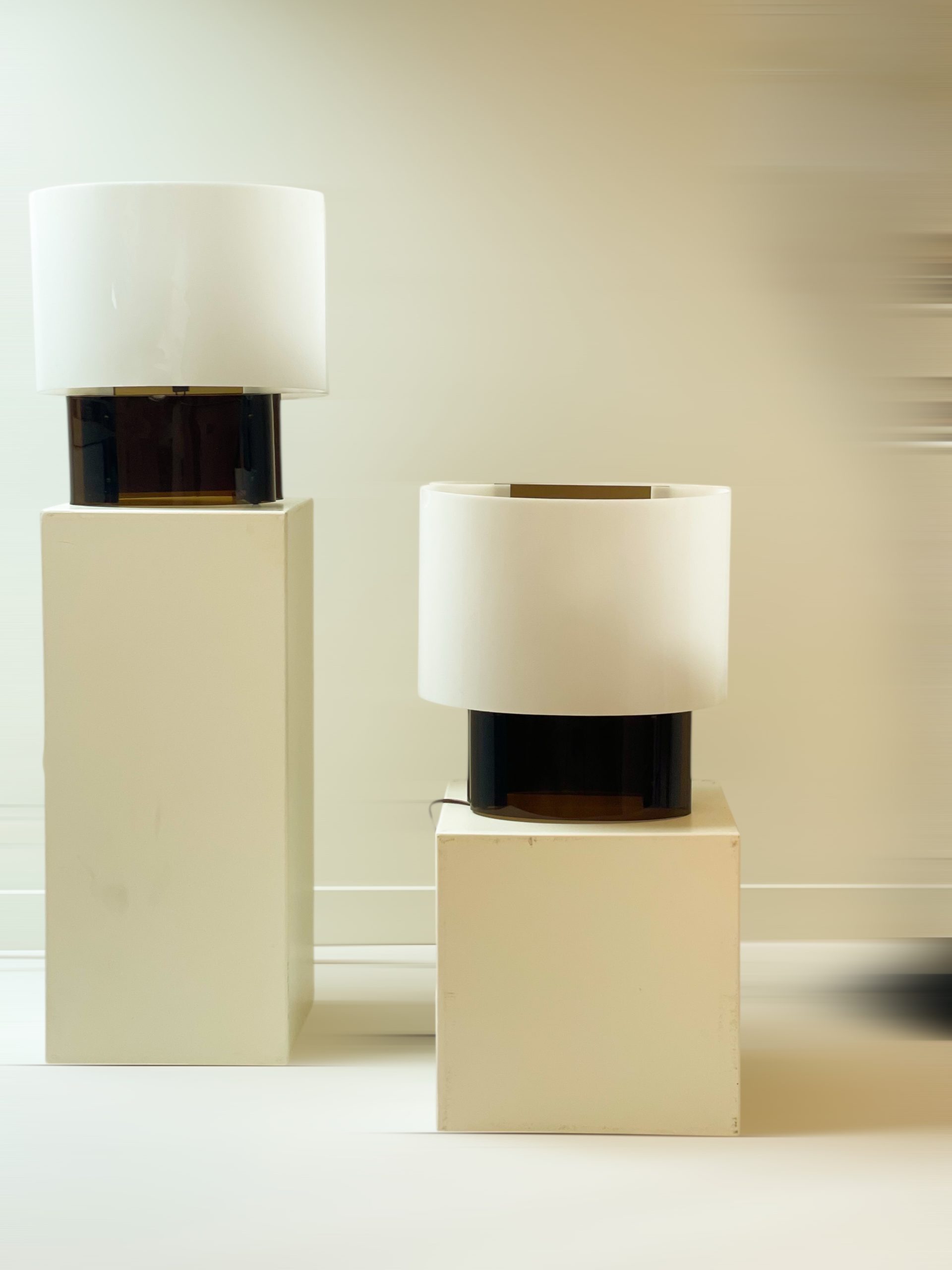 La composition repose sur un subtil jeu de volumes cylindriques superposés : une base en plexiglas fumé supporte un diffuseur en plexiglas opalin, créant un contraste élégant entre transparence sombre et douceur laiteuse.