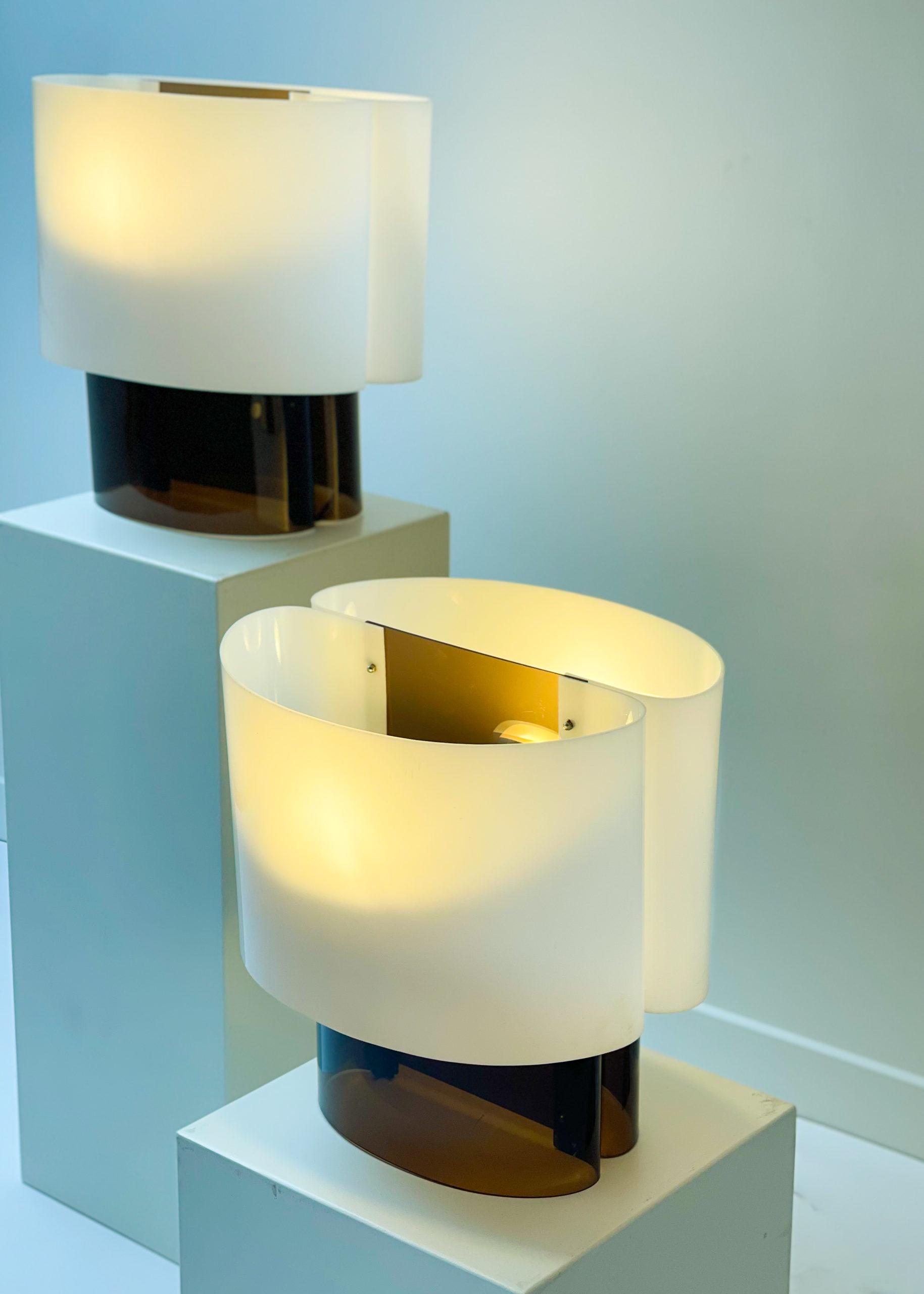 Cette majestueuse paire de lampes en plexiglas, modèle Cyclade, est une illustration remarquable du travail de Danielle Quarante.