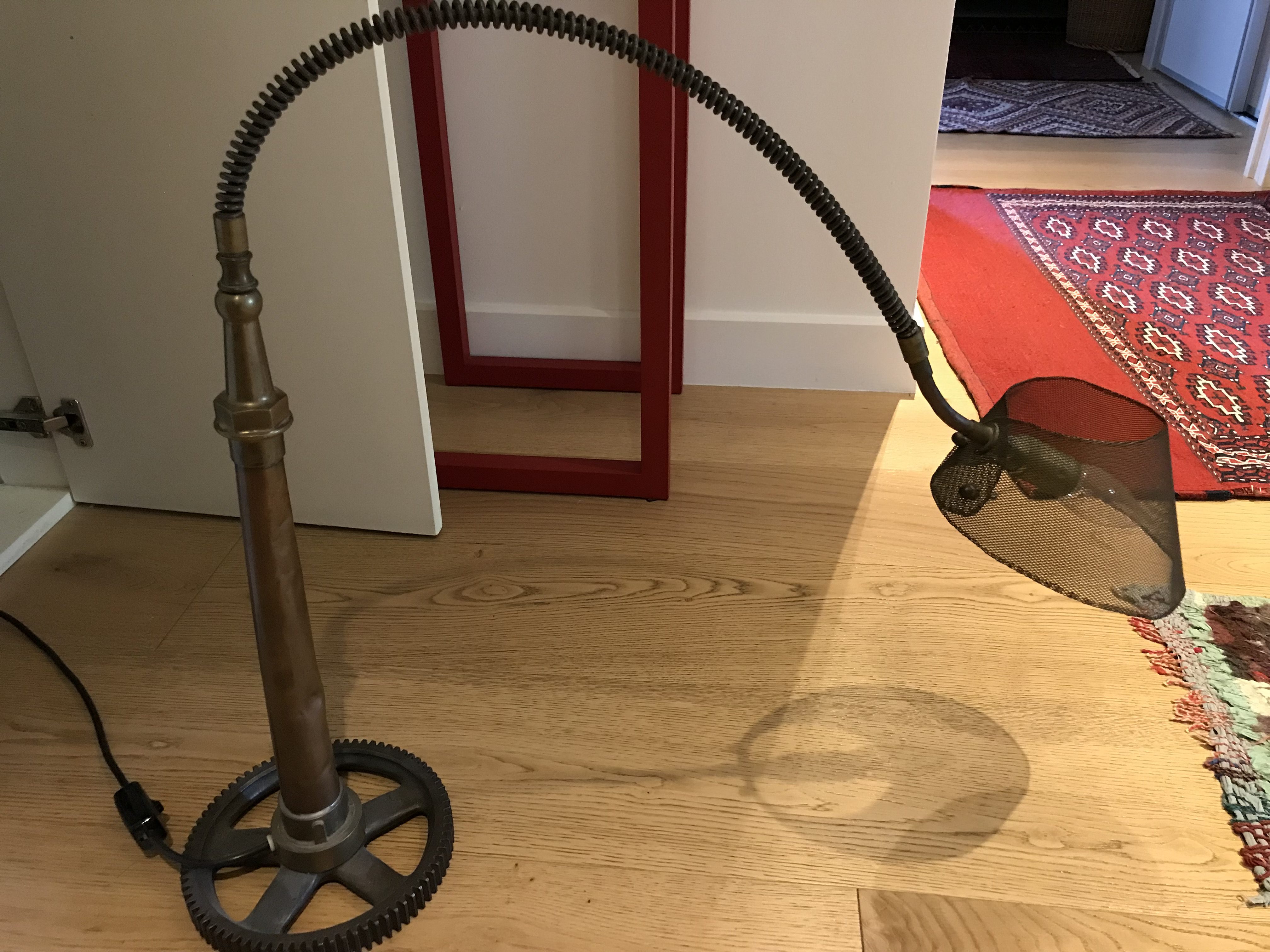 Lampe artisanale créée à partir d’une lance de pompier et de matériaux industriels. Elle est l’œuvre de l’artisan italien Walter Bonanno. Acquise en 1993. Elle a le charme de l’ancien et est tout à fait singulière. Pièce unique.