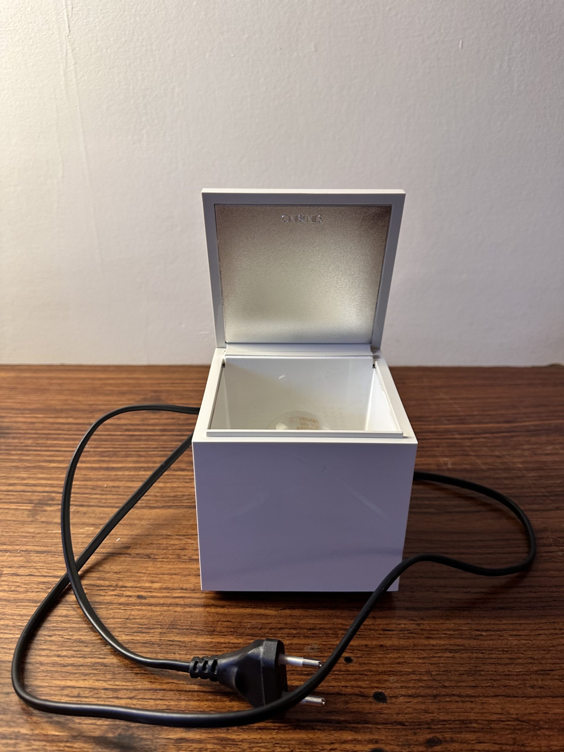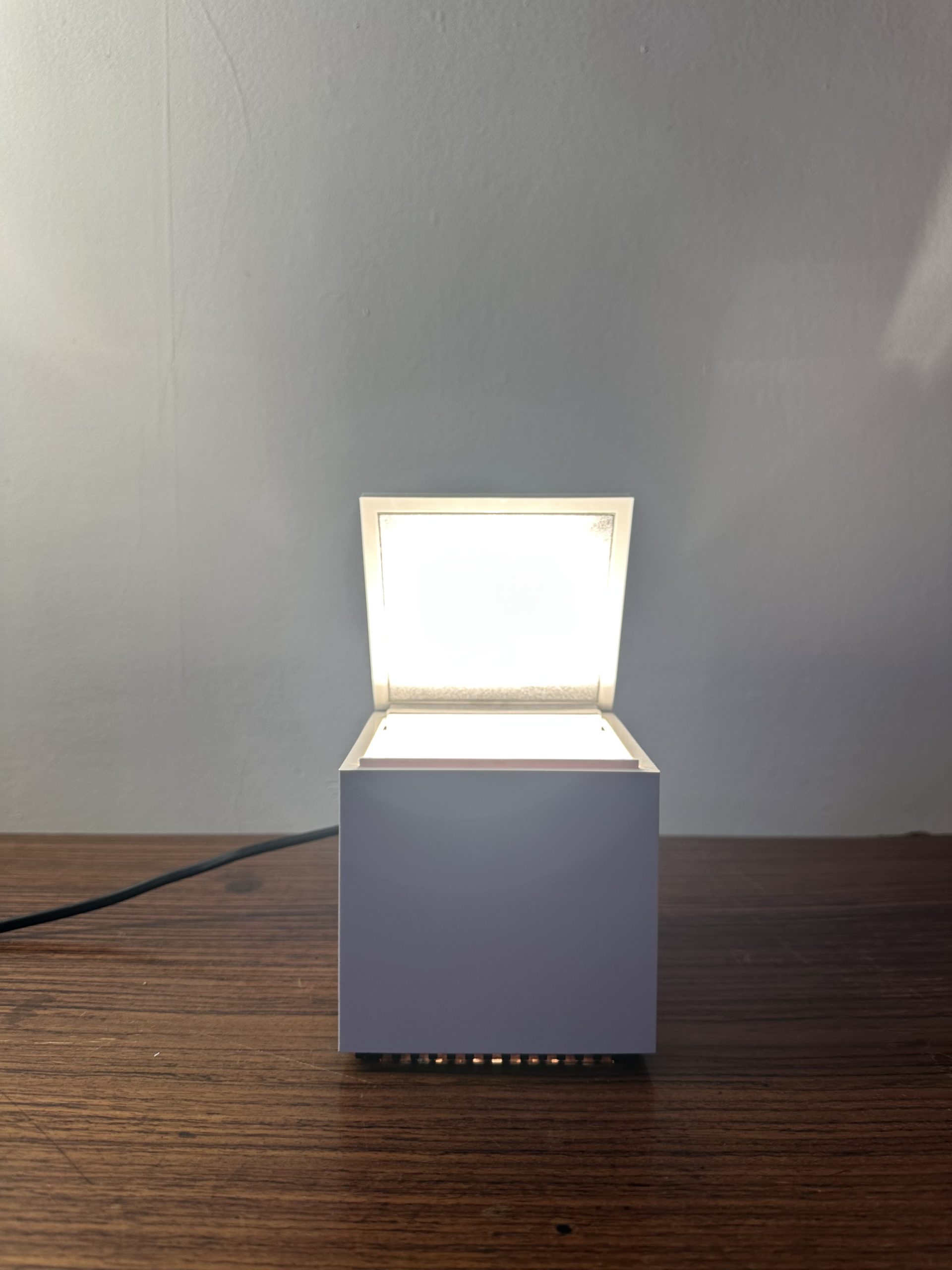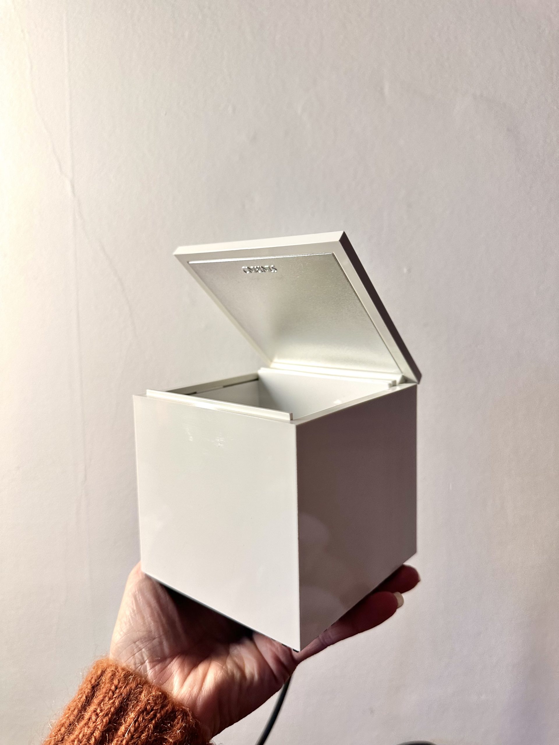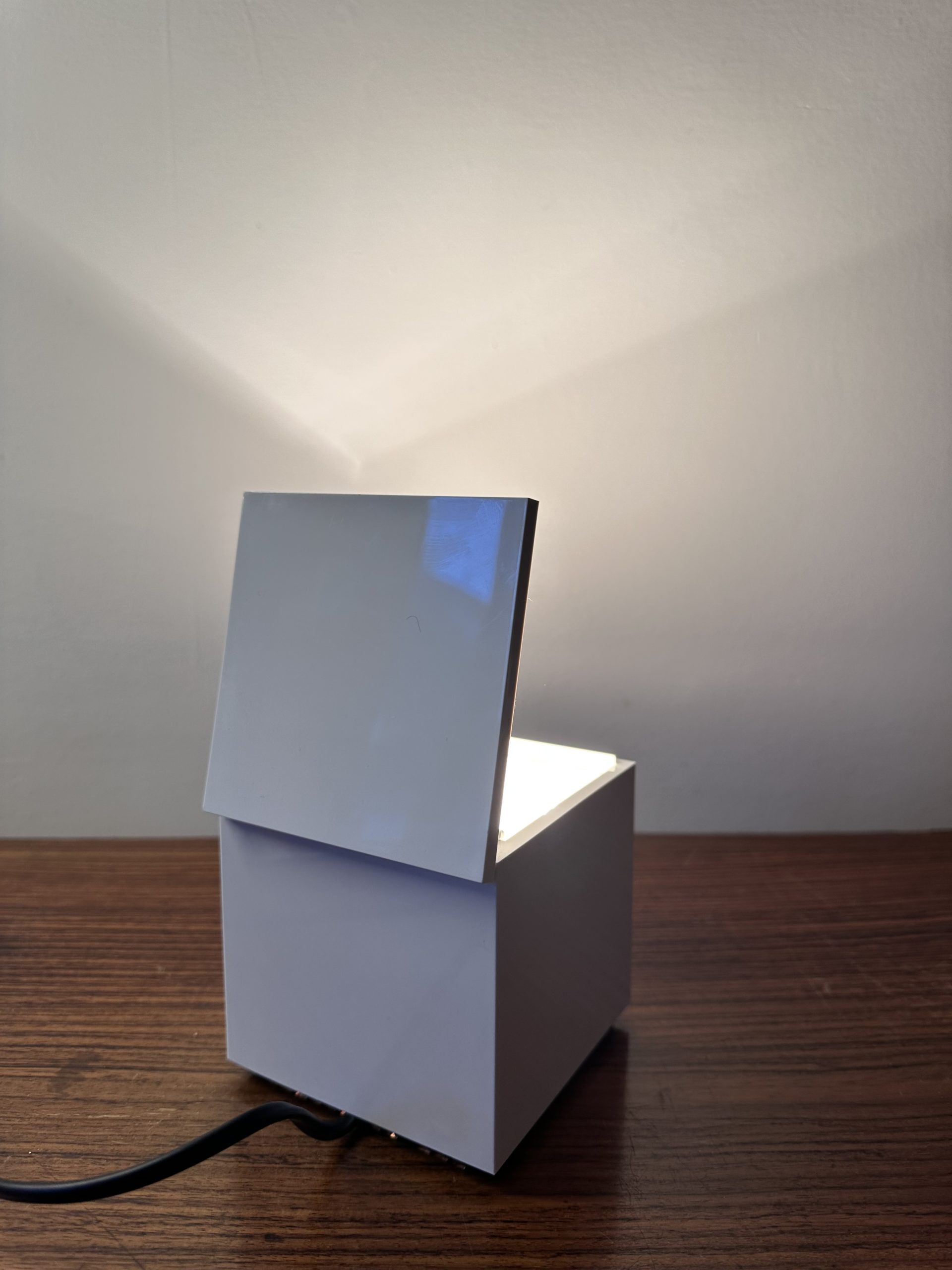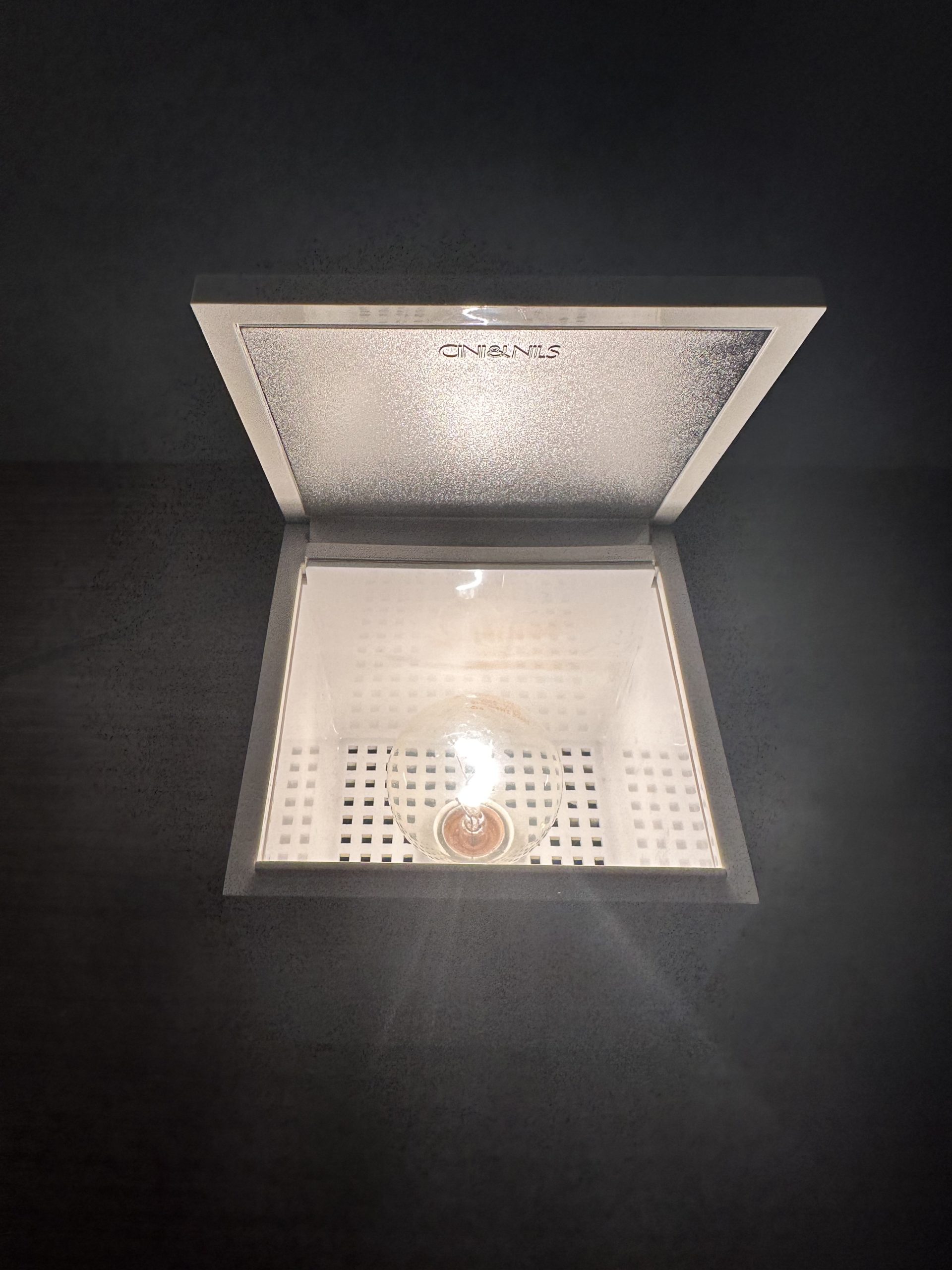 Cette lampe au design cubique se transforme en un petit écrin de lumière. Il suffit de soulever le couvercle pour éveiller la lampe et d’un simple geste pour l’éteindre en la refermant. Le réflecteur intérieur, modulable, diffuse la lumière avec douceur, créant une ambiance chaleureuse et enveloppante, idéale pour le chevet ou pour illuminer délicatement un coin de pièce.