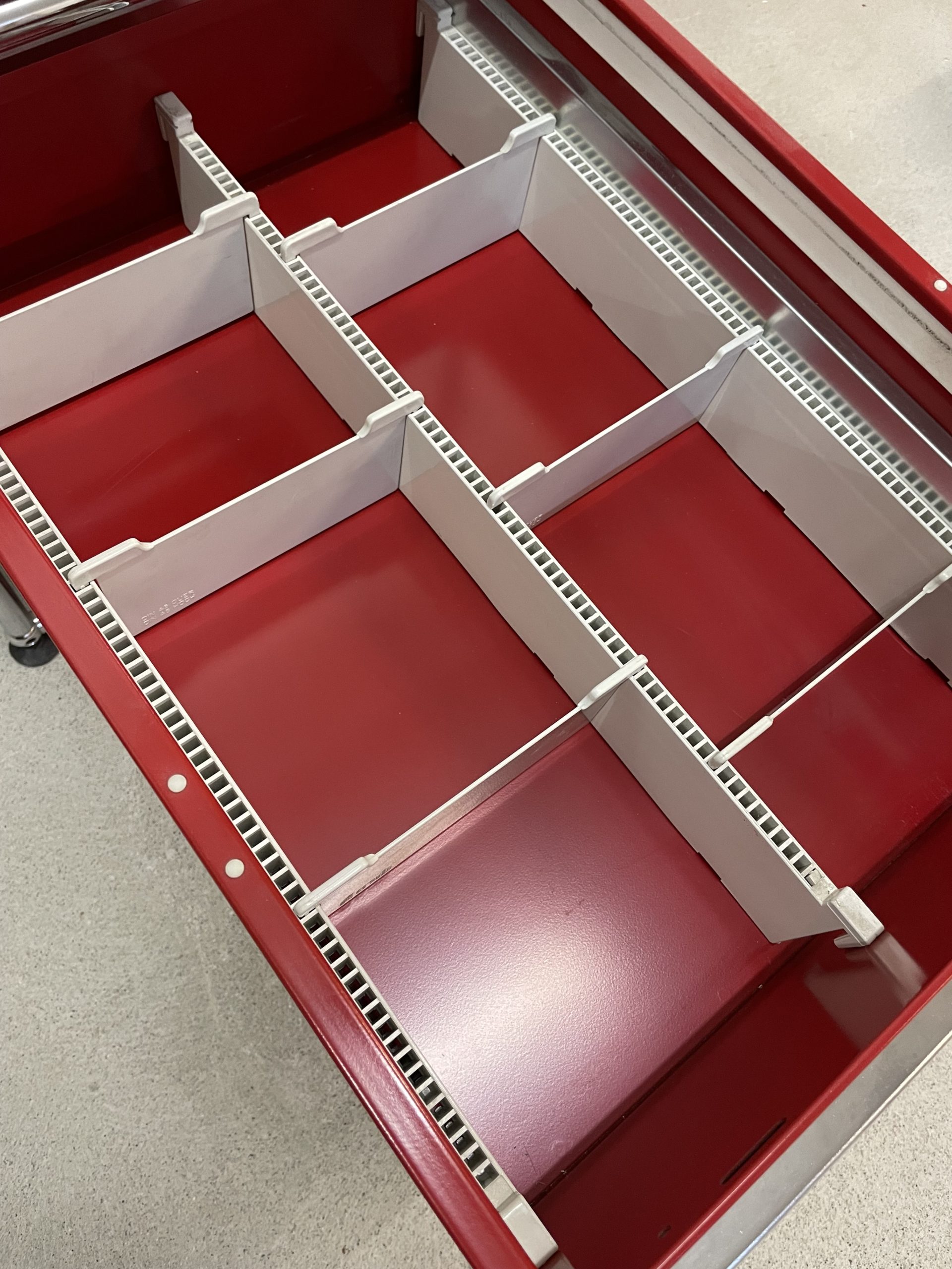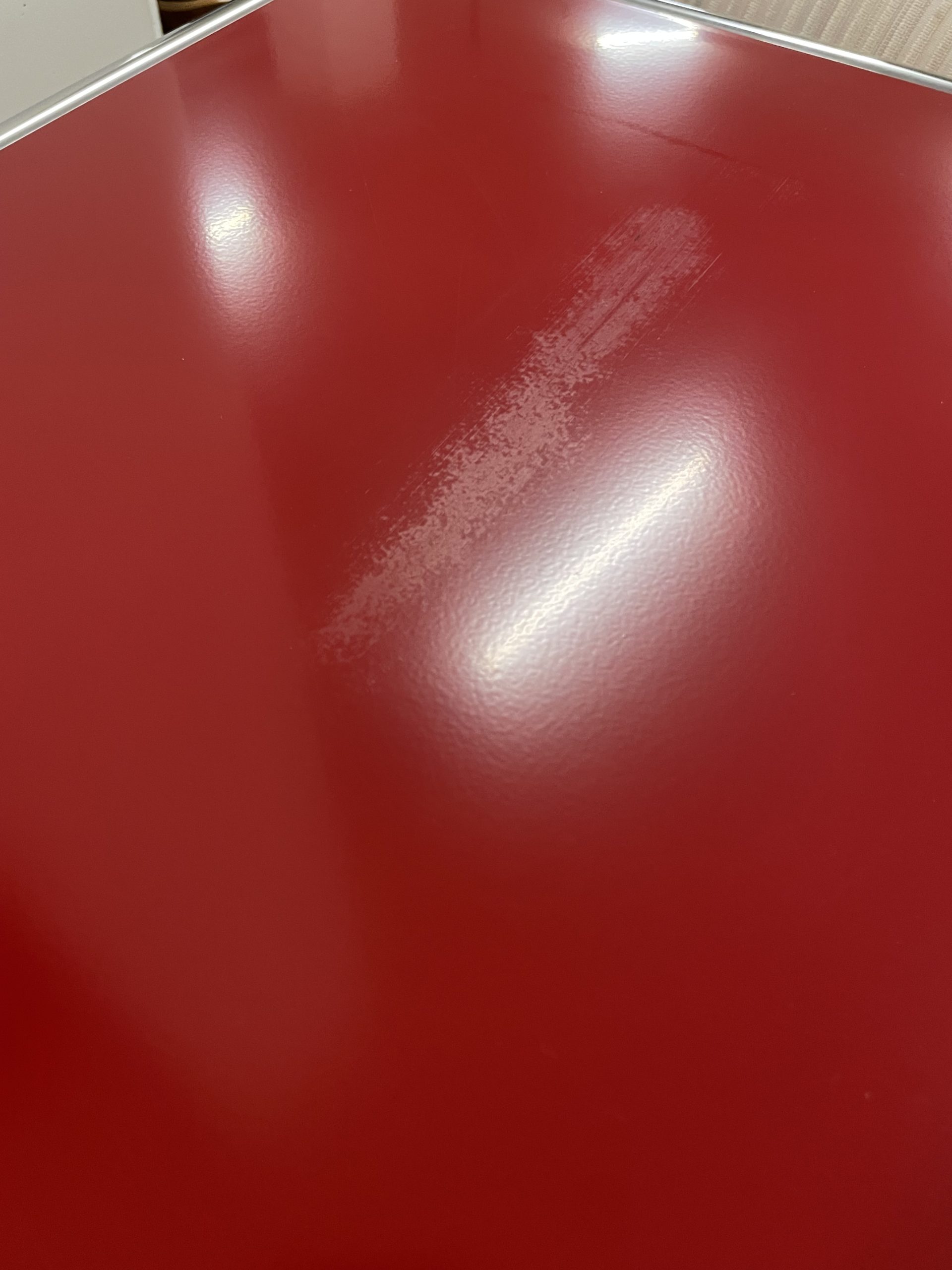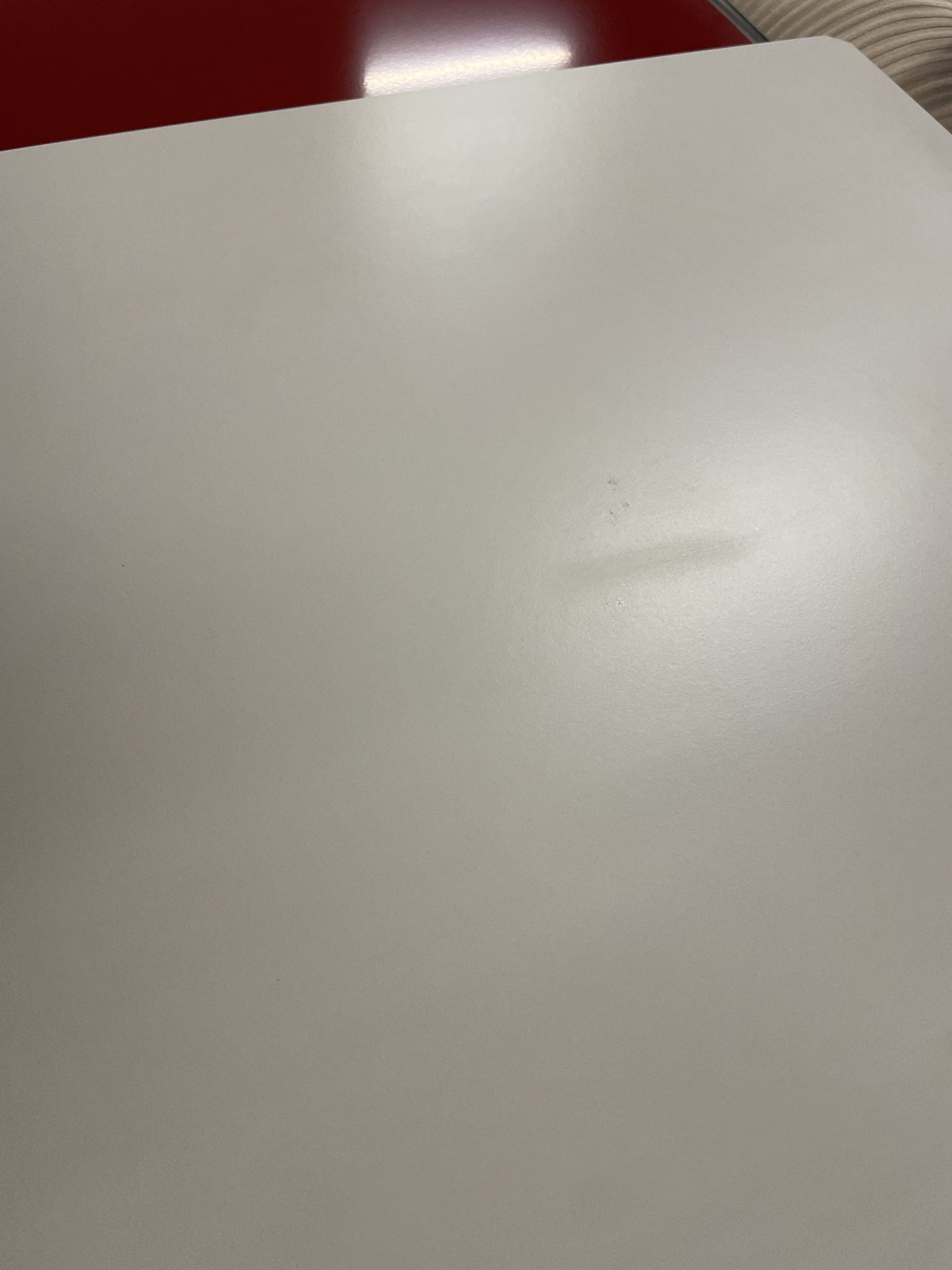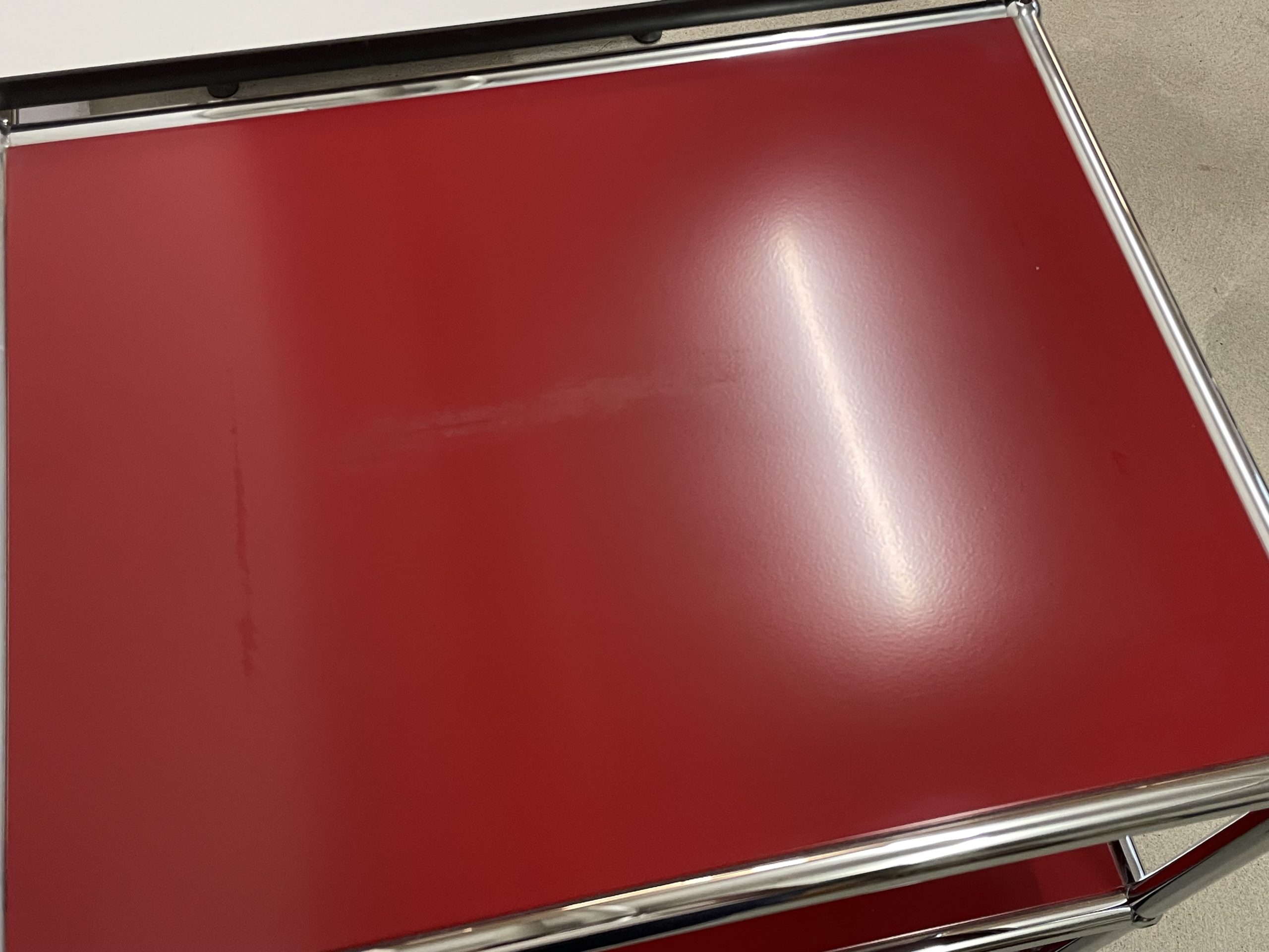 Le bureau est dans un assez bon état général mais comporte quelques défauts. La plaque rouge supérieure gauche a une trace de frottement assez marquée. Le plateau blanc présente aussi des traces, mais plus légères. Les tiroirs couinent un petit peu, mais fonctionnent parfaitement.