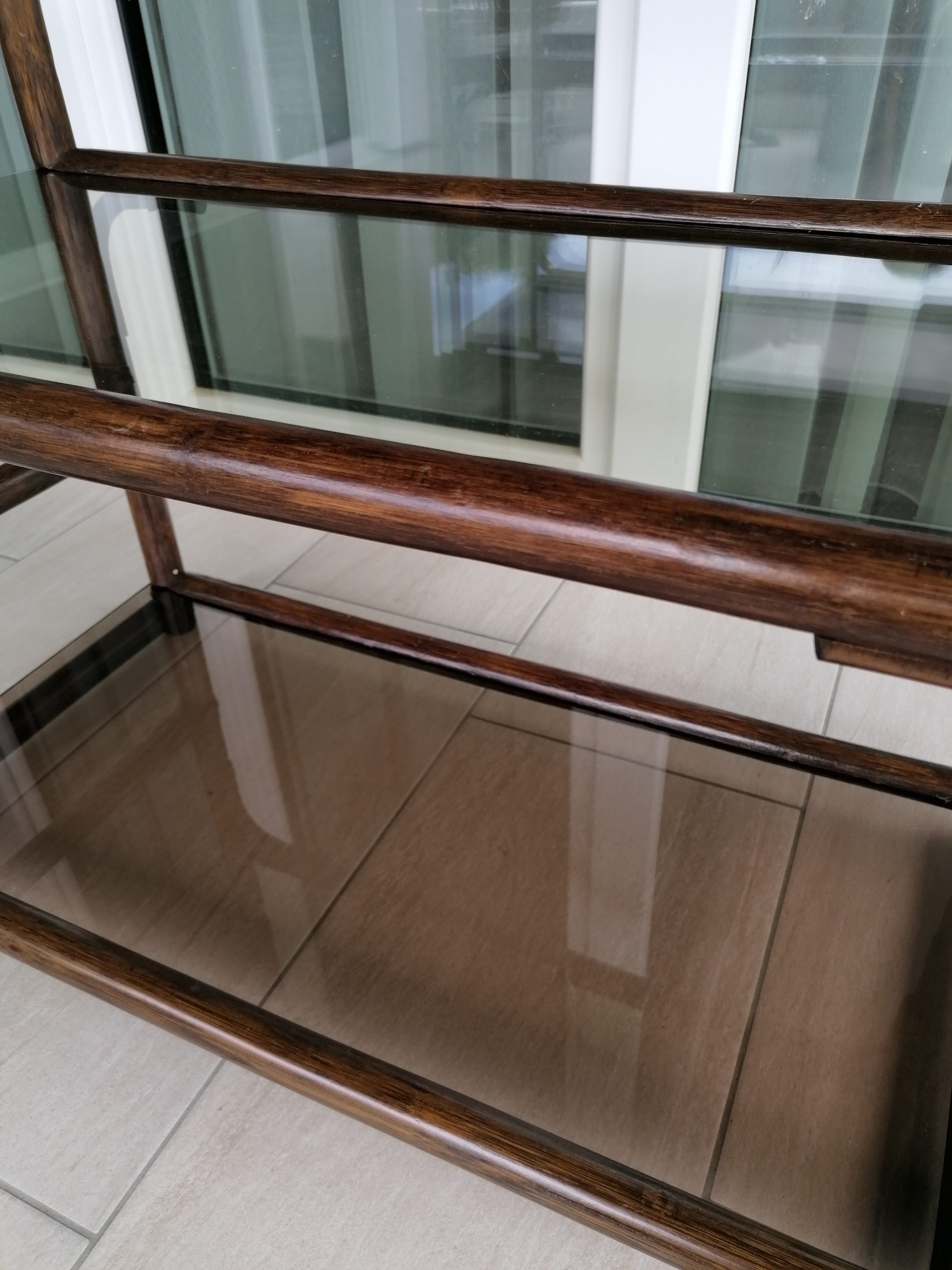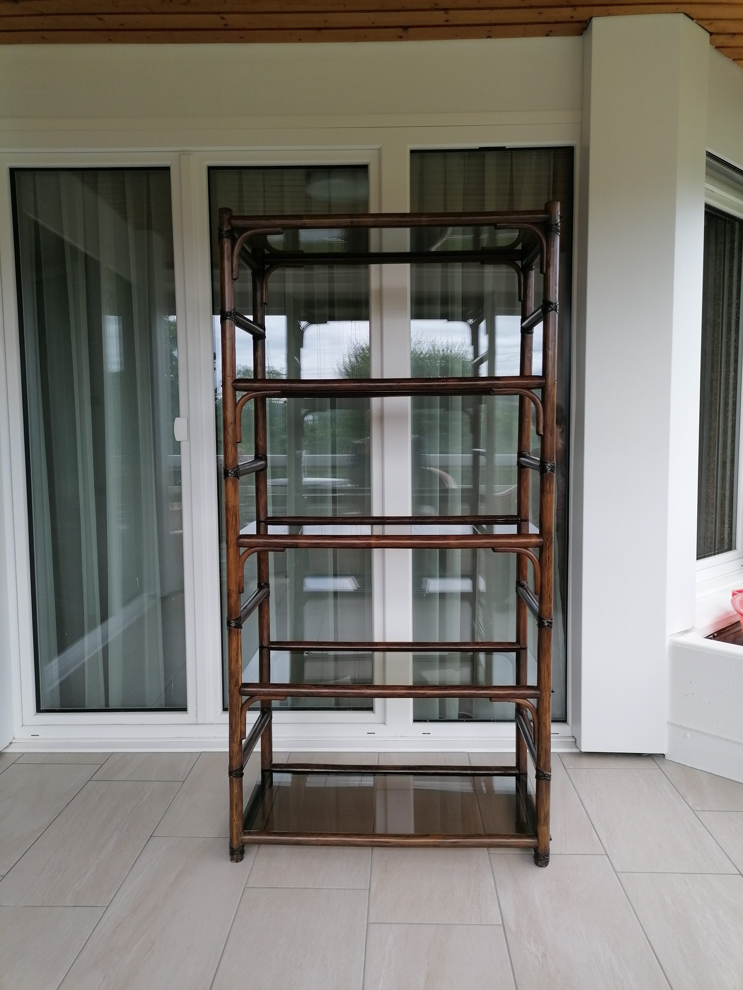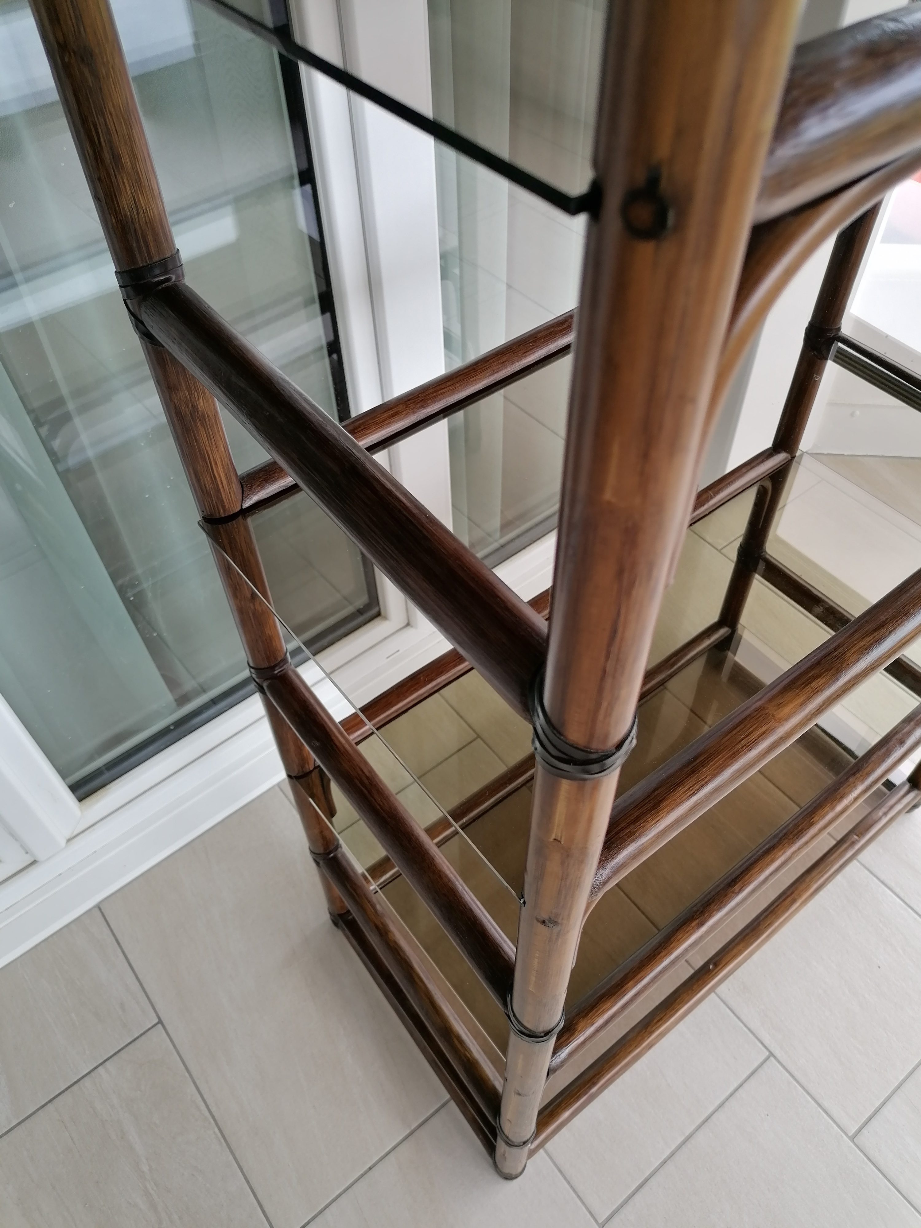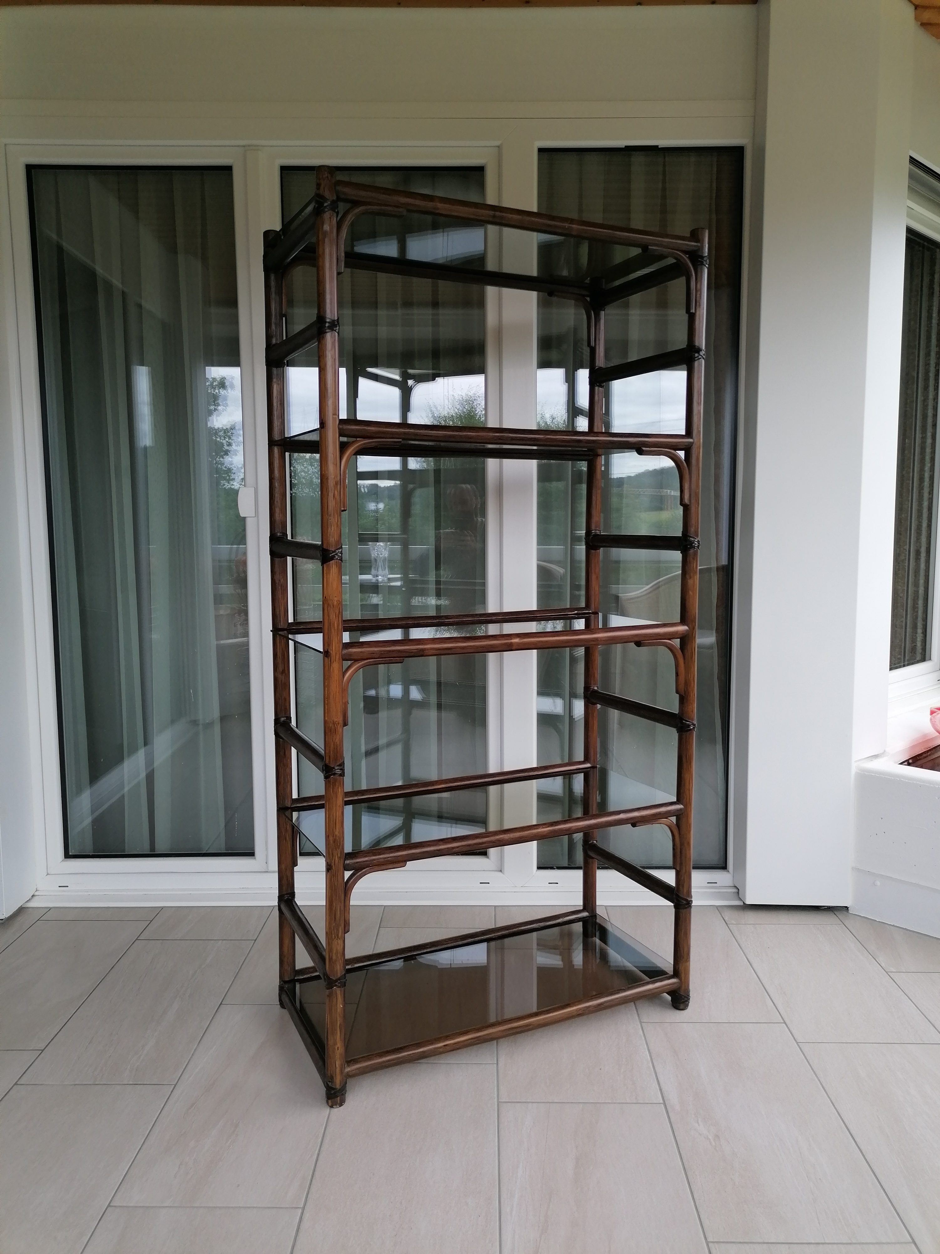 Verkauftes ProduktÉtagère vintage en bambou avec 5 plateaux en verre fumé. Un sixième plateau de rechange est inclus.