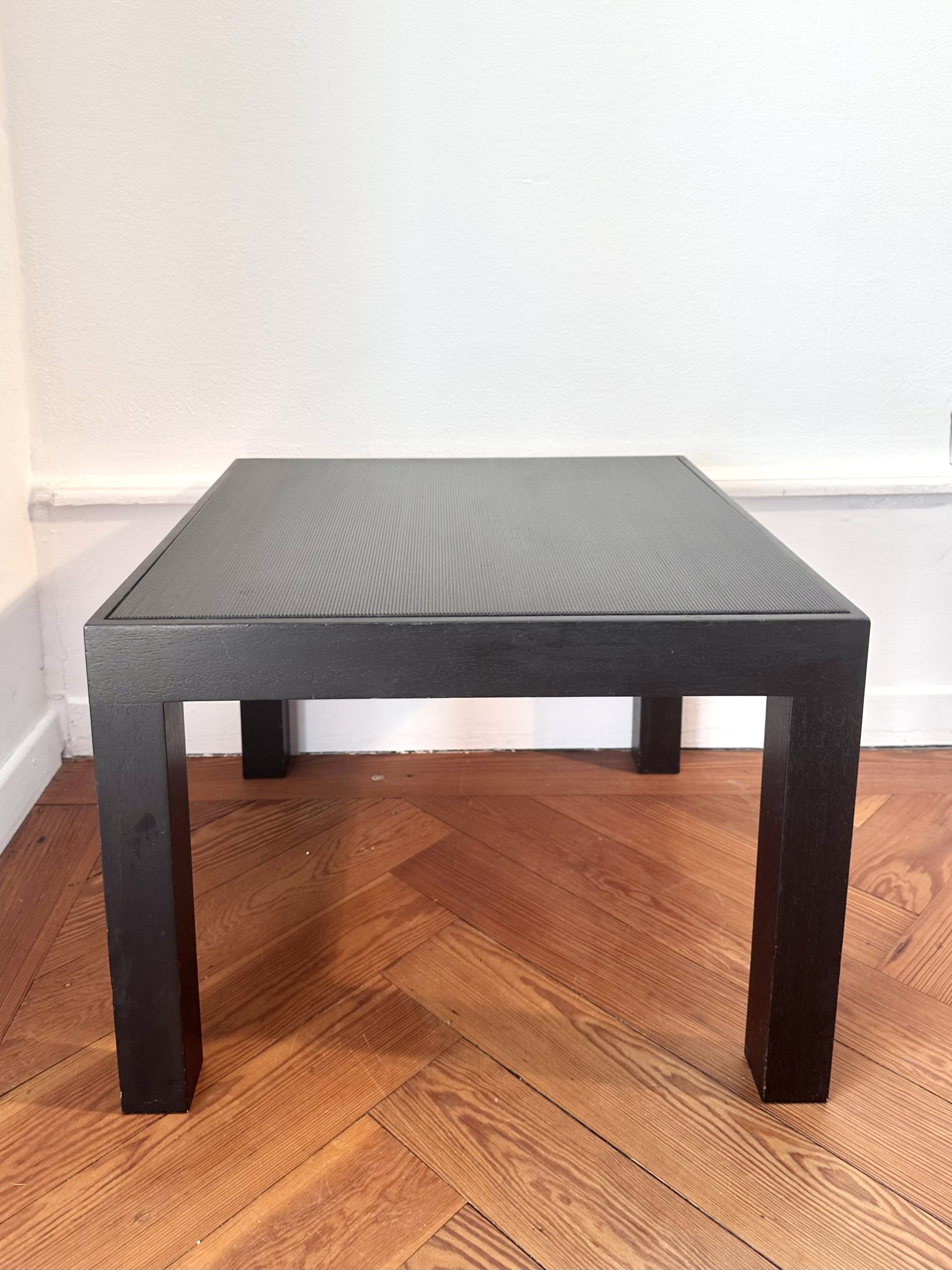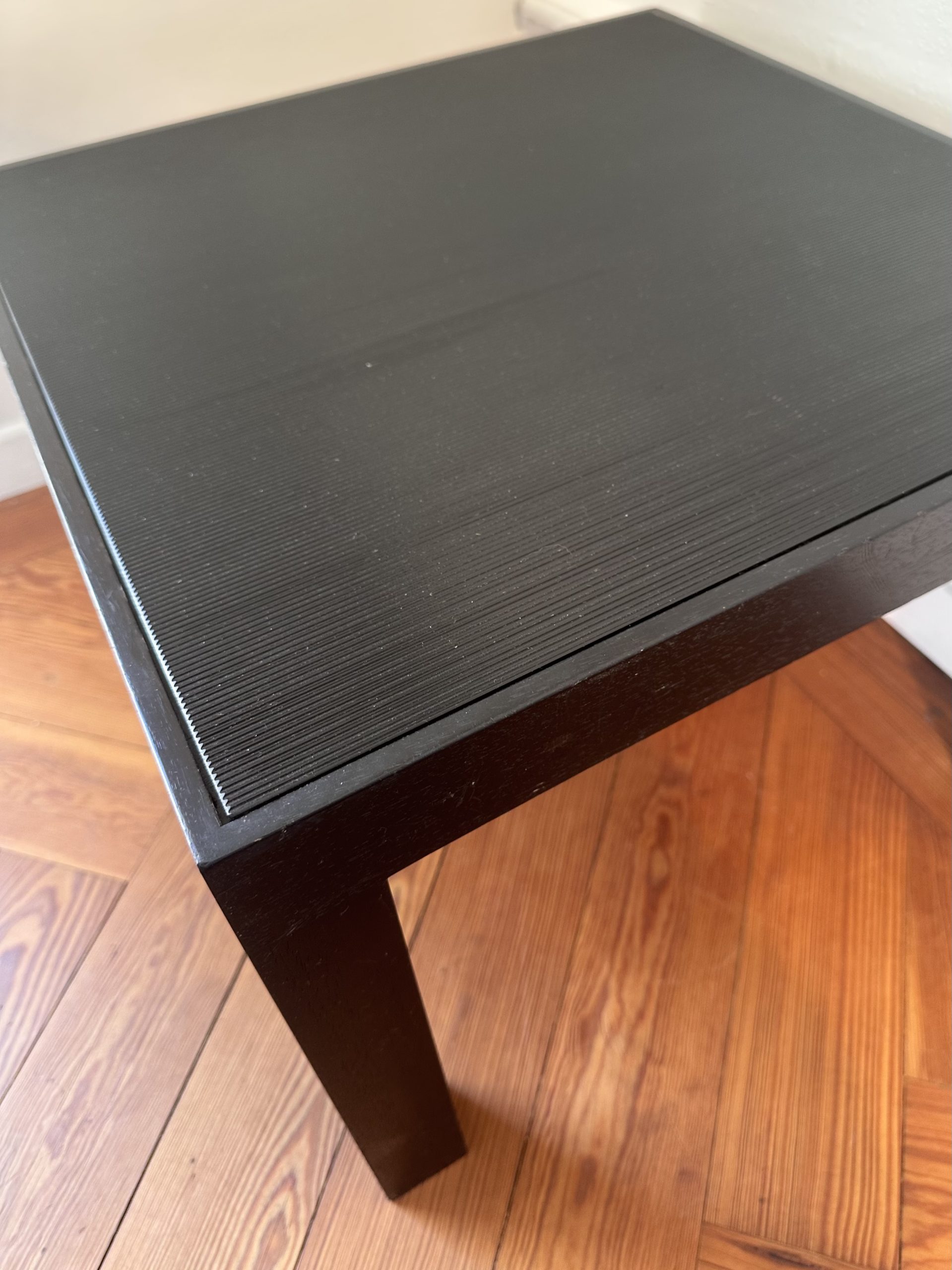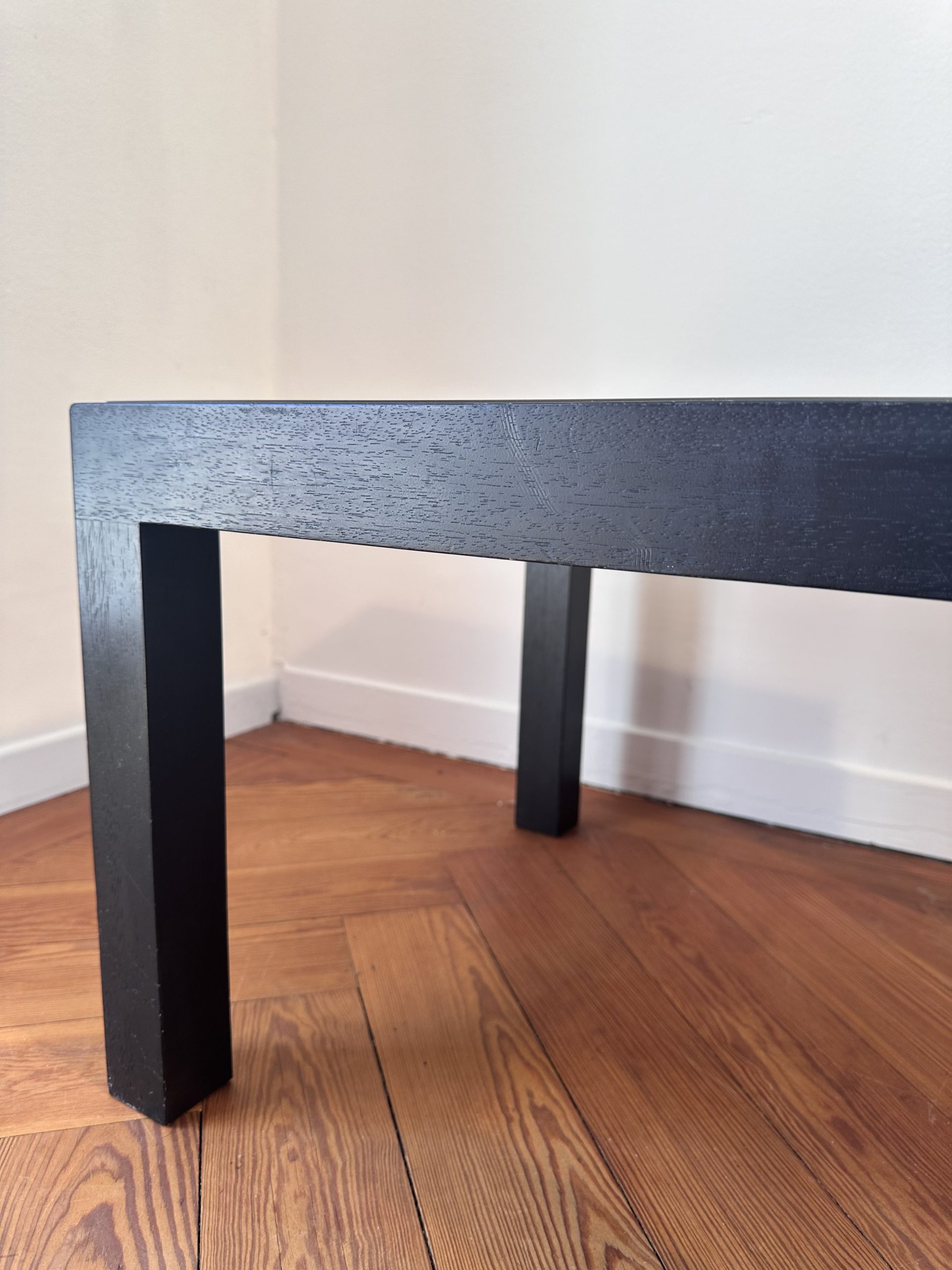 Cette table basse Suisse en verre marbrite aubergine, modèle parfois attribué à Robert et Trix Haussmann, est proche du modèle RH 603. Elle se compose d’une structure en bois laqué noir et d’un plateau en verre strié. Le verre paraît noir au premier regard, puis révèle à la lumière une belle teinte aubergine, profonde et nuancée.