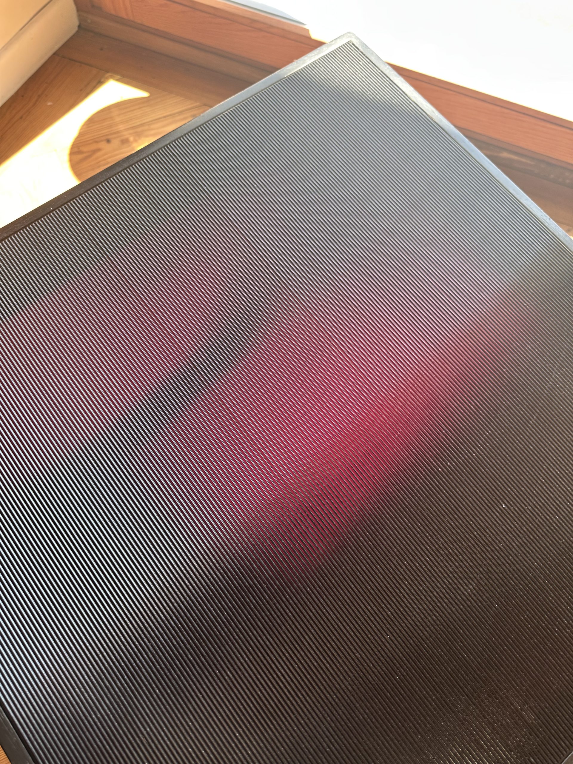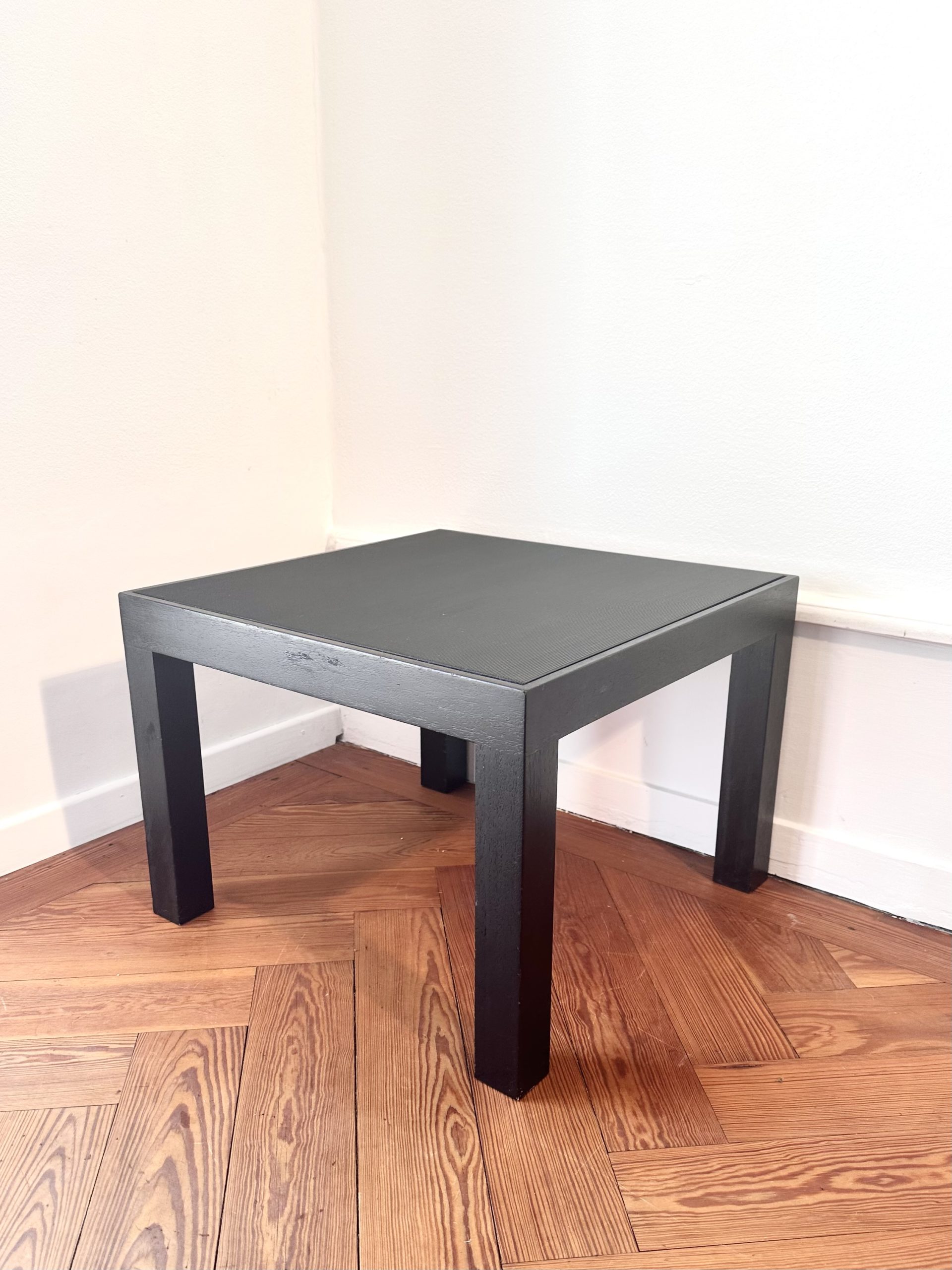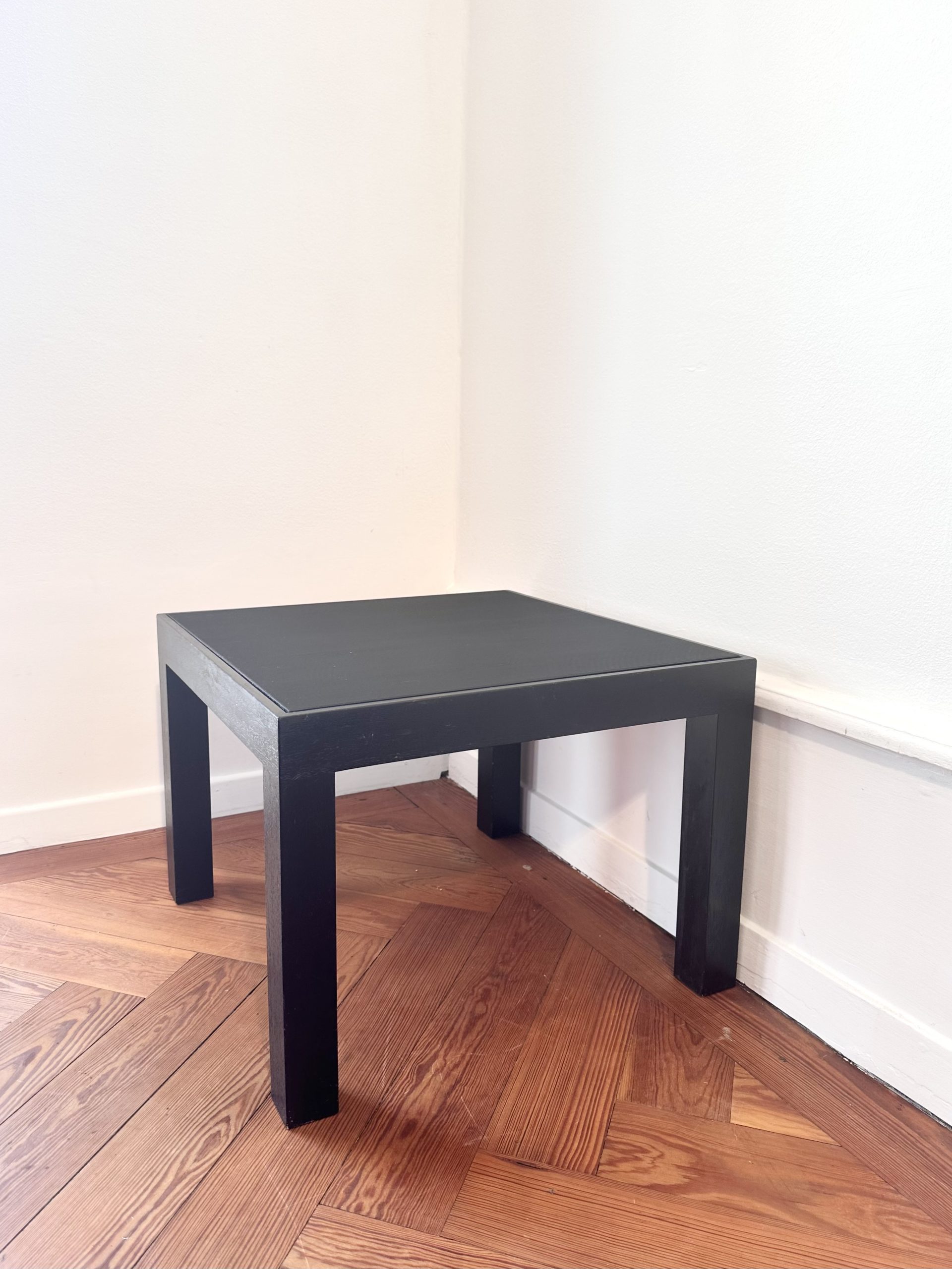 Cette table basse Suisse en verre marbrite aubergine, modèle parfois attribué à Robert et Trix Haussmann, est proche du modèle RH 603. Elle se compose d’une structure en bois laqué noir et d’un plateau en verre strié. Le verre paraît noir au premier regard, puis révèle à la lumière une belle teinte aubergine, profonde et nuancée.