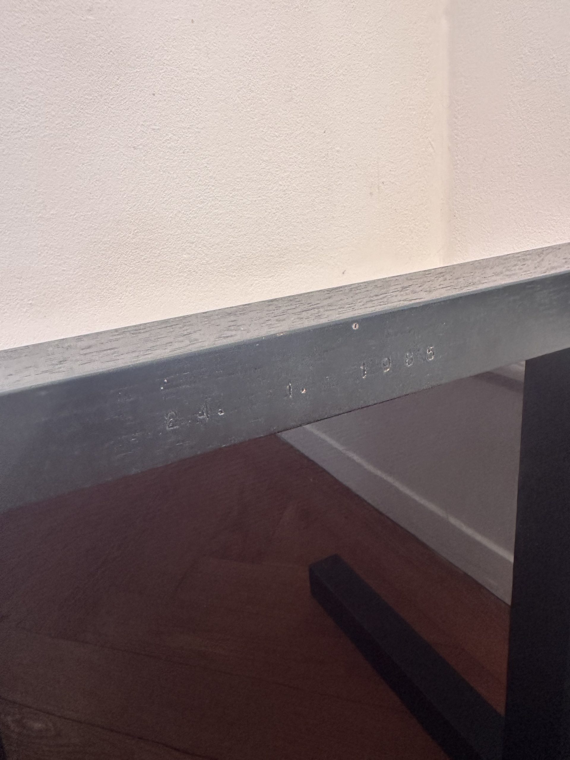 Elle présente de petits signes d’usure cohérents avec l’âge. Le bois est marqué par endroits, avec quelques frottements, rayures et petits manques de surface. Le plateau visible est en bel état. Une date 1985 est gravée sous la table.