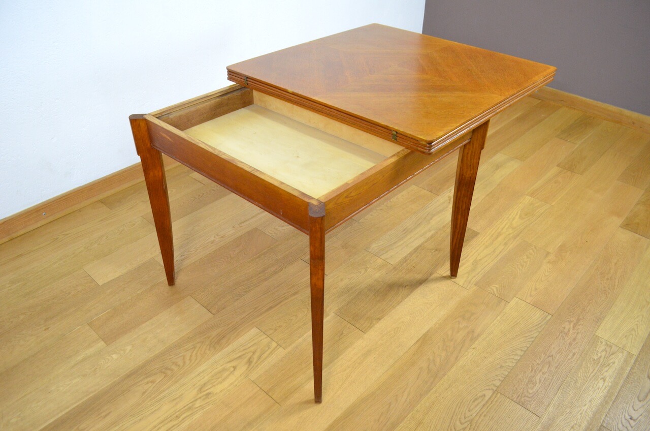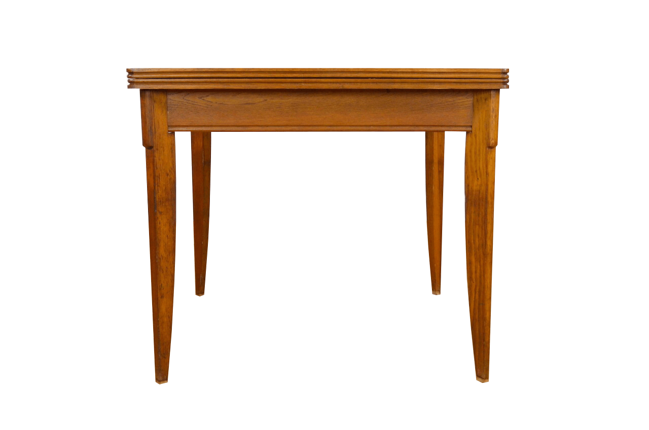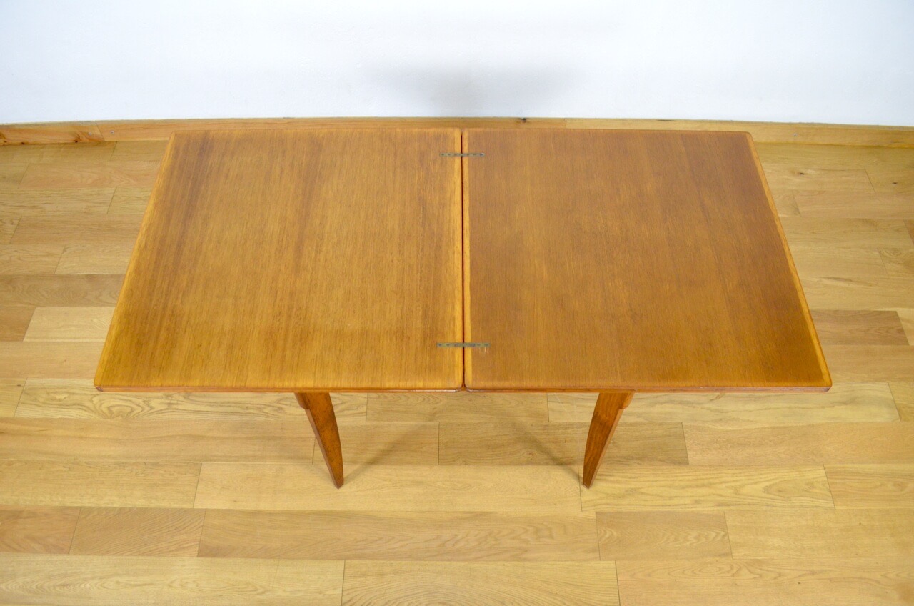 Table portefeuille Édition Polymeubles 1950, fabrication en chêne et placage. France. Dimensions : longueur 85 cm, longueur ouverte 170 cm, hauteur 75 cm, largeur 85 cm