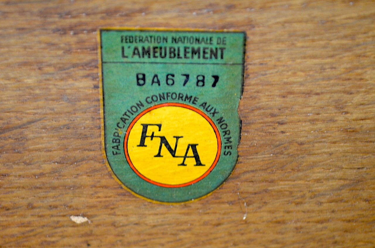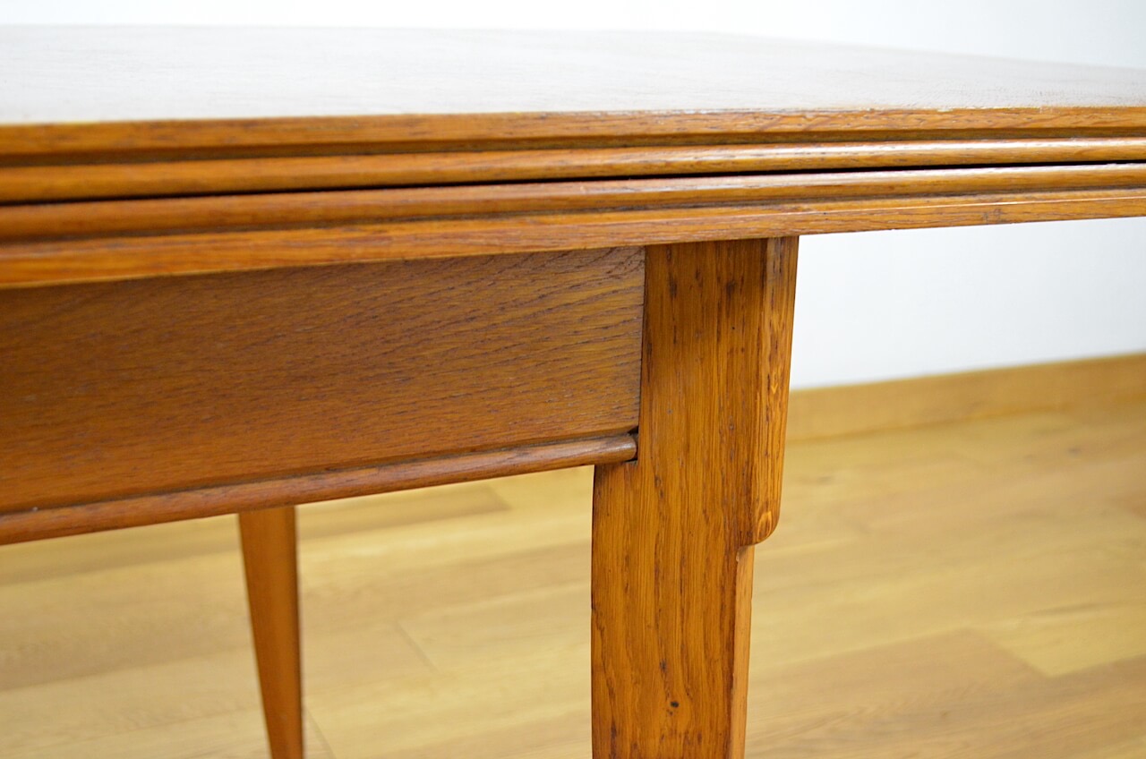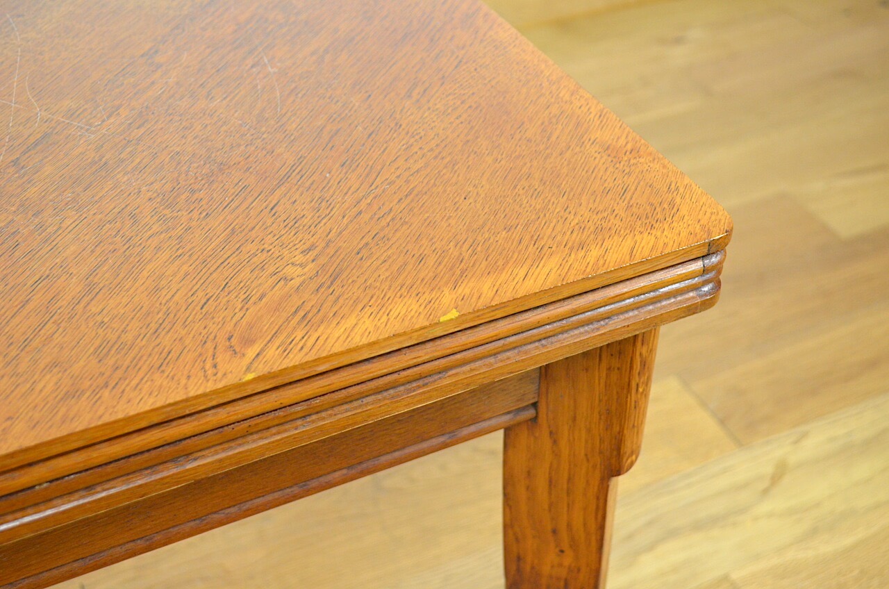 Table portefeuille Édition Polymeubles 1950, fabrication en chêne et placage. France. Dimensions : longueur 85 cm, longueur ouverte 170 cm, hauteur 75 cm, largeur 85 cm