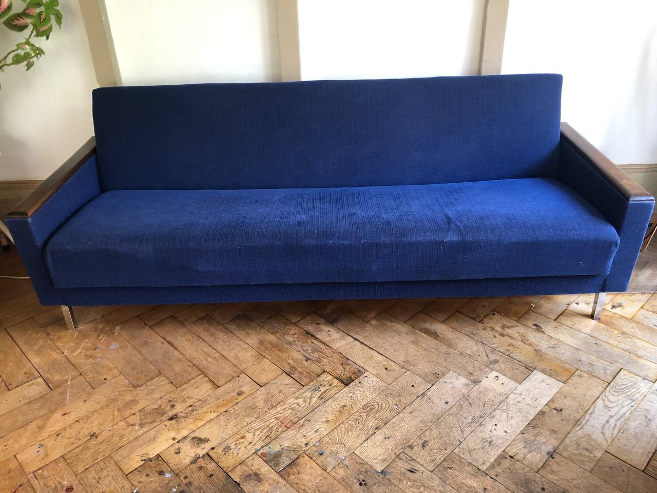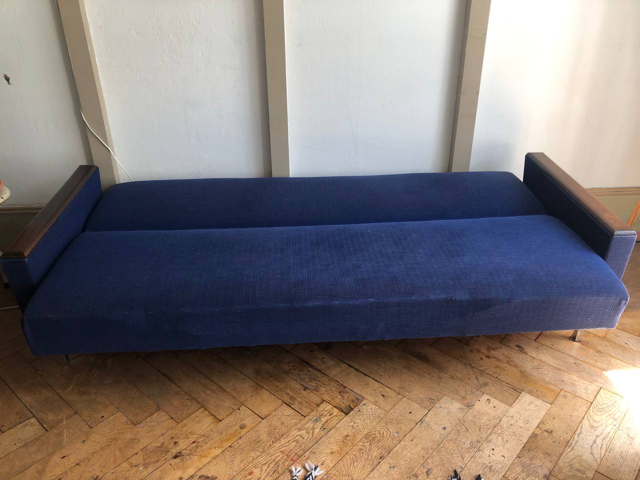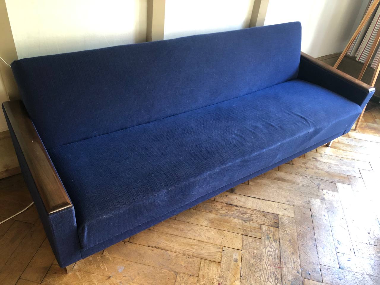 Verkauftes ProduktCanapé-lit / canapé convertible. 4 places. Design vintage scandinave, 1960. Tissu bleu roi et bleu marine, selon les reflets. Accoudoirs en bois, pieds en métal. Espace de rangement pour duvet, oreillers ou autres. Dimensions « canapé »: 200 x 75. Dimensions « lit »: 200 x 95. Espace de rangement: env. 180 x 59. Tissu légèrement endommagé sur les coins des accoudoirs.