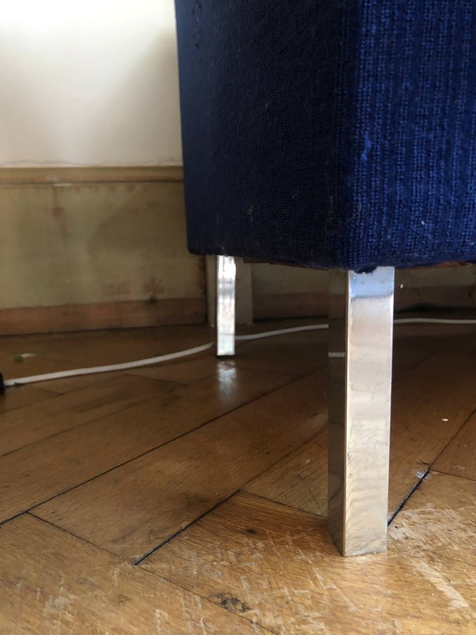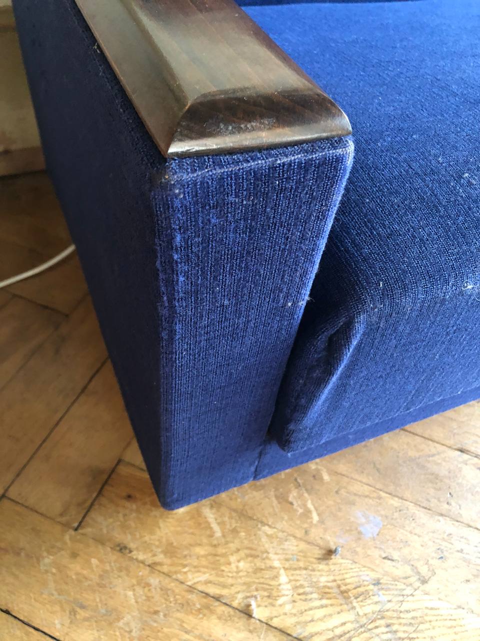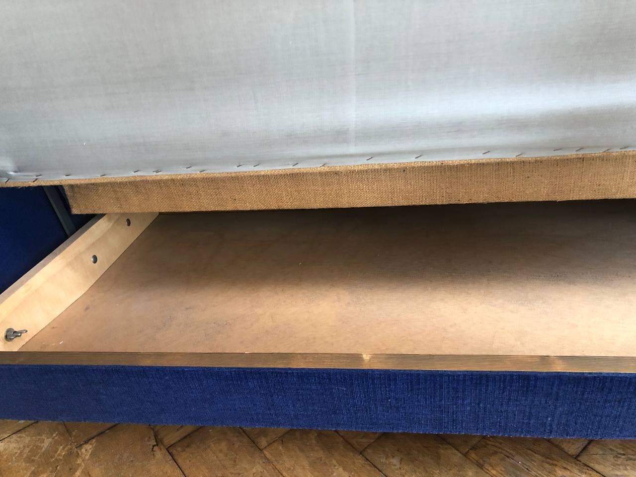 Verkauftes ProduktCanapé-lit / canapé convertible. 4 places. Design vintage scandinave, 1960. Tissu bleu roi et bleu marine, selon les reflets. Accoudoirs en bois, pieds en métal. Espace de rangement pour duvet, oreillers ou autres. Dimensions « canapé »: 200 x 75. Dimensions « lit »: 200 x 95. Espace de rangement: env. 180 x 59. Tissu légèrement endommagé sur les coins des accoudoirs.