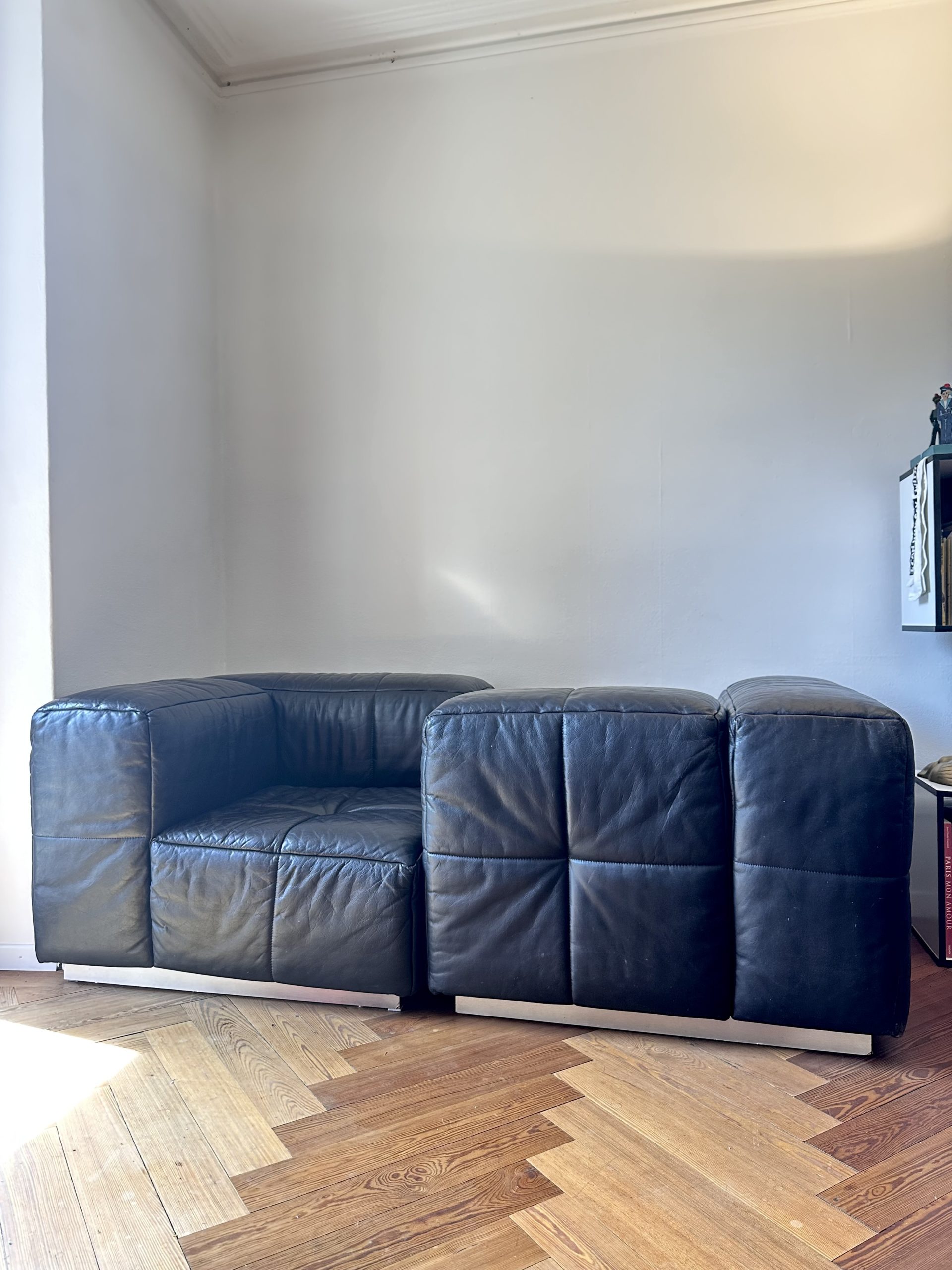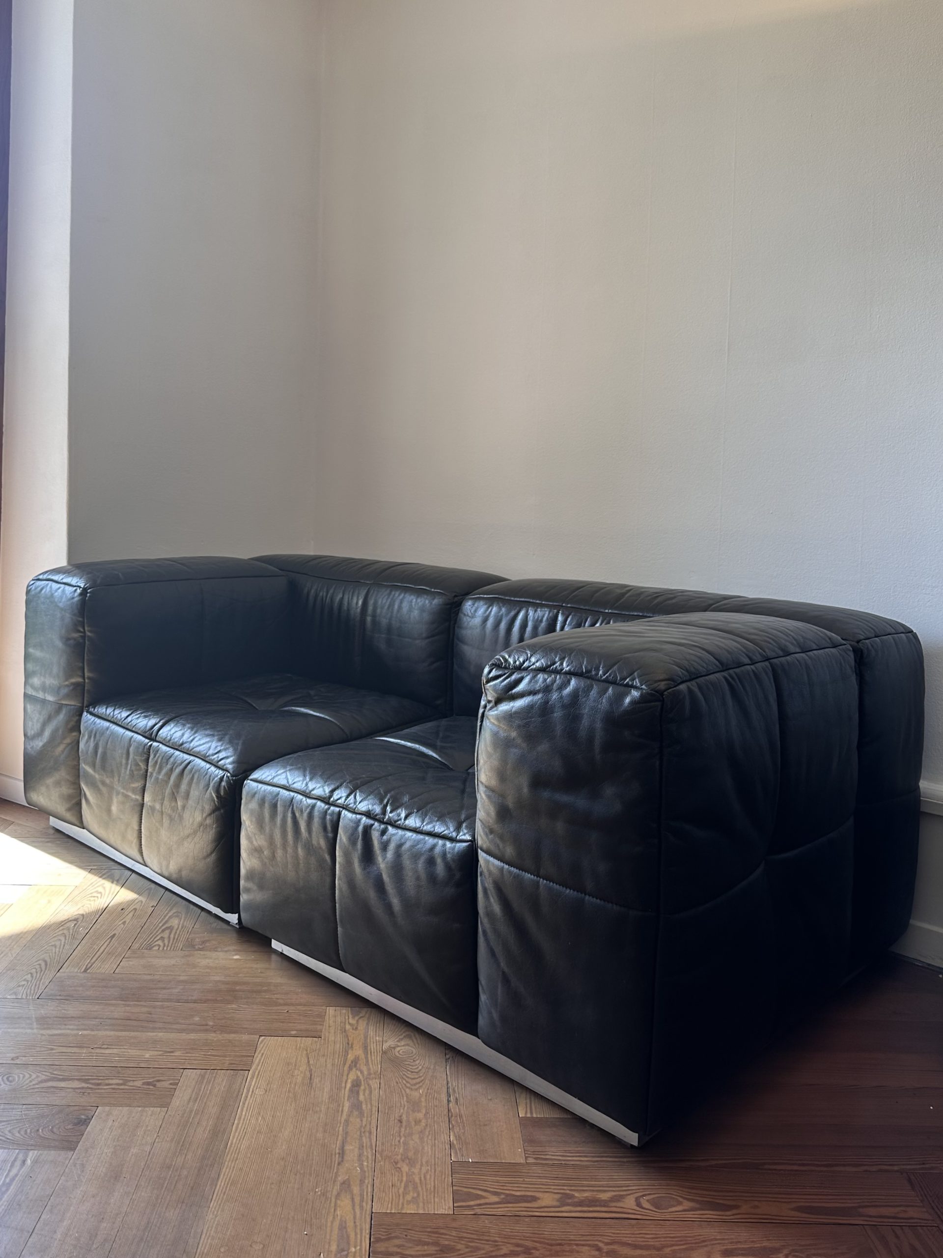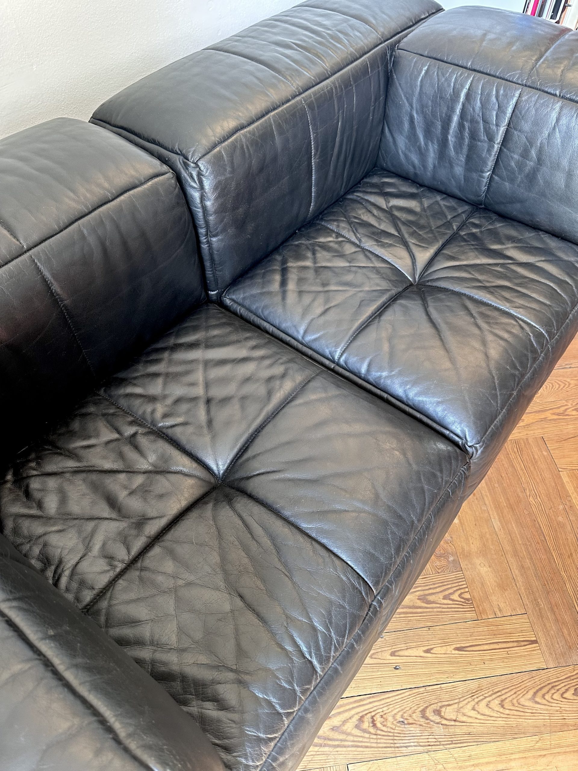 Canapé modulaire en cuir noir daté de 1975, composé de deux éléments larges et profonds, aux proportions très justes. Ensemble acheté à l’époque chez Teo Jakob, référence du design en Suisse.