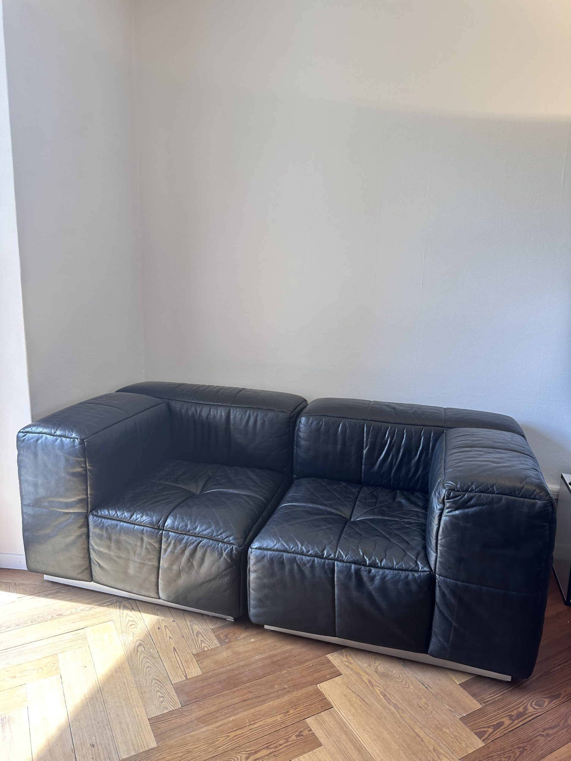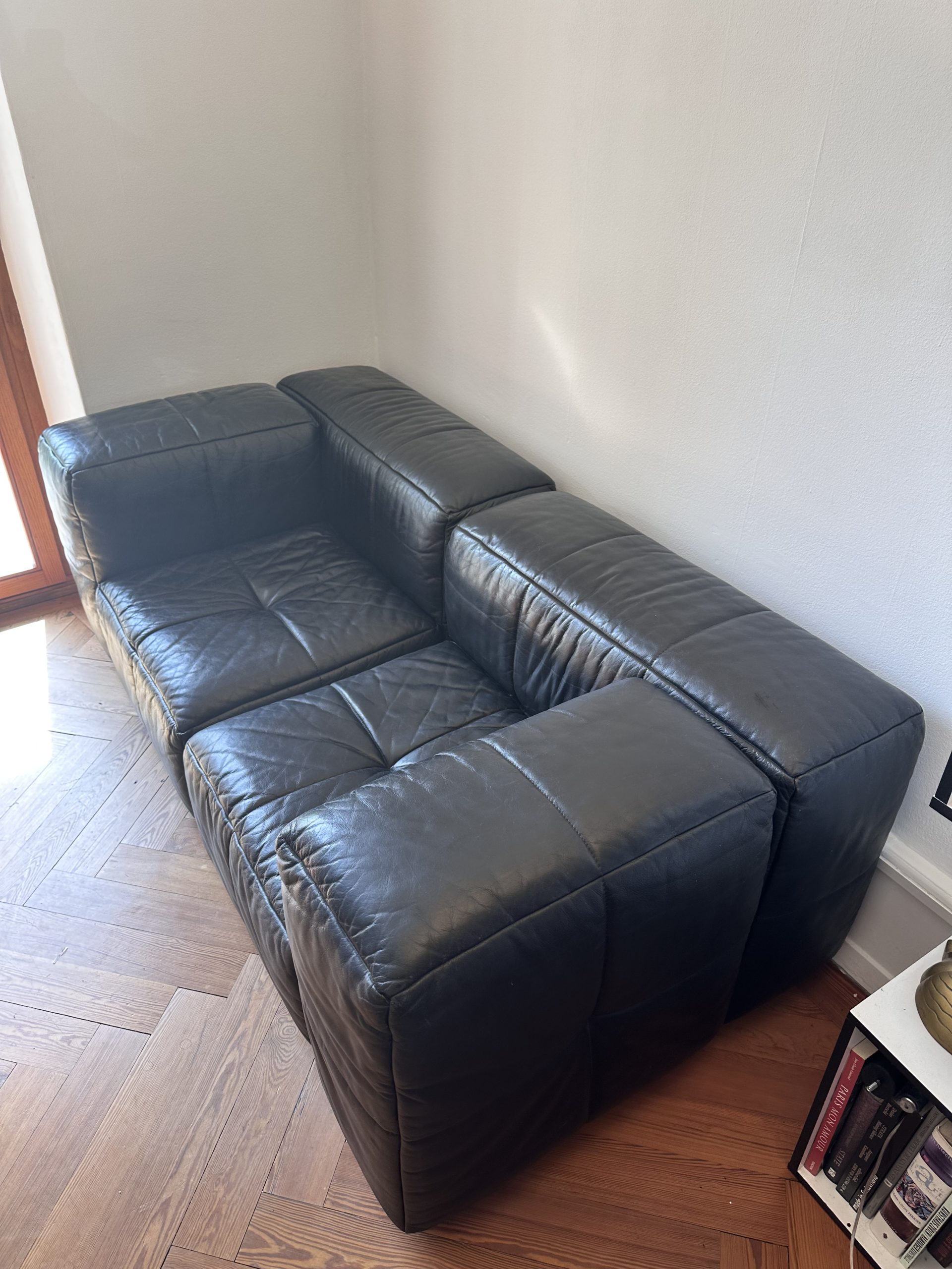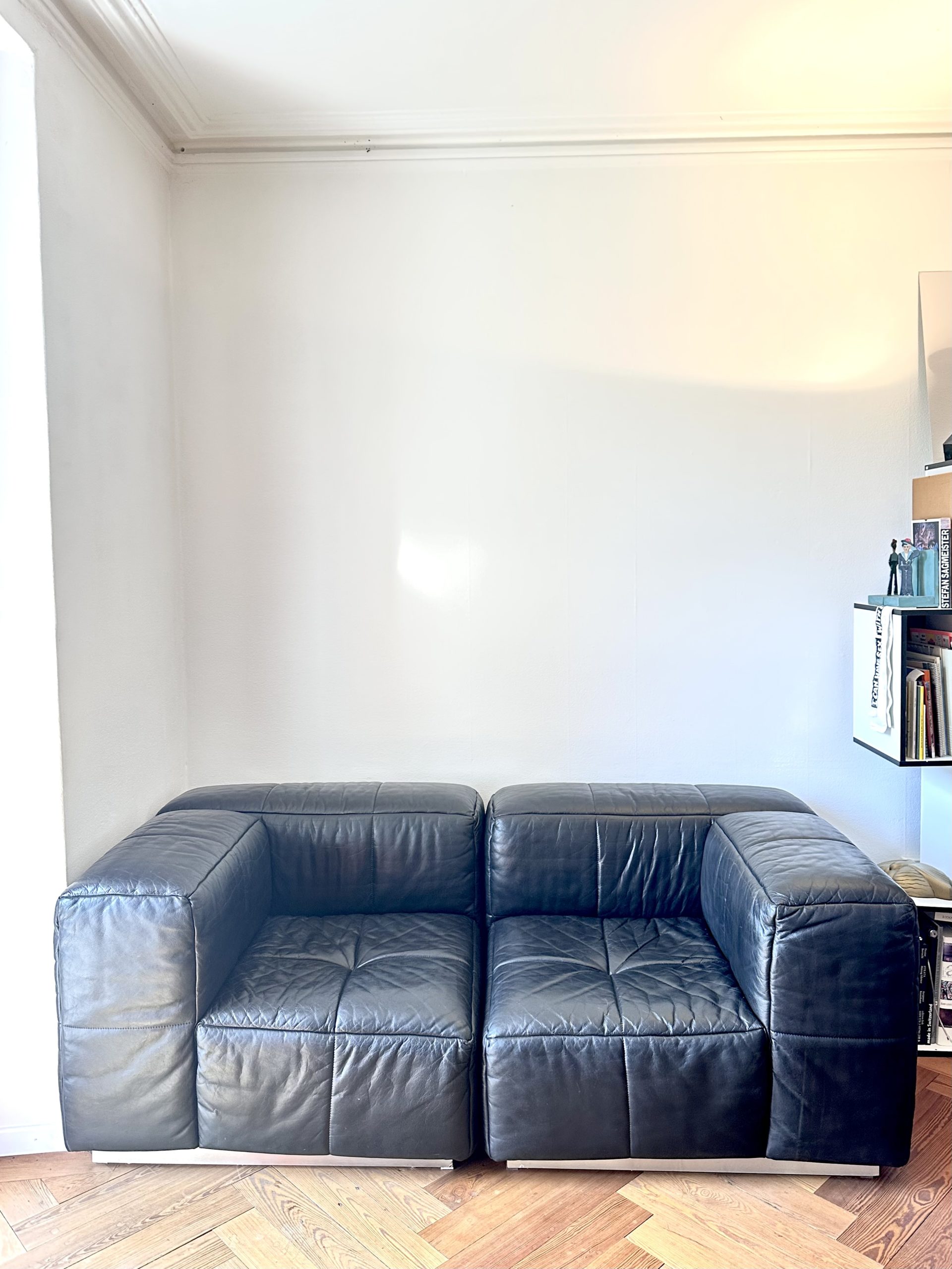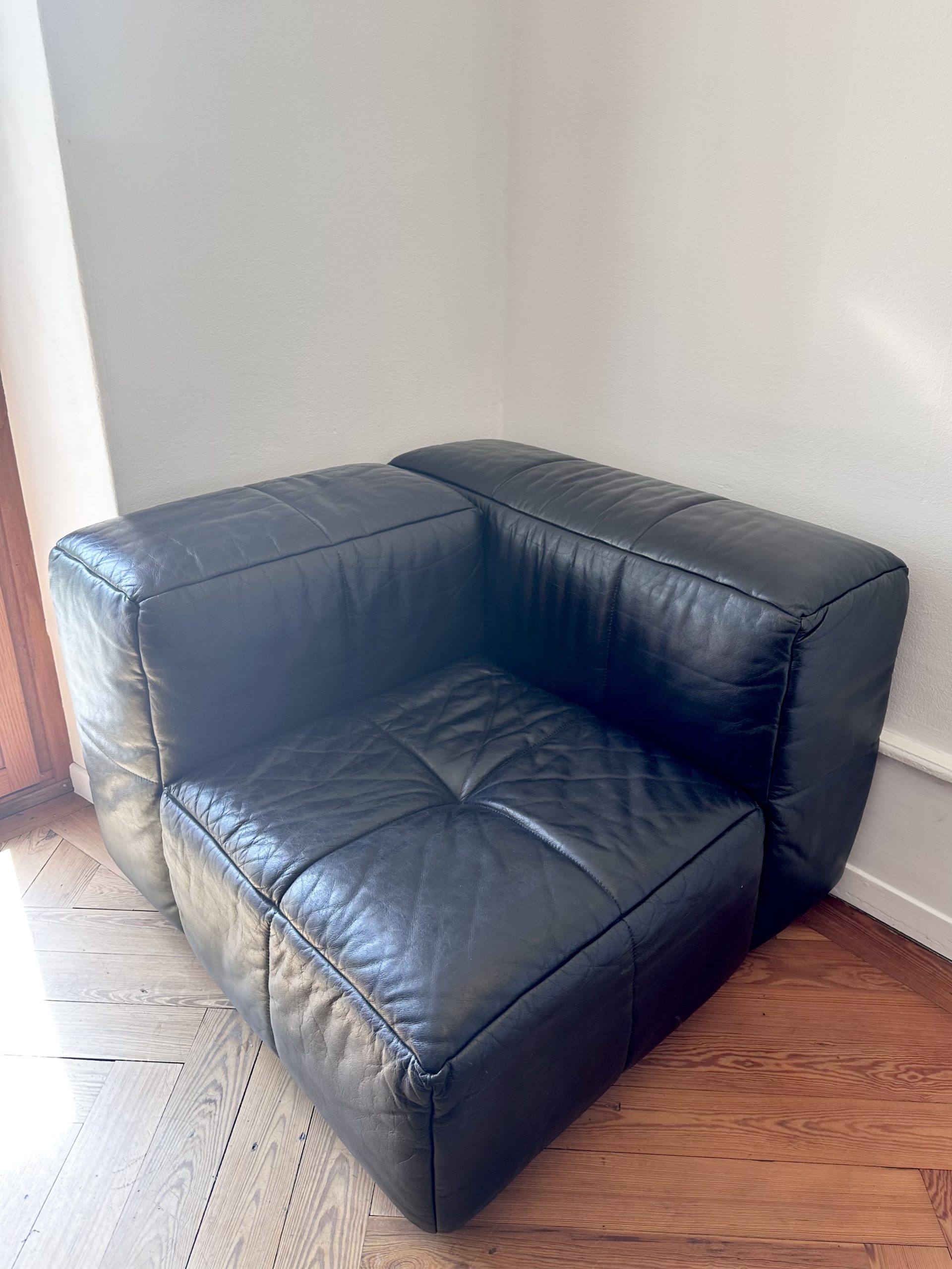 Canapé modulaire en cuir noir daté de 1975, composé de deux éléments larges et profonds, aux proportions très justes. Ensemble acheté à l’époque chez Teo Jakob, référence du design en Suisse.
