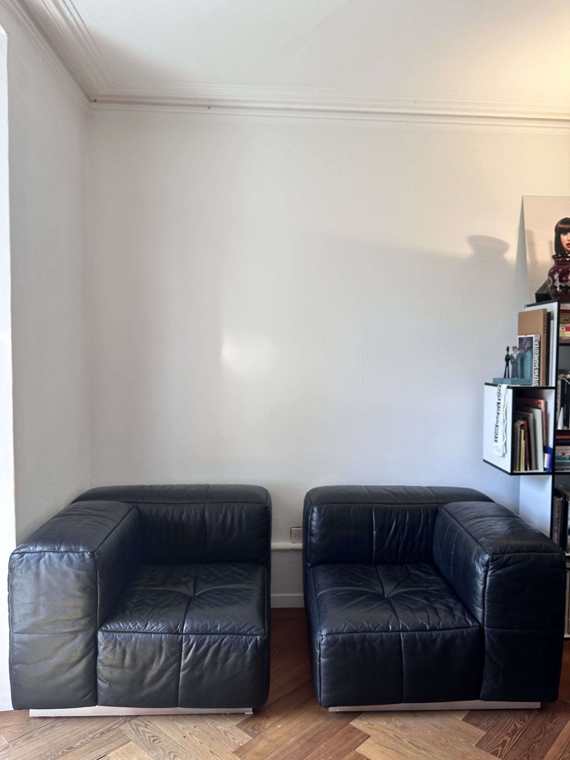 La silhouette est basse, dense, presque architecturale. Les volumes sont francs, les lignes nettes, avec ce rapport plein/vide très caractéristique du mobilier suisse des années 1970. Le cuir, épais et souple, capte la lumière avec une patine profonde et vivante. L’ensemble évoque immédiatement les grands modulaires De Sede de la même période.