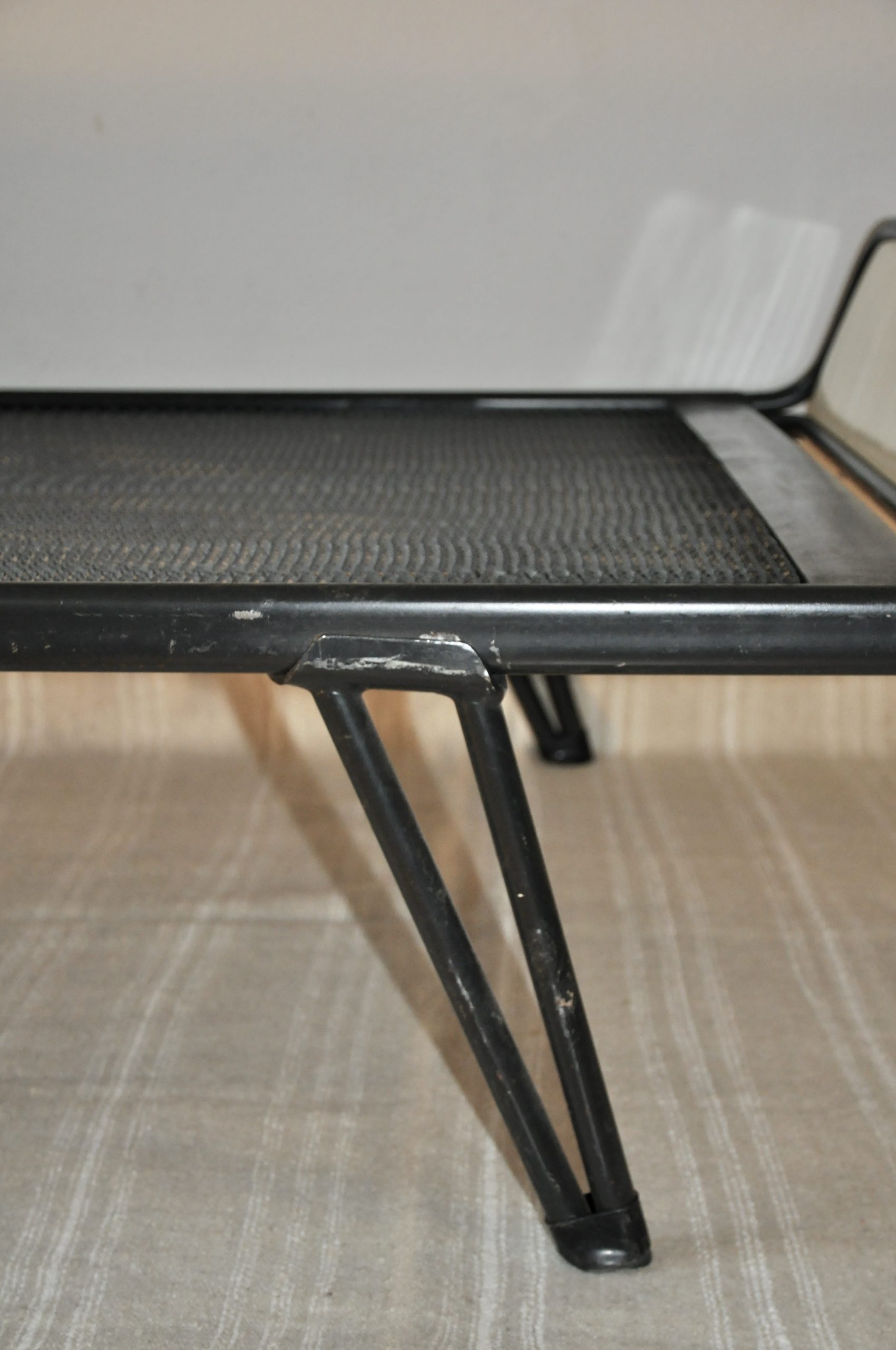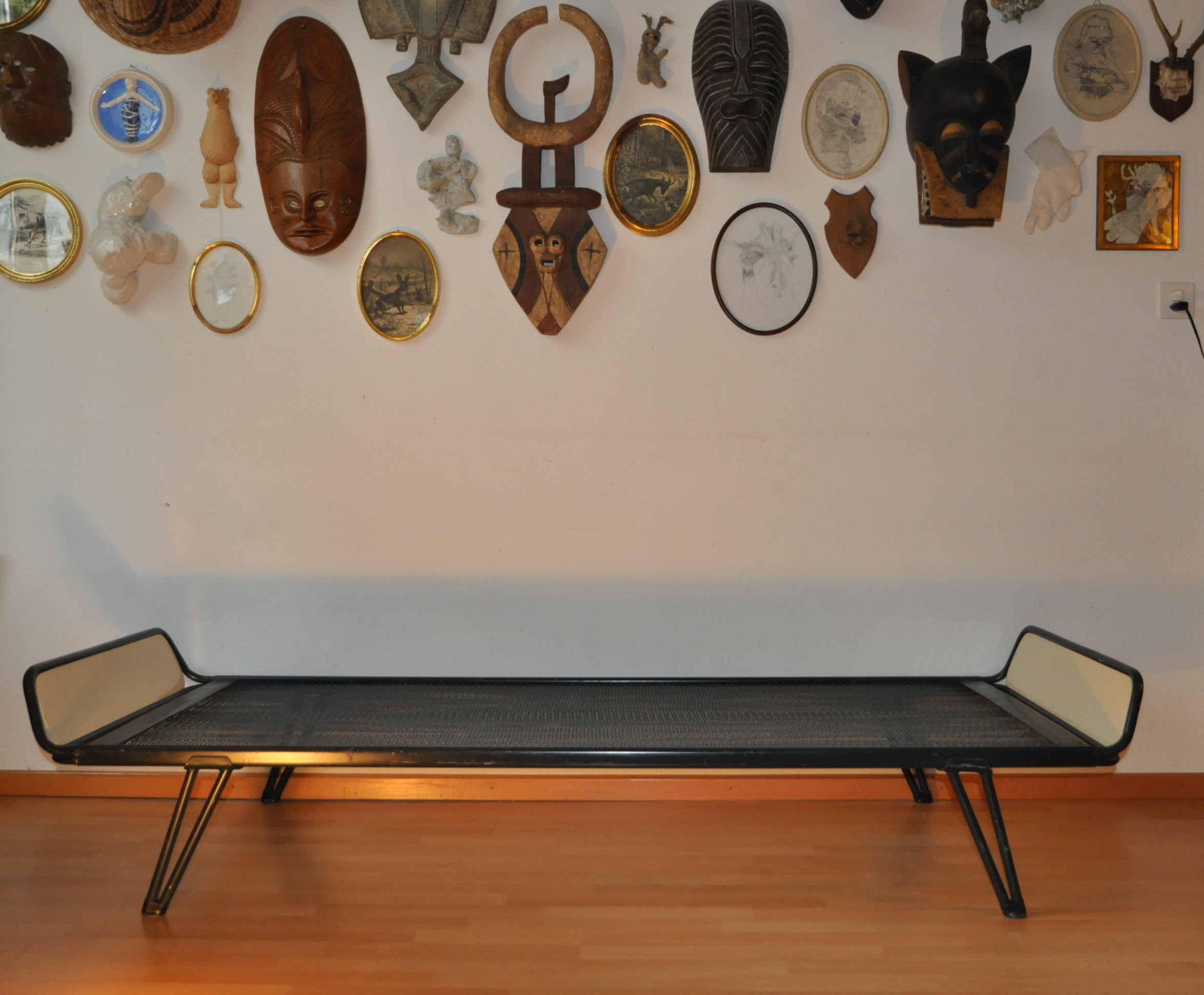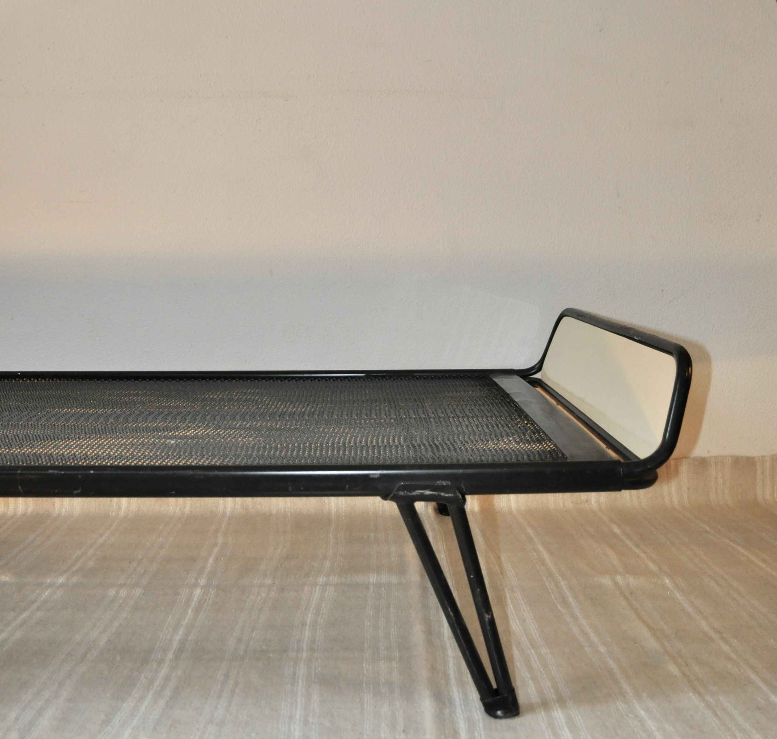 Lit de jour ou daybed en métal datant des années 50-60 pour Auping Pays-Bas. Inspiré du modèle de A.R. Cordemeyer pour la forme, cette version ne possède pas les parties chromées mais est en tout point identique. La structure et les pieds en tubulaire creux sont peints en noir. Ces derniers sont amovibles et recouverts d’un bouchon en plastique. La tête et le pied du lit possèdent chacun une planche en chêne peint en blanc intégré dans la structure. Il y a des traces d’usure sur la peinture.