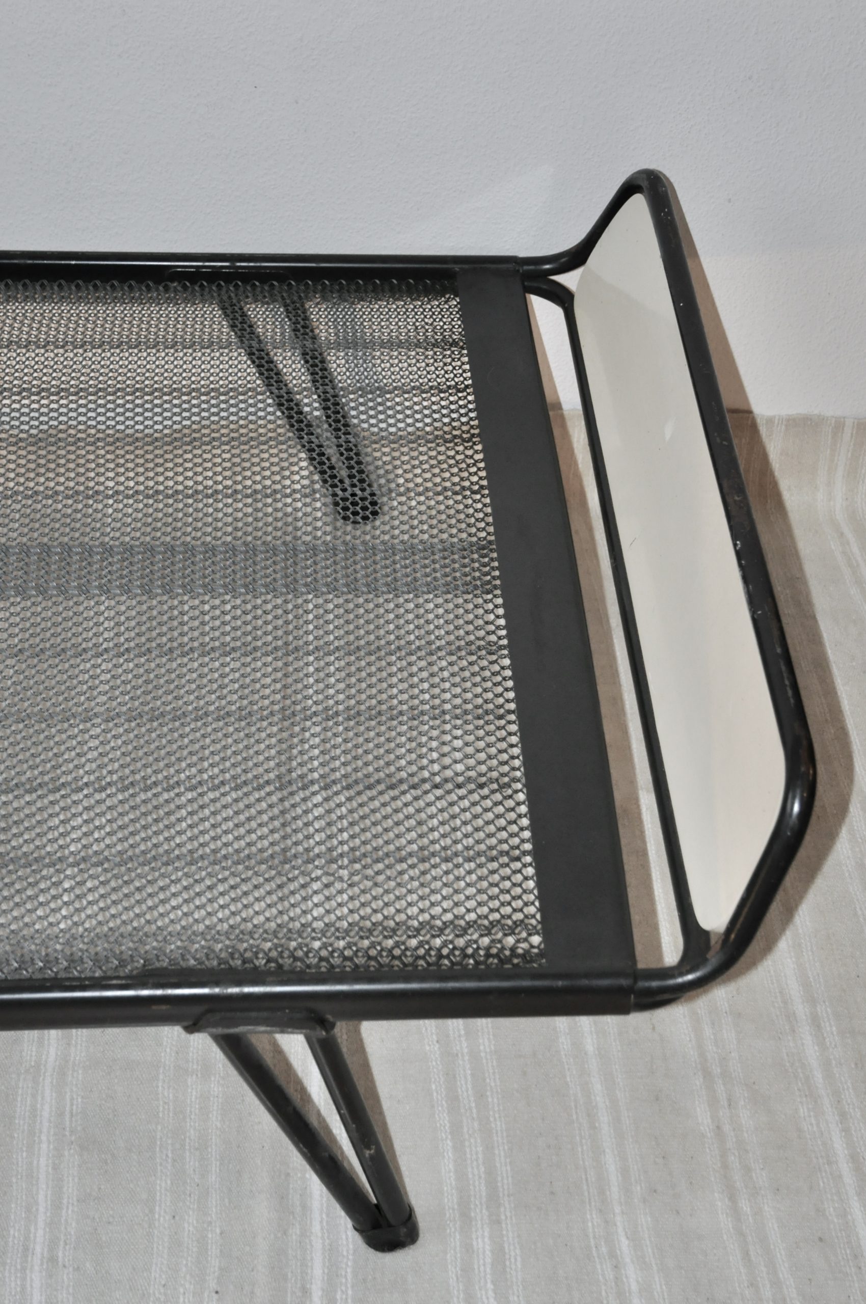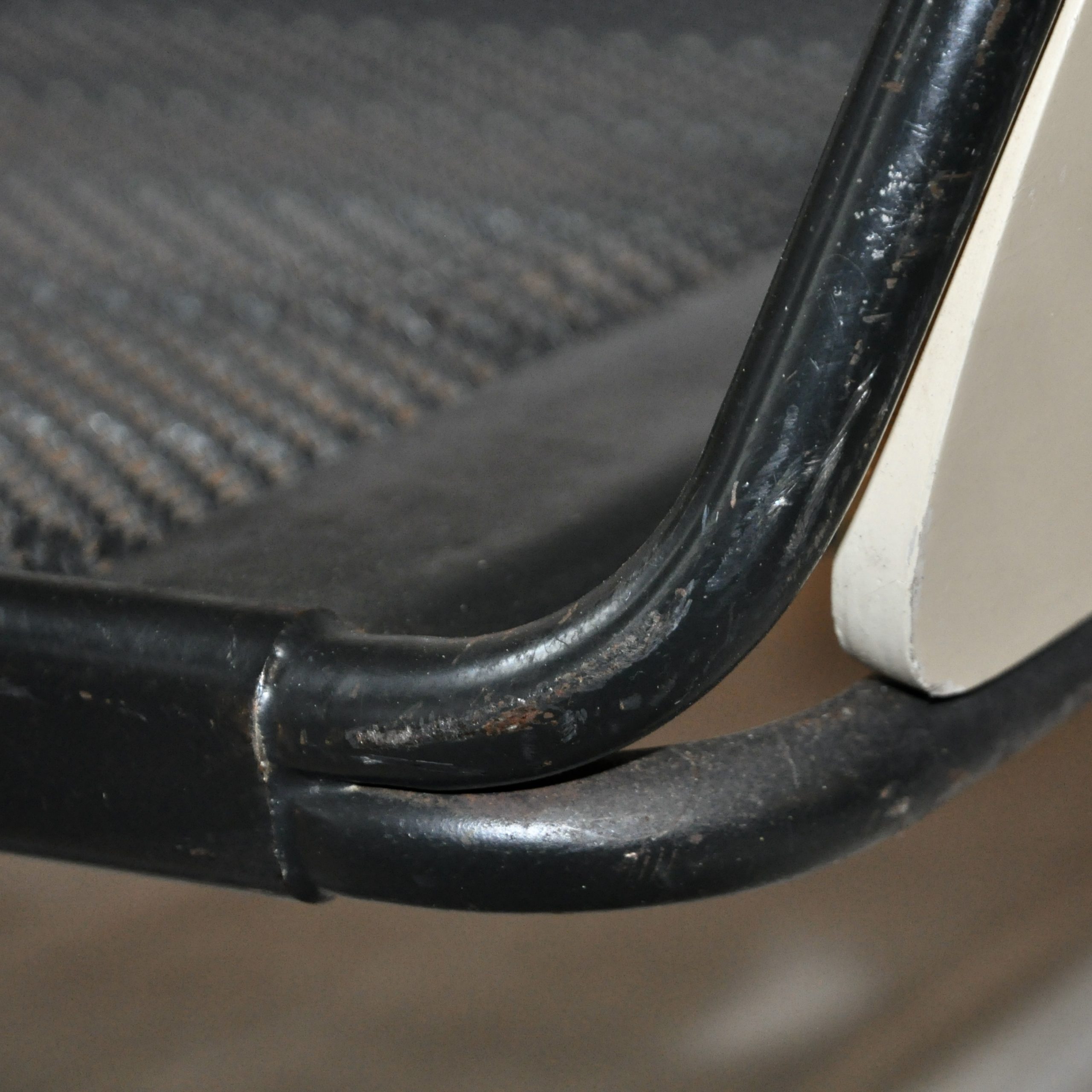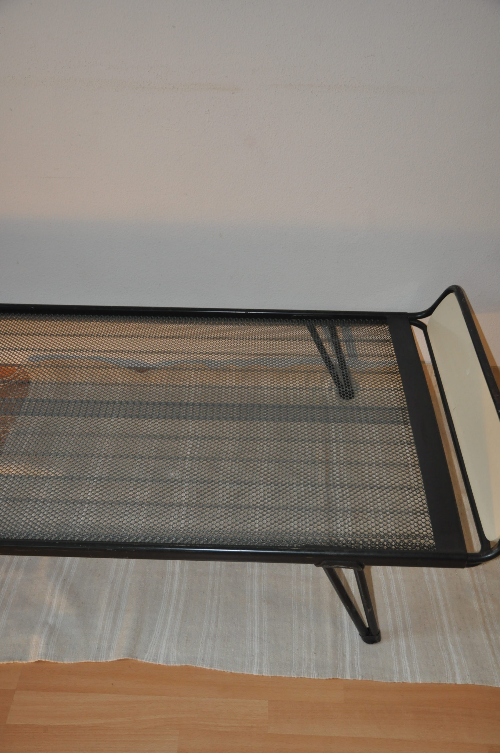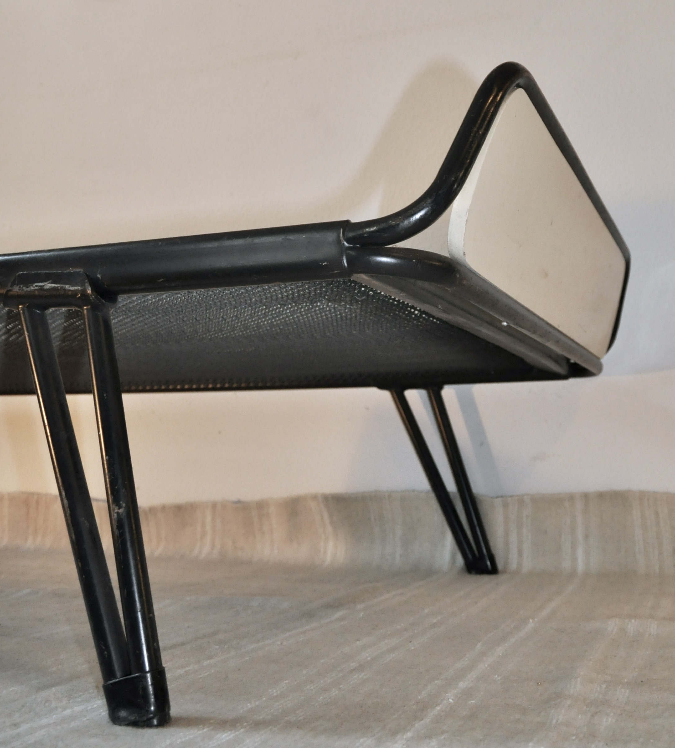 Lit de jour ou daybed en métal datant des années 50-60 pour Auping Pays-Bas. Inspiré du modèle de A.R. Cordemeyer pour la forme, cette version ne possède pas les parties chromées mais est en tout point identique. La structure et les pieds en tubulaire creux sont peints en noir. Ces derniers sont amovibles et recouverts d’un bouchon en plastique. La tête et le pied du lit possèdent chacun une planche en chêne peint en blanc intégré dans la structure. Il y a des traces d’usure sur la peinture.
