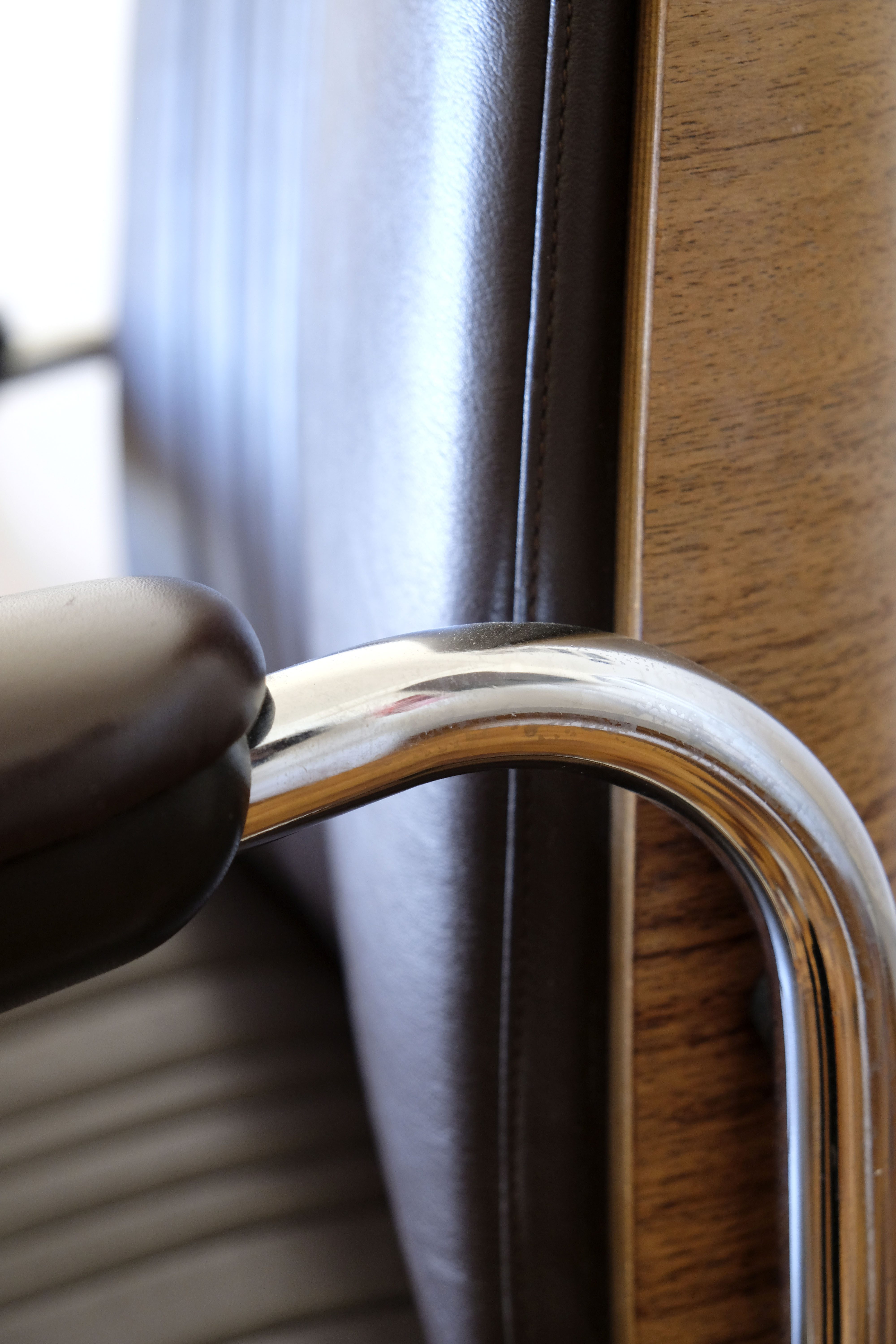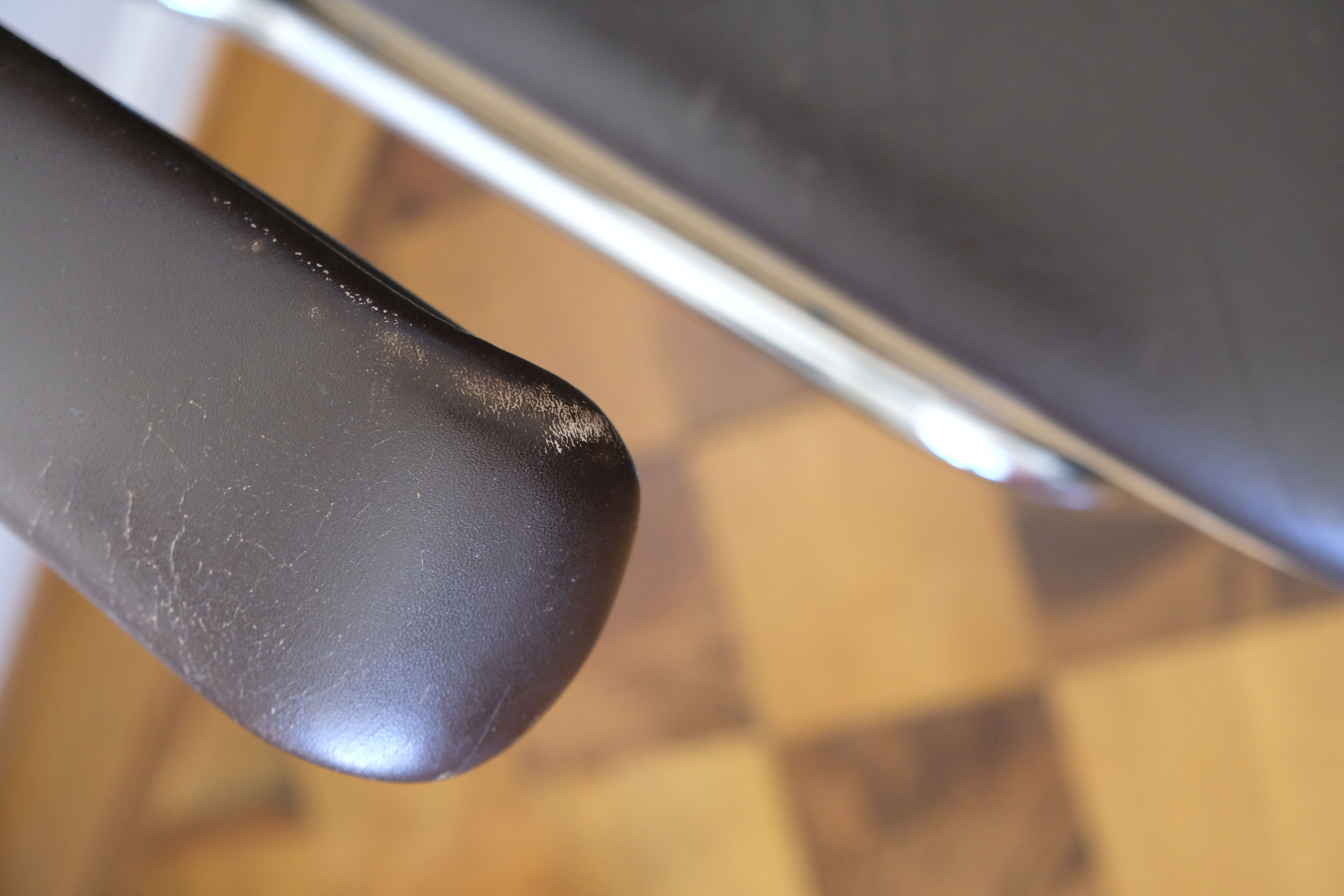 Le cuir porte quelques traces d’usures sur les accoudoirs mais le fauteuil est en très bon état.