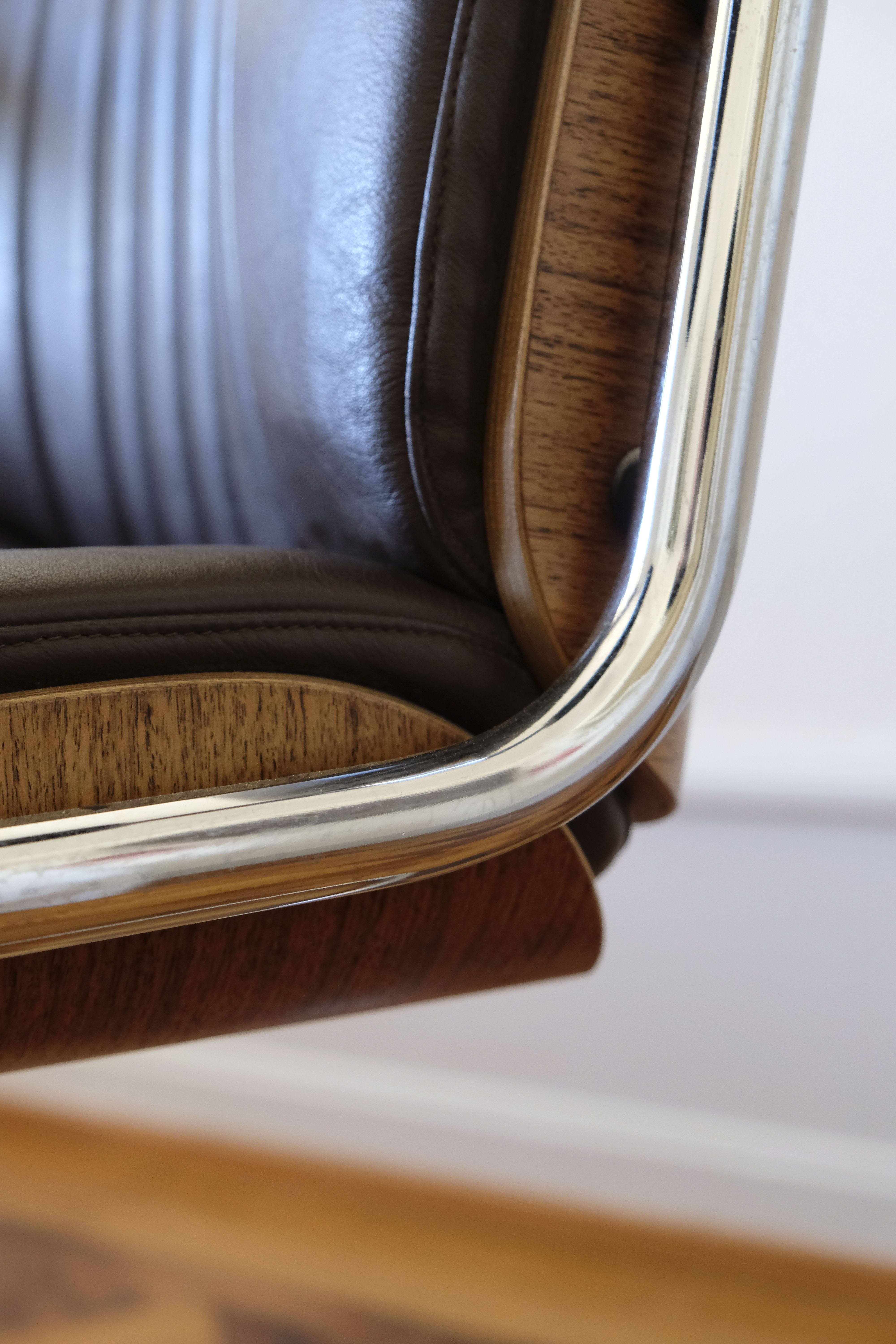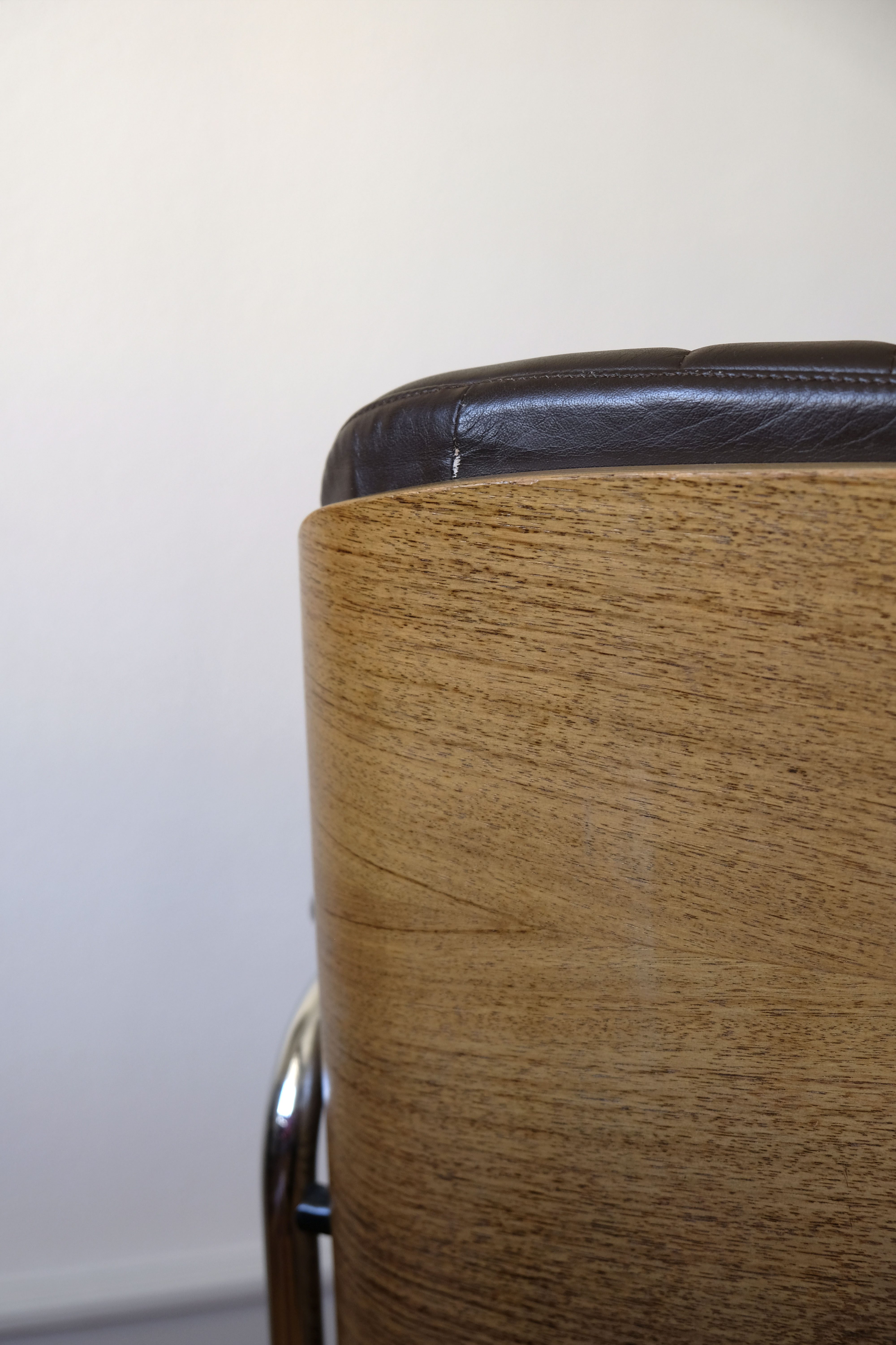 Verkauftes ProduktCoque en bois stratifié moulé avec assise et dossier en cuir brun.