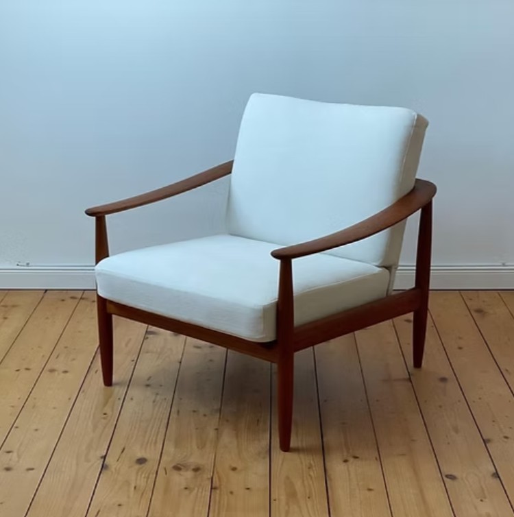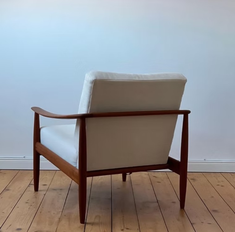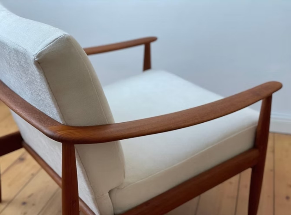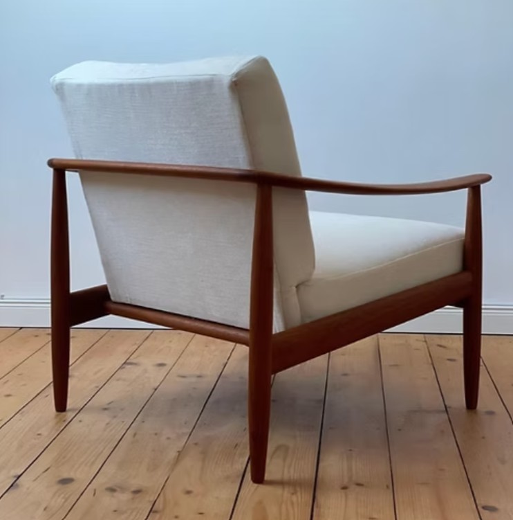 Le piètement en bois de teck massif a été restauré et le système de mousses rigides pour le dossier conservé.