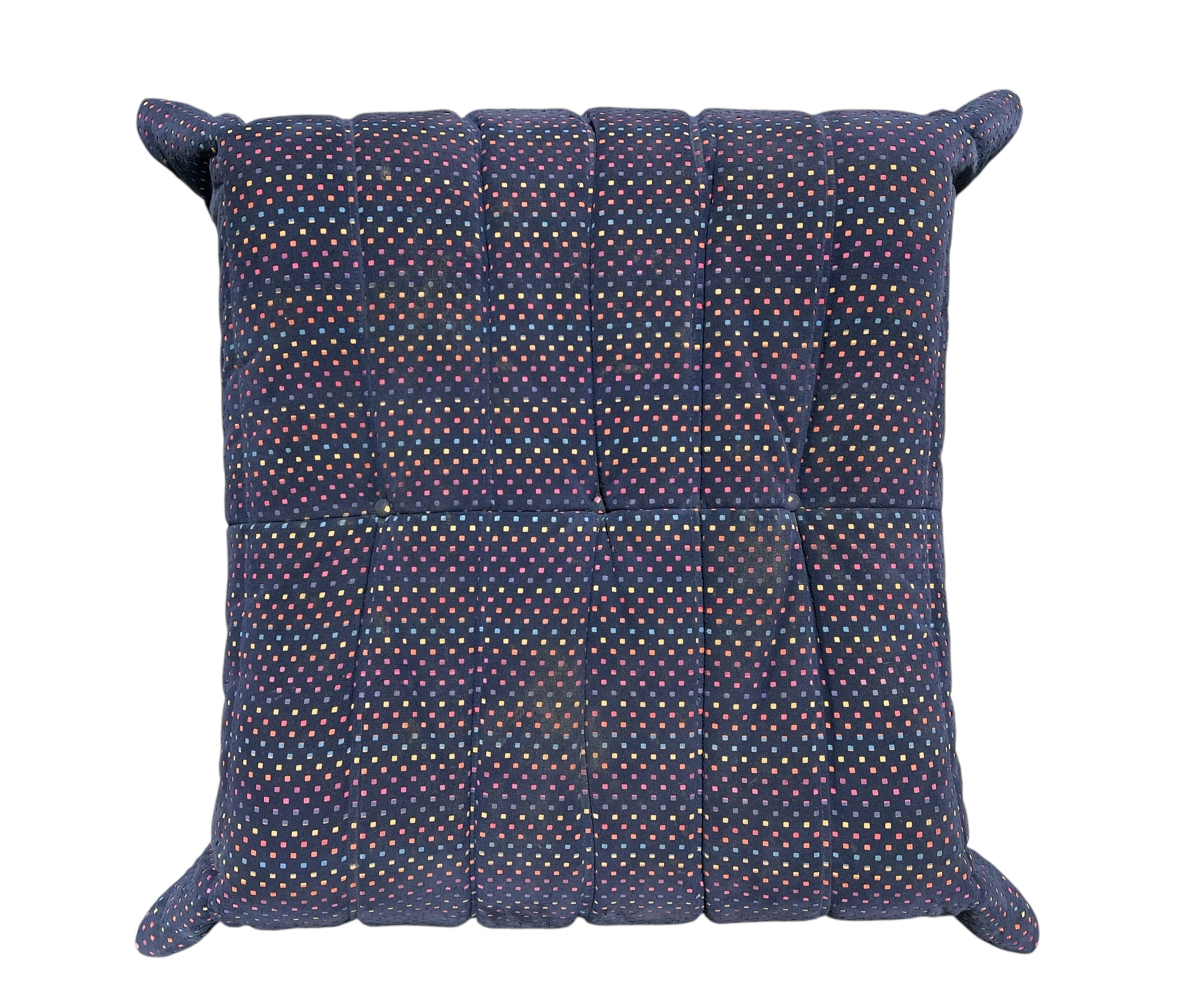 Rembourrage en mousse de polyuréthane habillé d’un tissu en alcantara bleu nuit habillés de motifs aux carreaux nuancés de couleur.