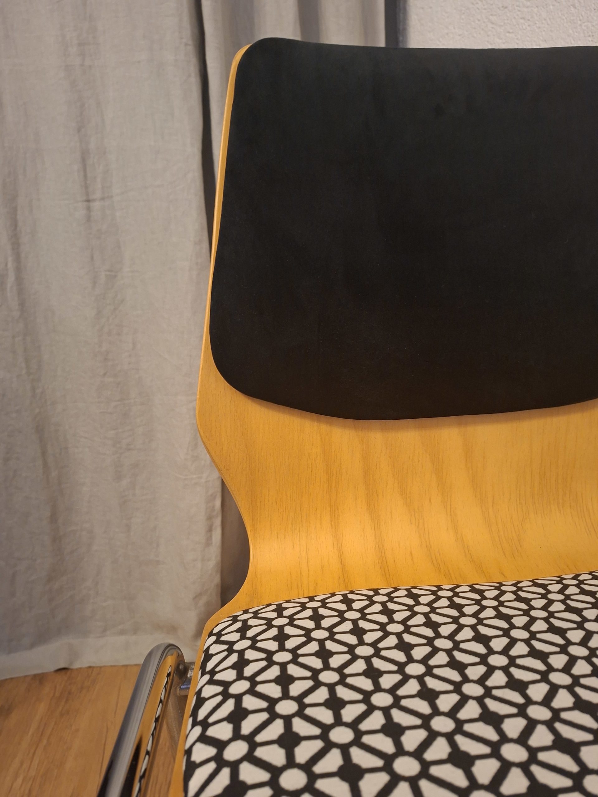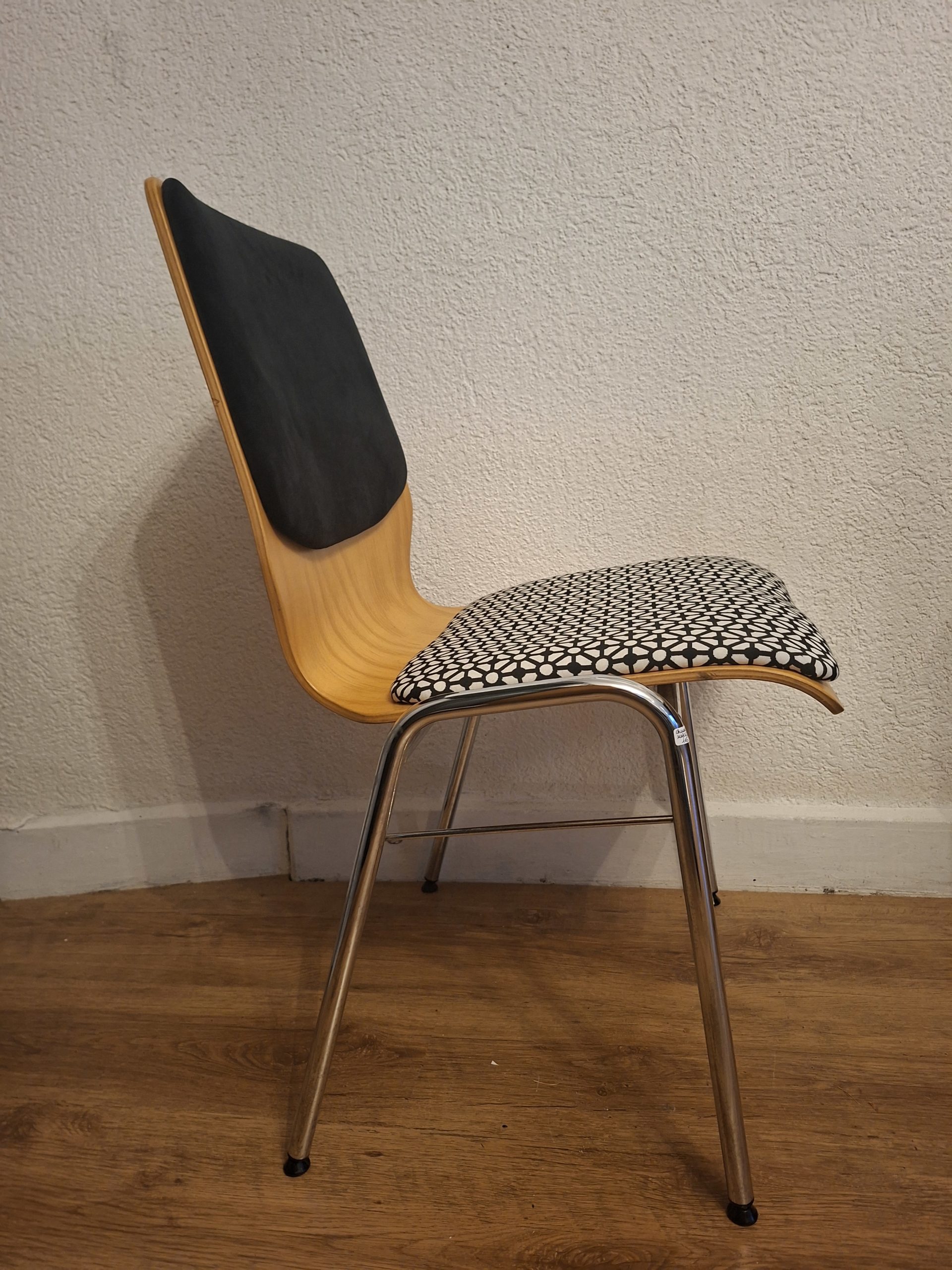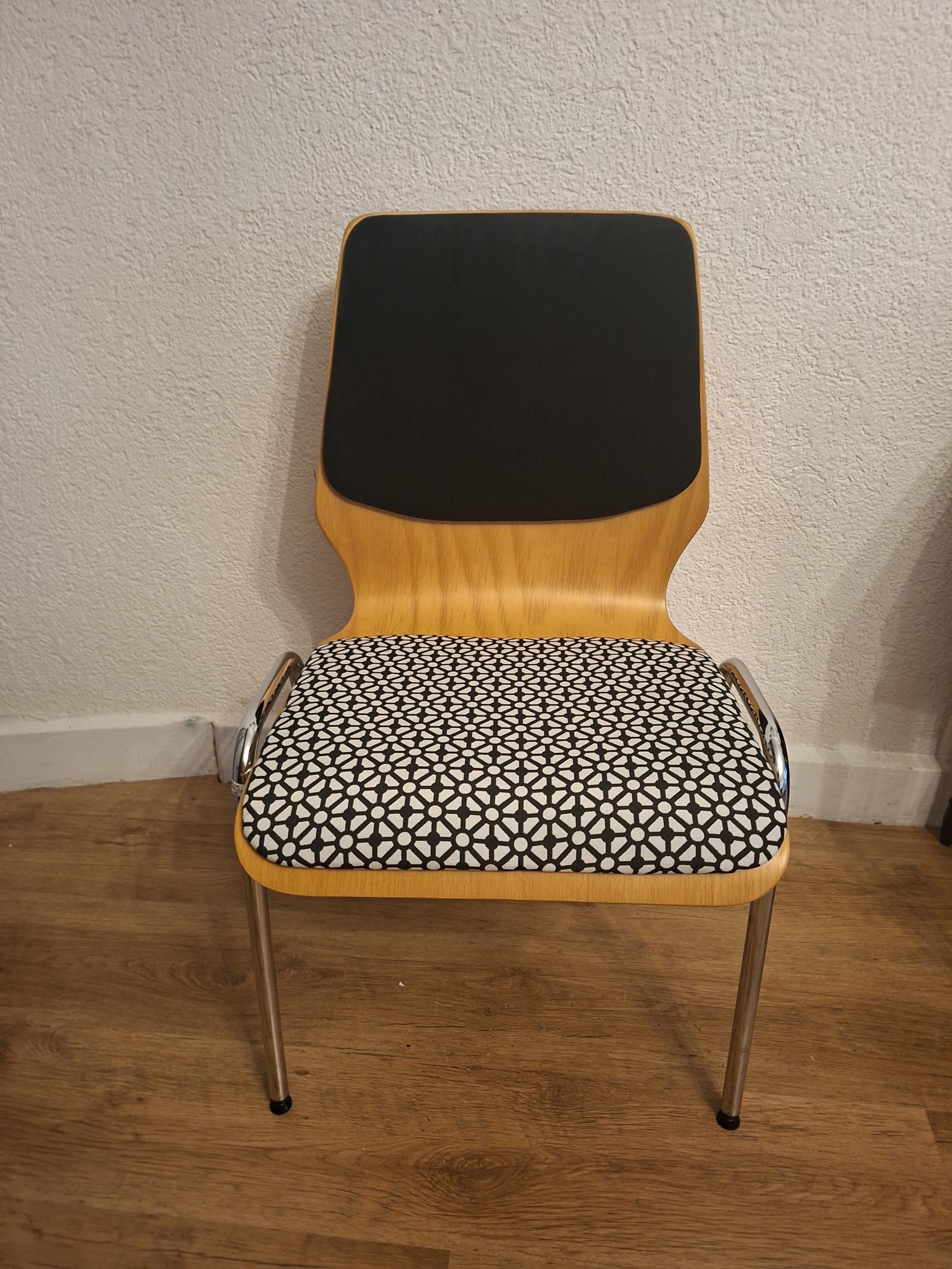 Chaise vintage année 60, le tissu a été entièrement changé. Piètement métal tubulaire chromé et une coque moulée (chaise empilable).