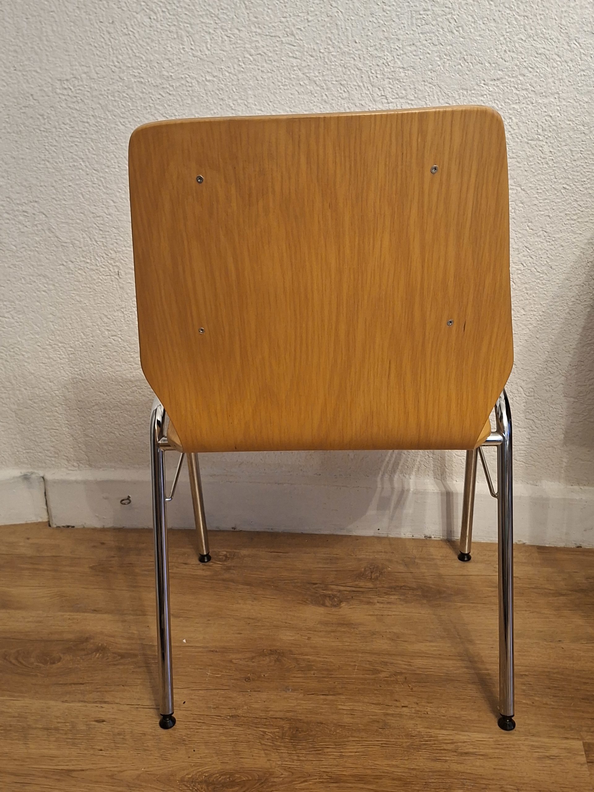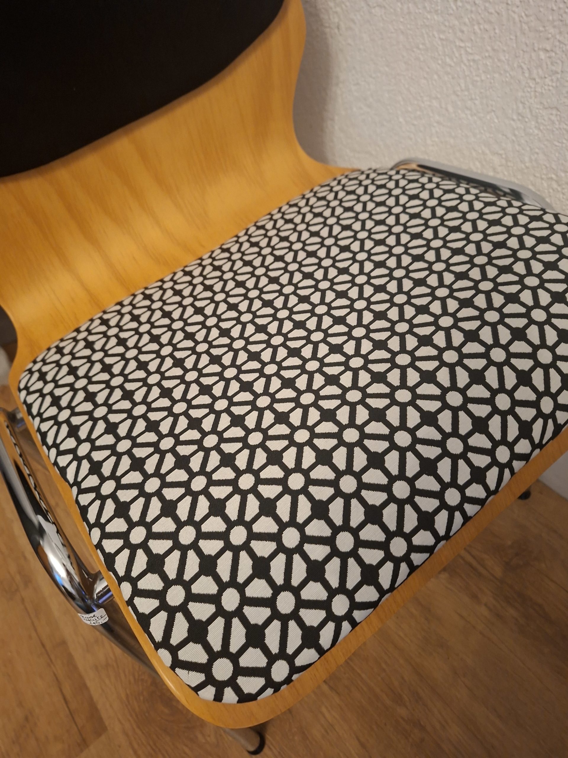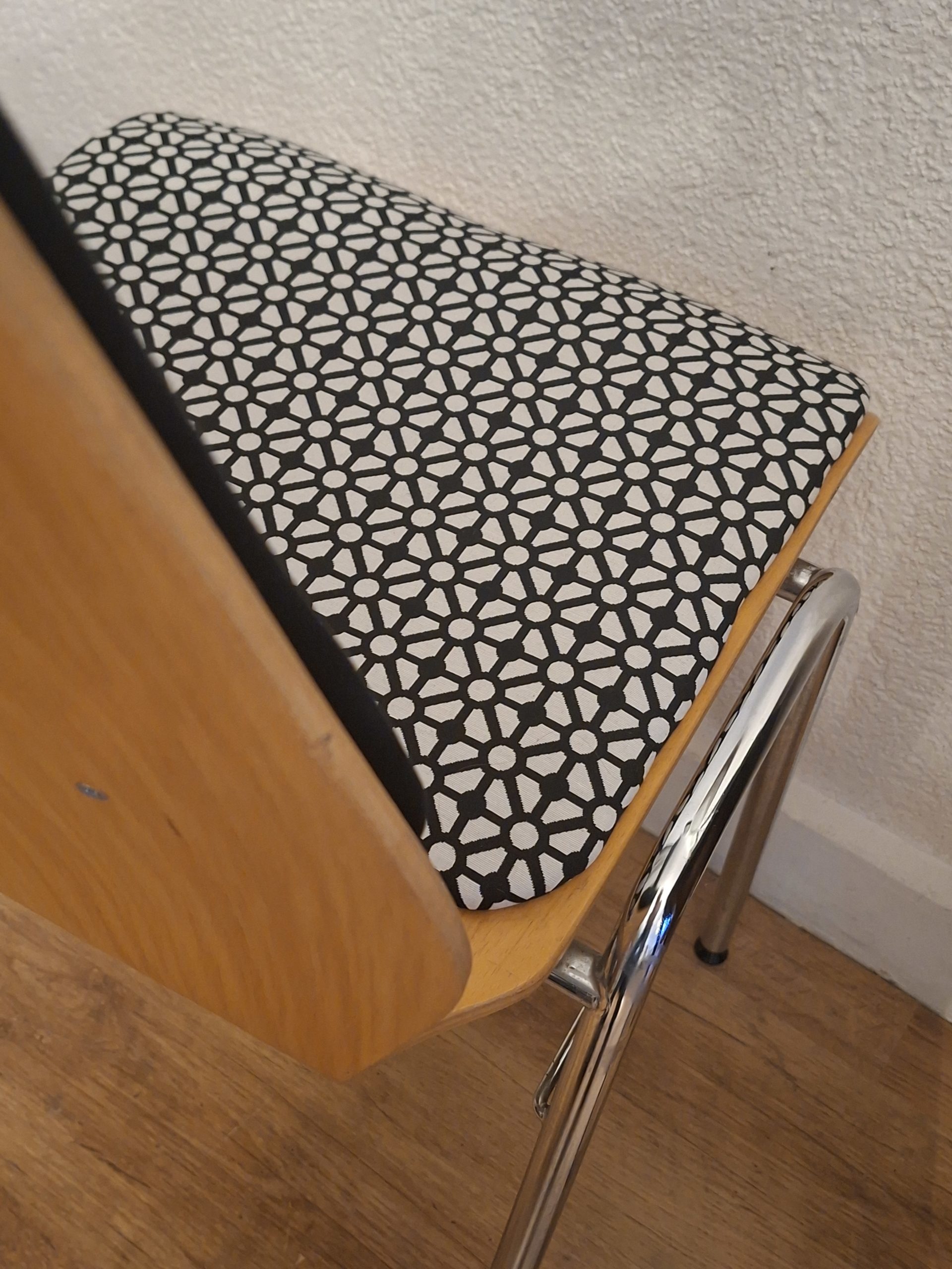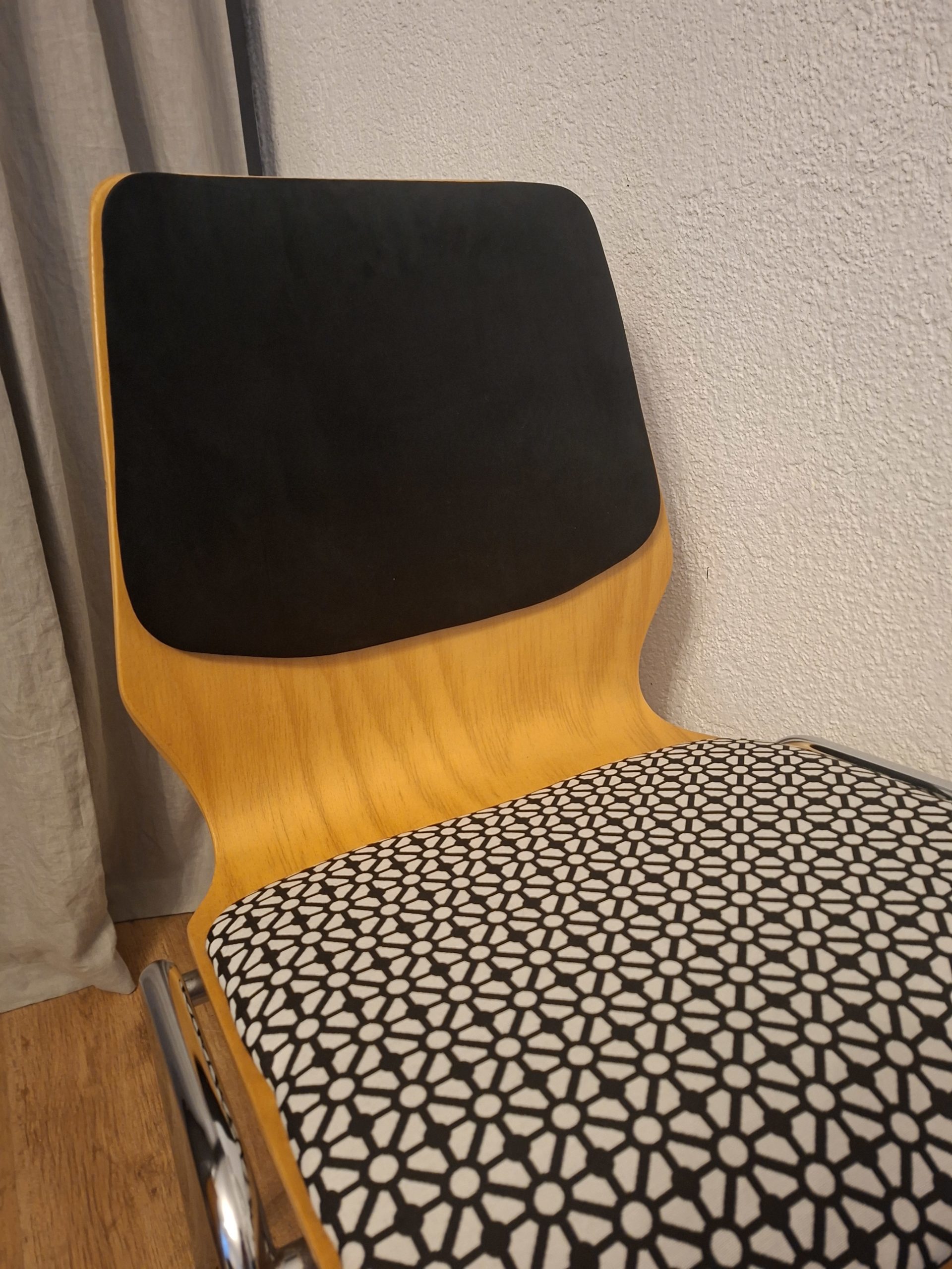 Chaise vintage année 60, le tissu a été entièrement changé. Piètement métal tubulaire chromé et une coque moulée (chaise empilable).
