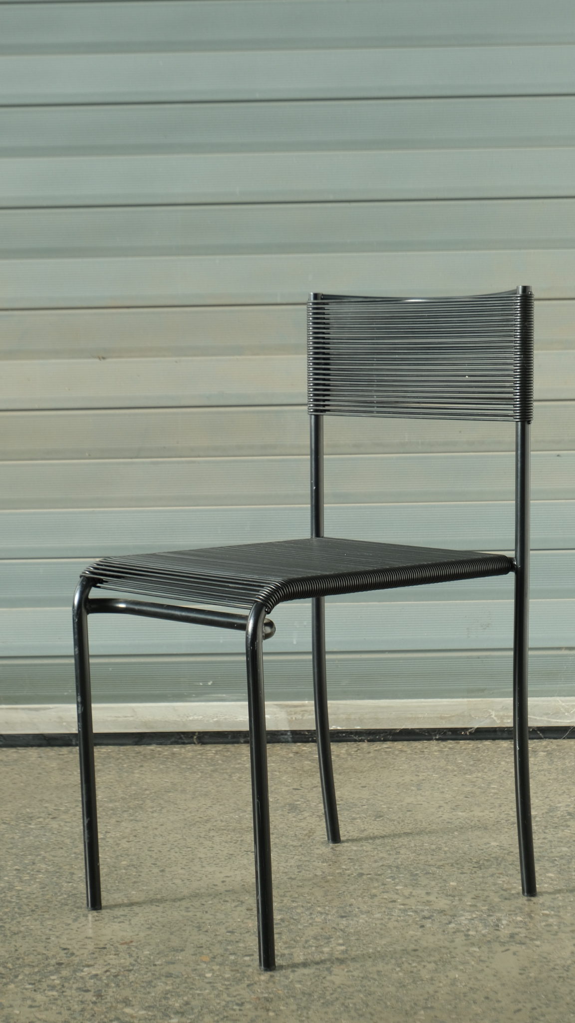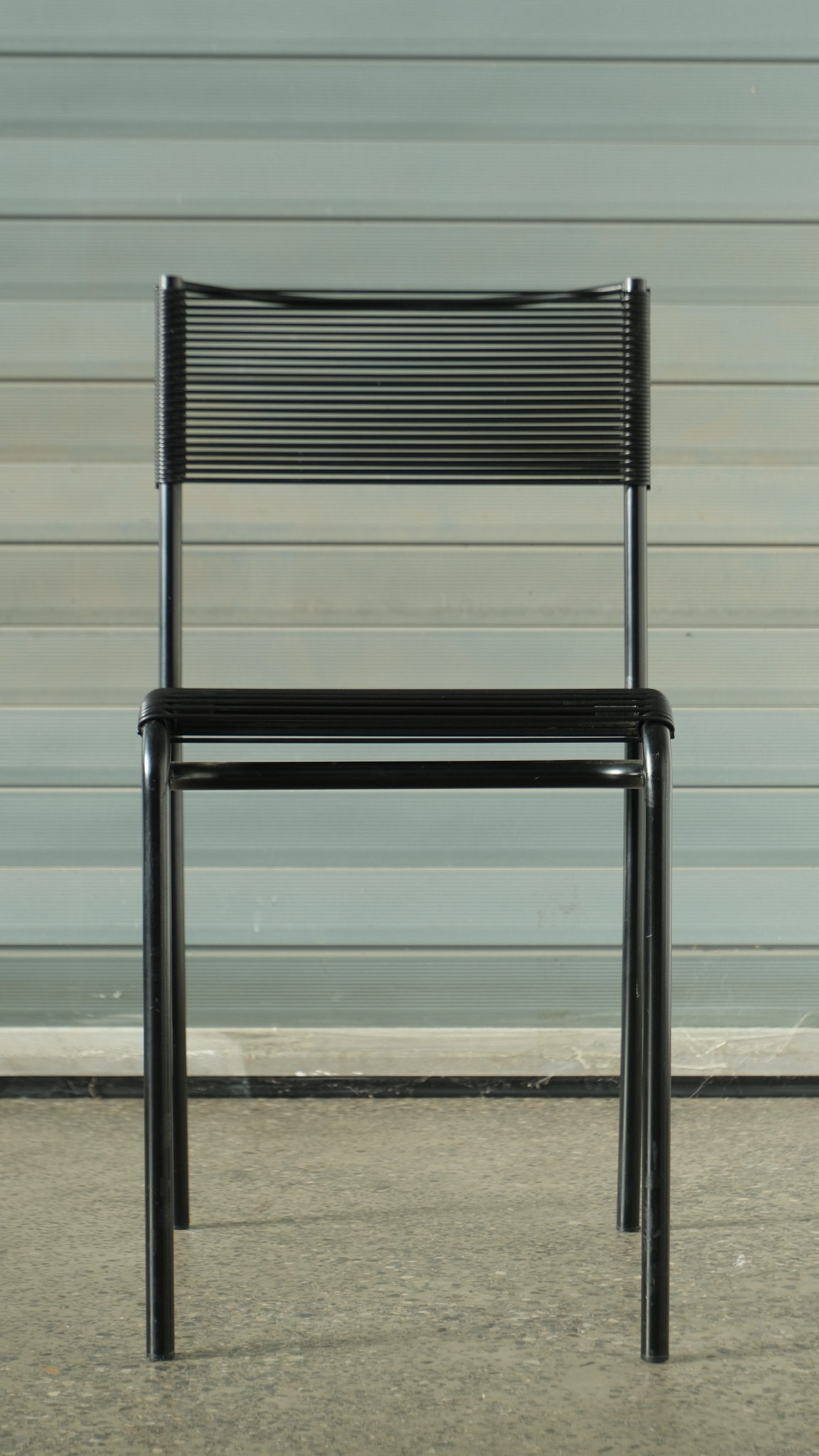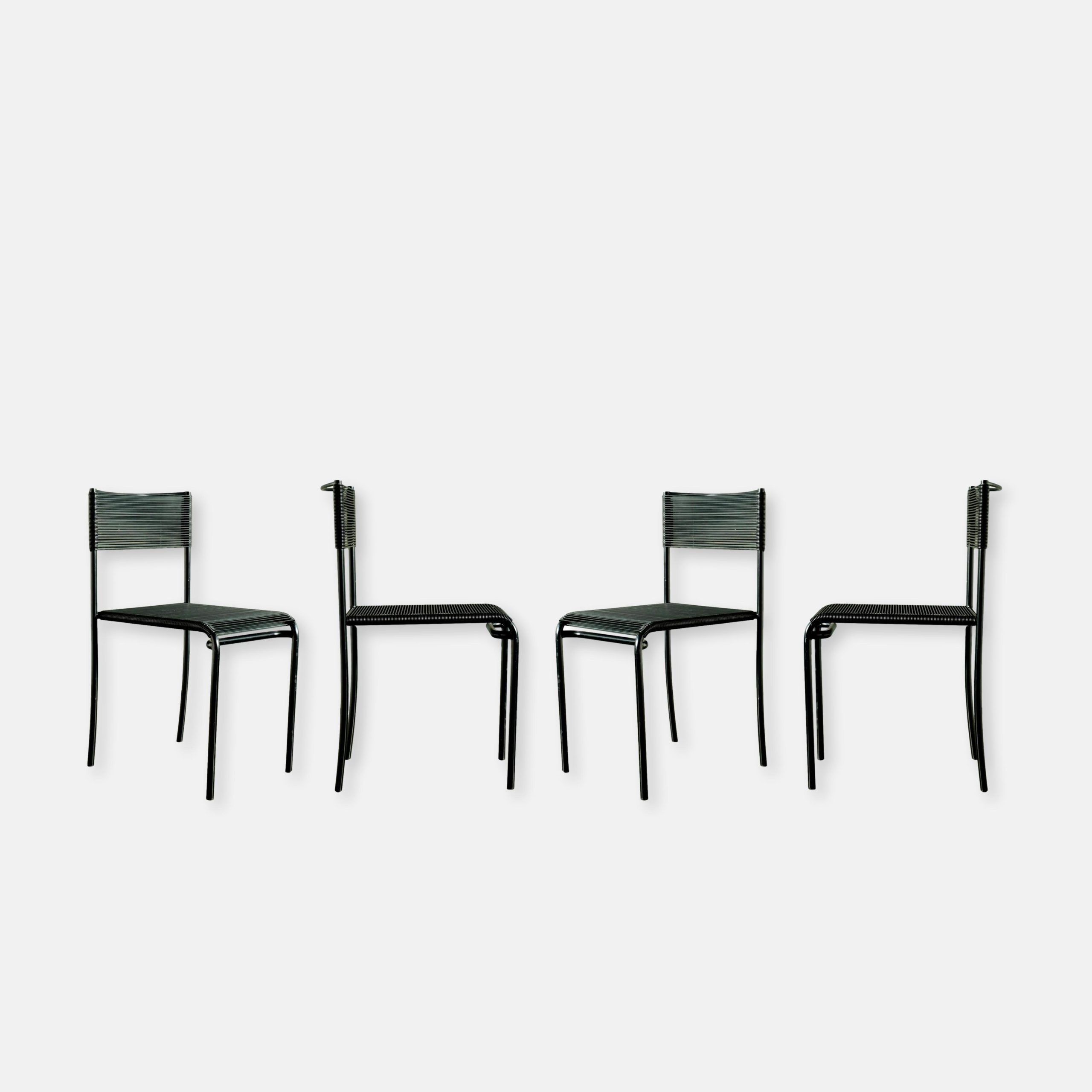 Verkauftes ProduktGiandomenico Belotti (Italian, 1922 – 2004) for Alias « Spaghetti Chairs » (designed 1979) , set of four, each with black frame supporting latex « spaghetti ». In good vintage condition.