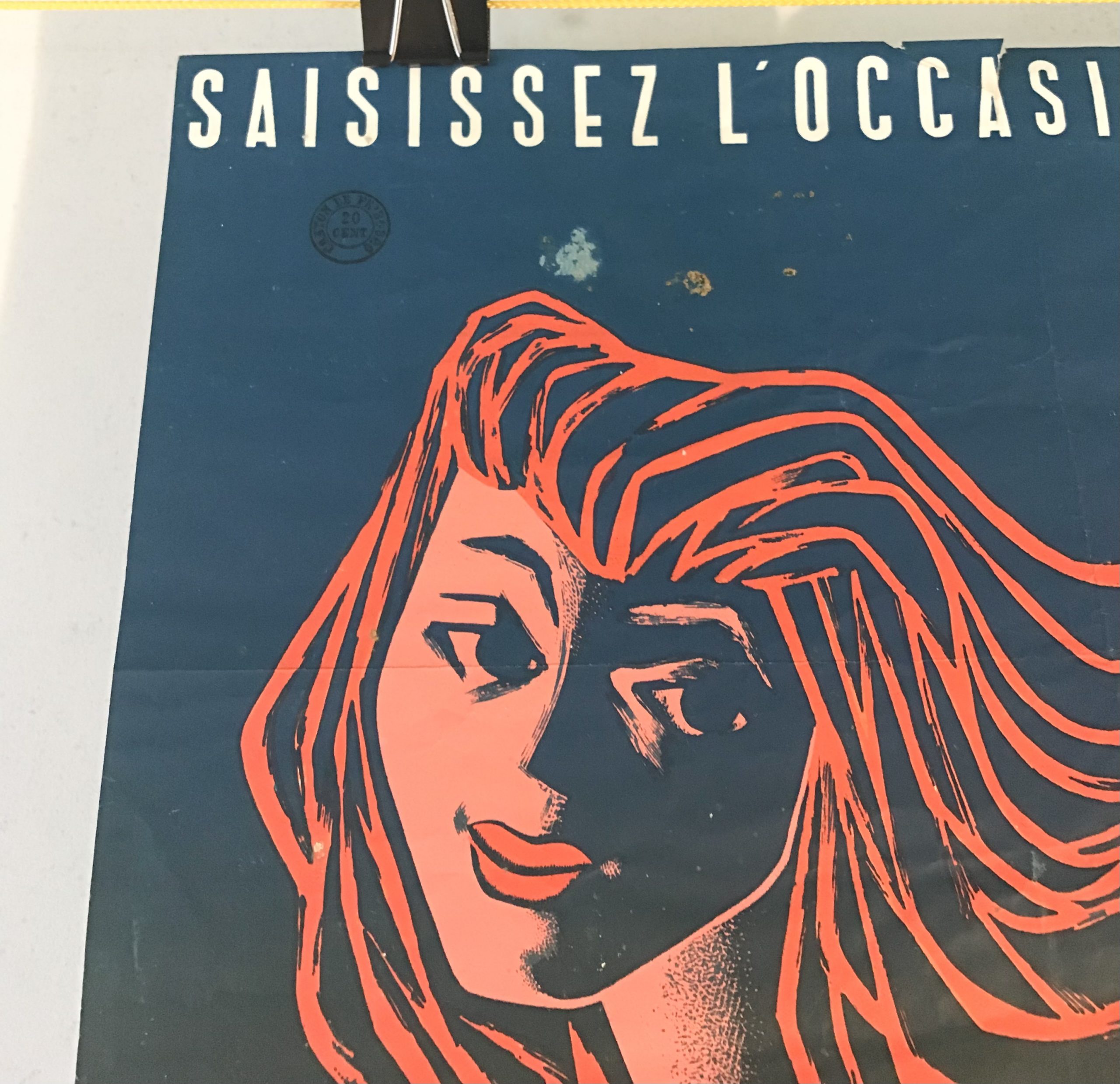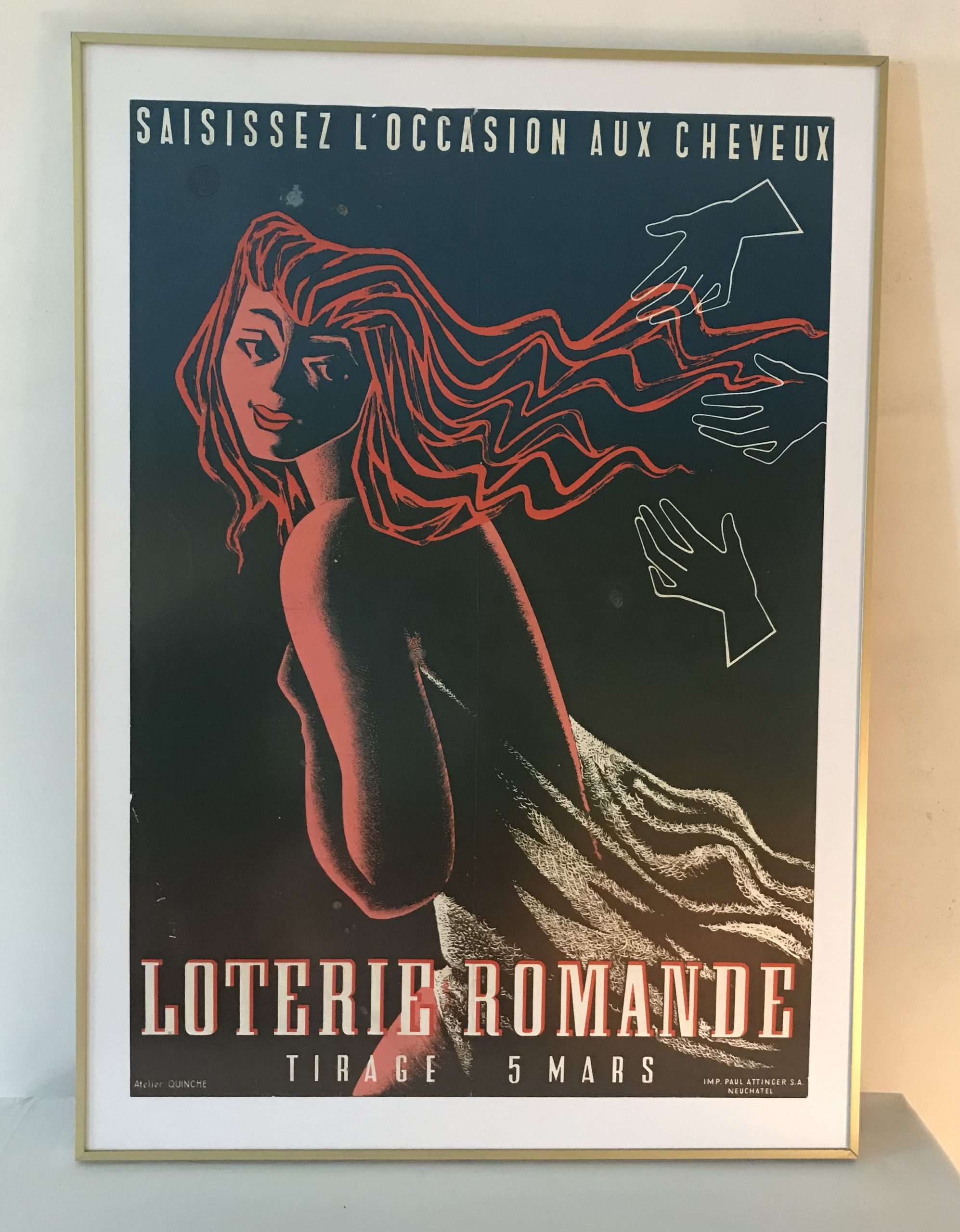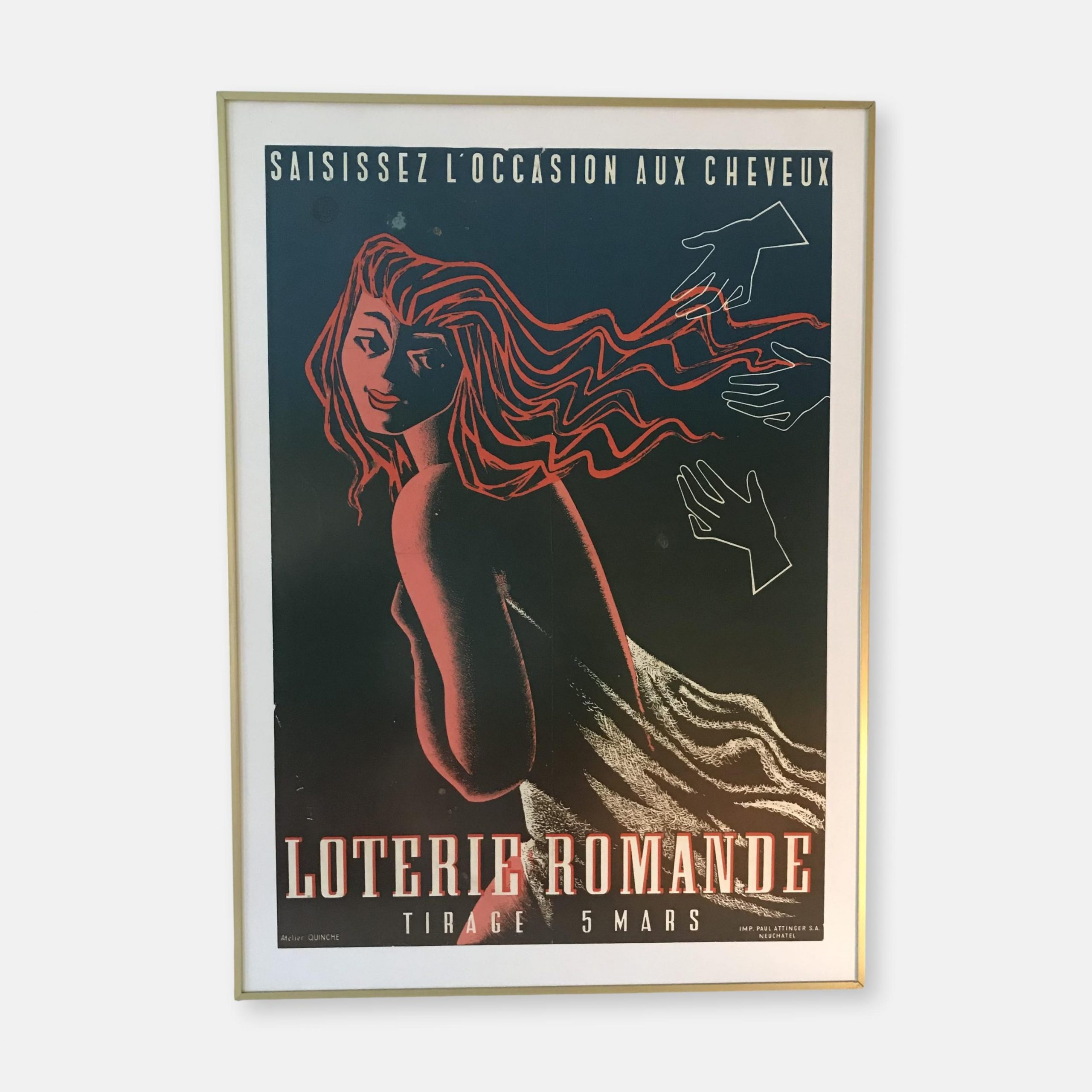 Produit venduAffiche (lithographie) de la Loterie Romande, tirage du 5 mars 1949. « Saisissez l’occasion aux cheveux », par l’atelier Quinche. Bon état général, quelques marques d’usure sur les bords et autres (voir photos). Vendue avec cadre.
