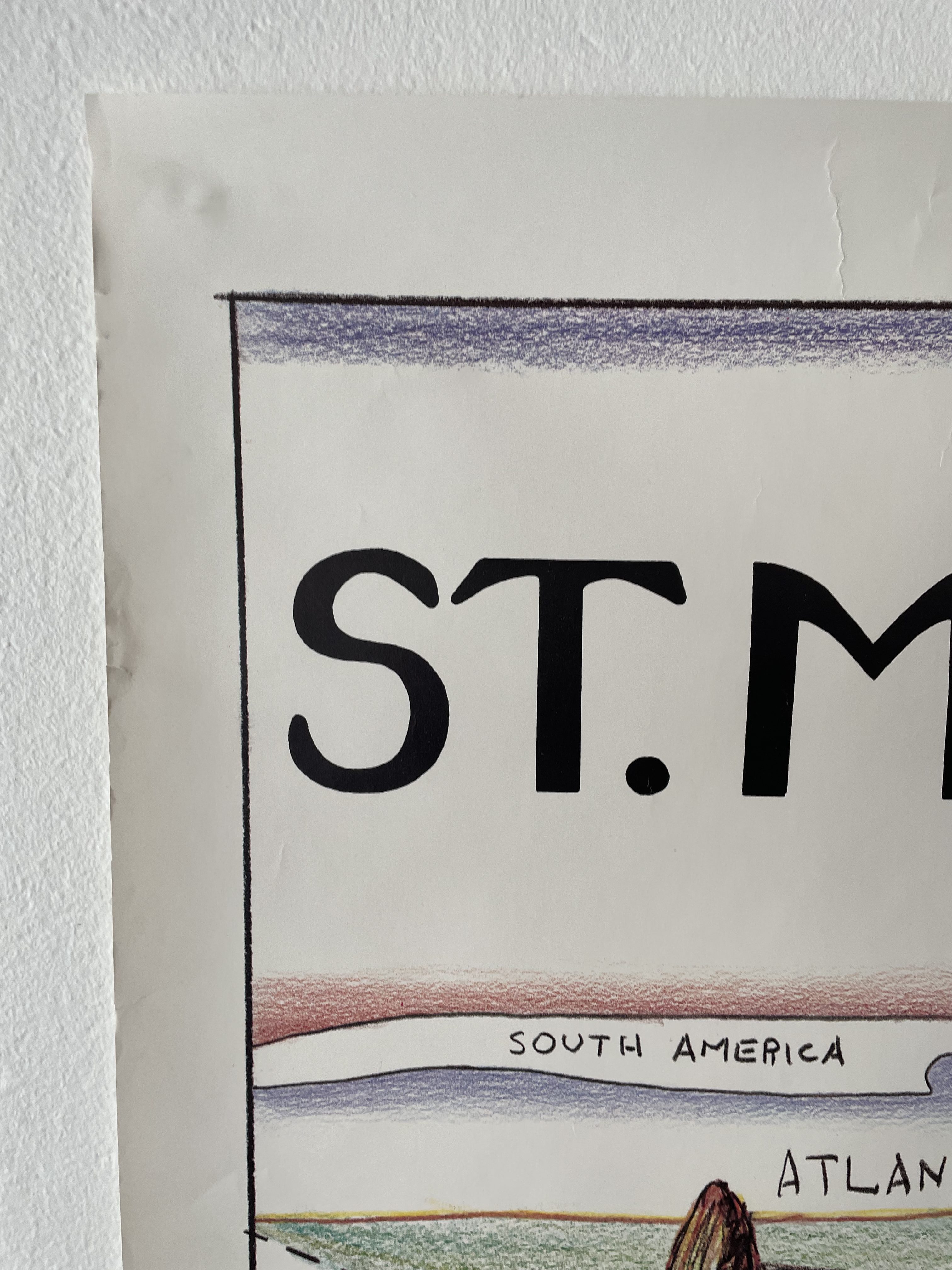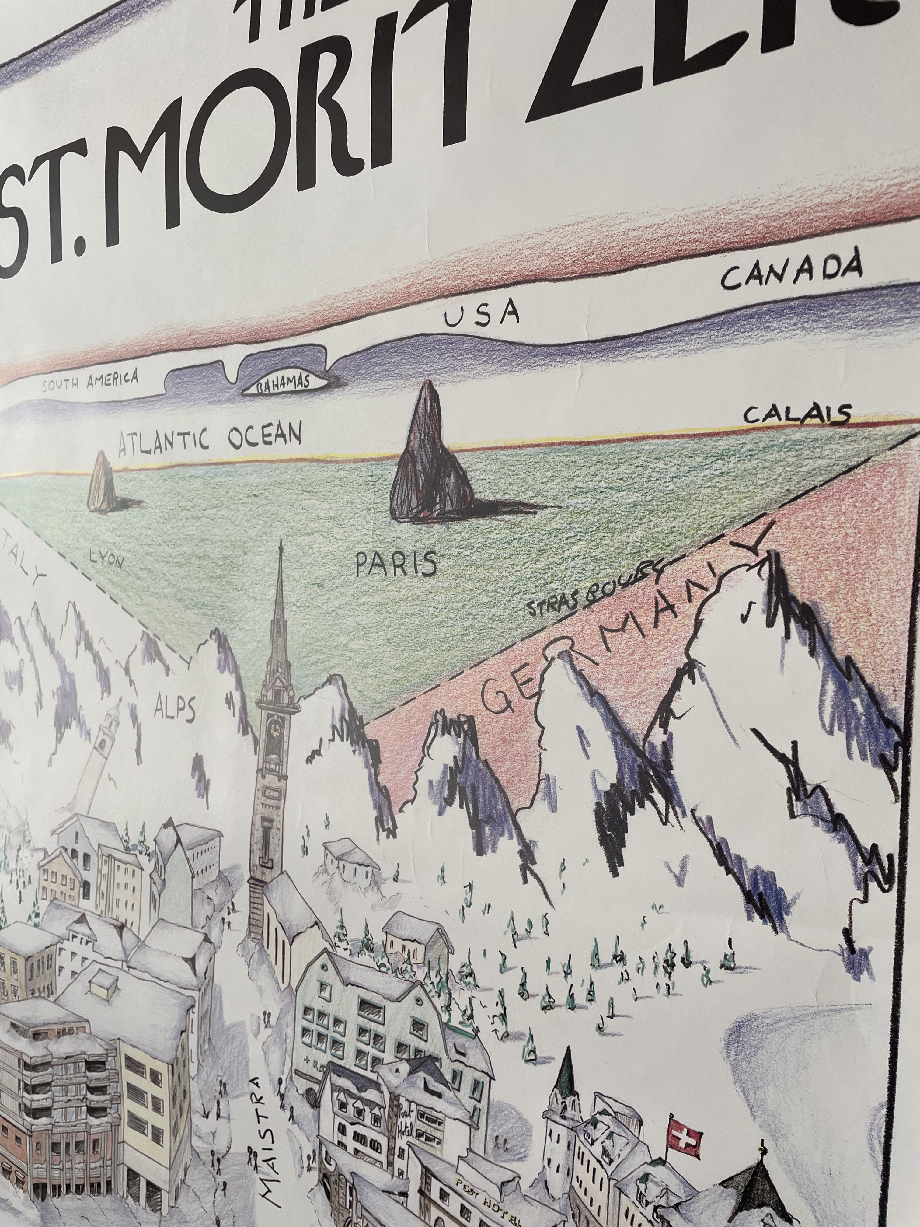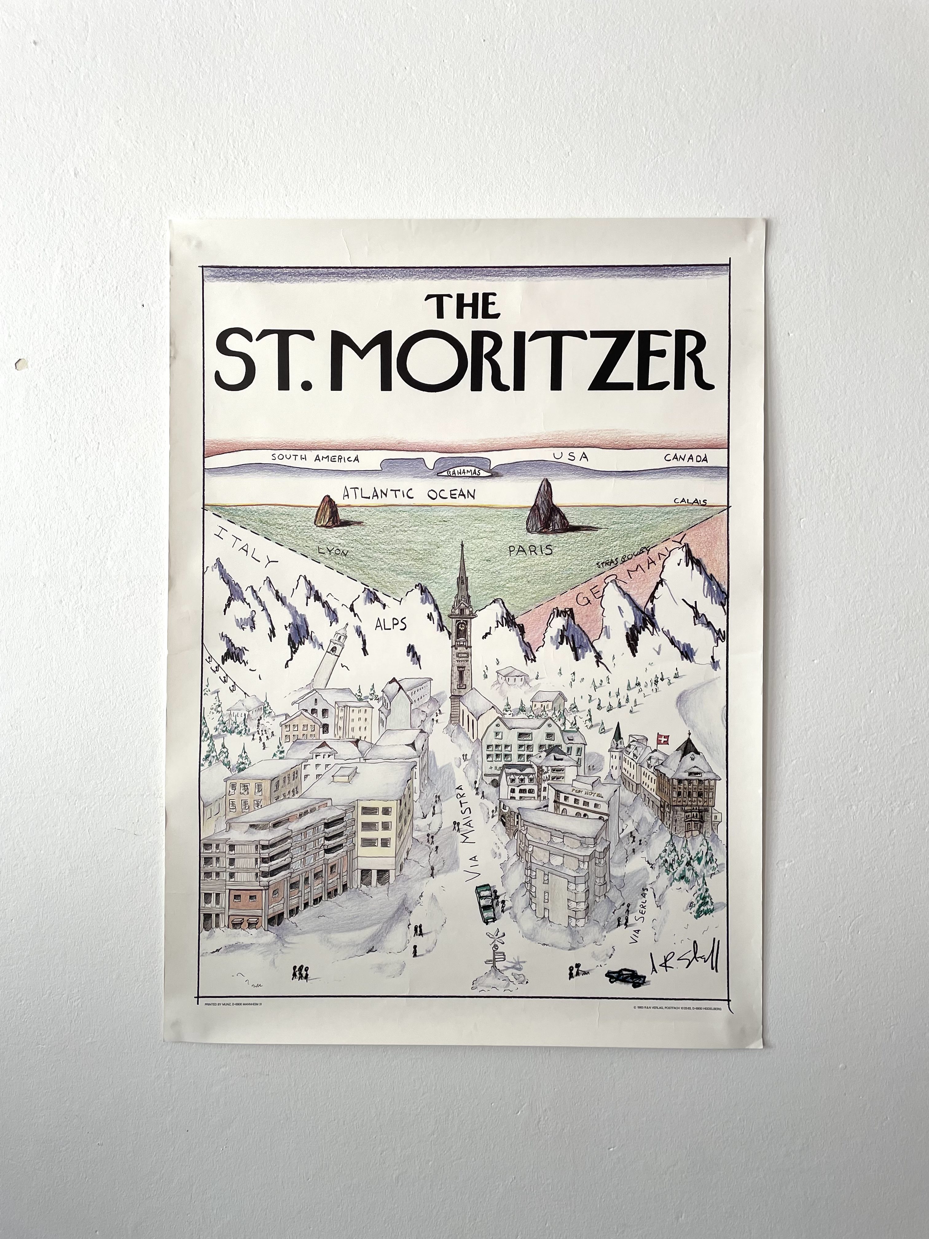 Produit venduGrande affiche St Moritzer de 1983 inspirée de l’artiste Saul Strindberg pour The New Yorker.