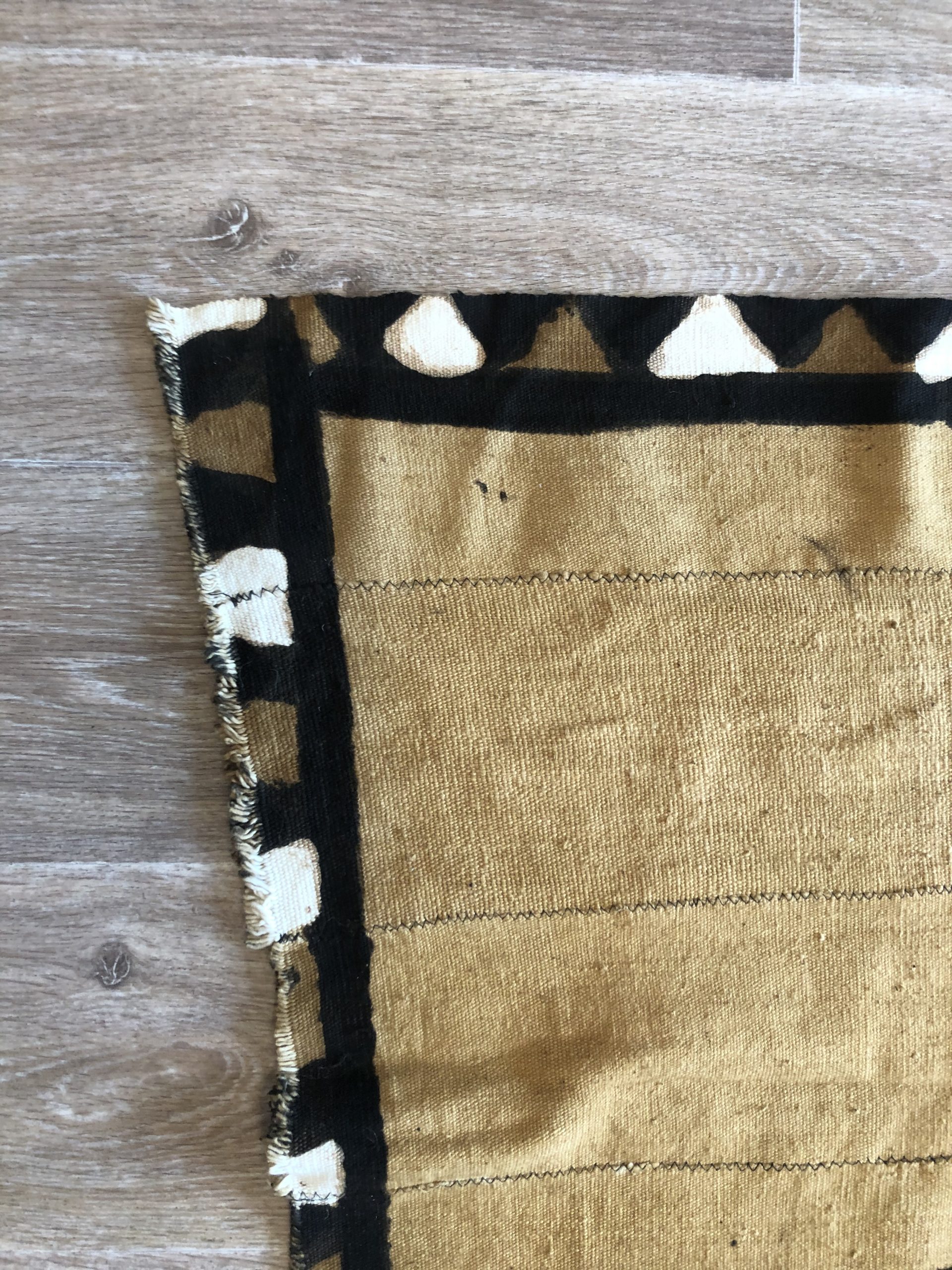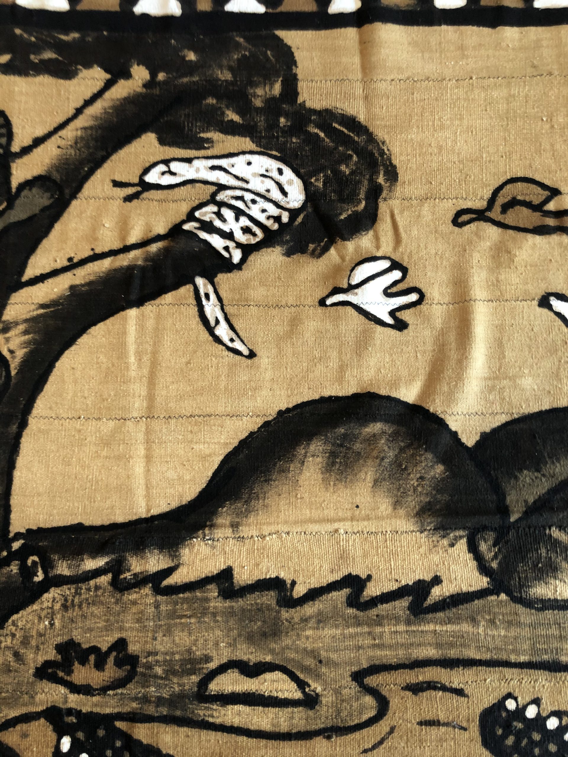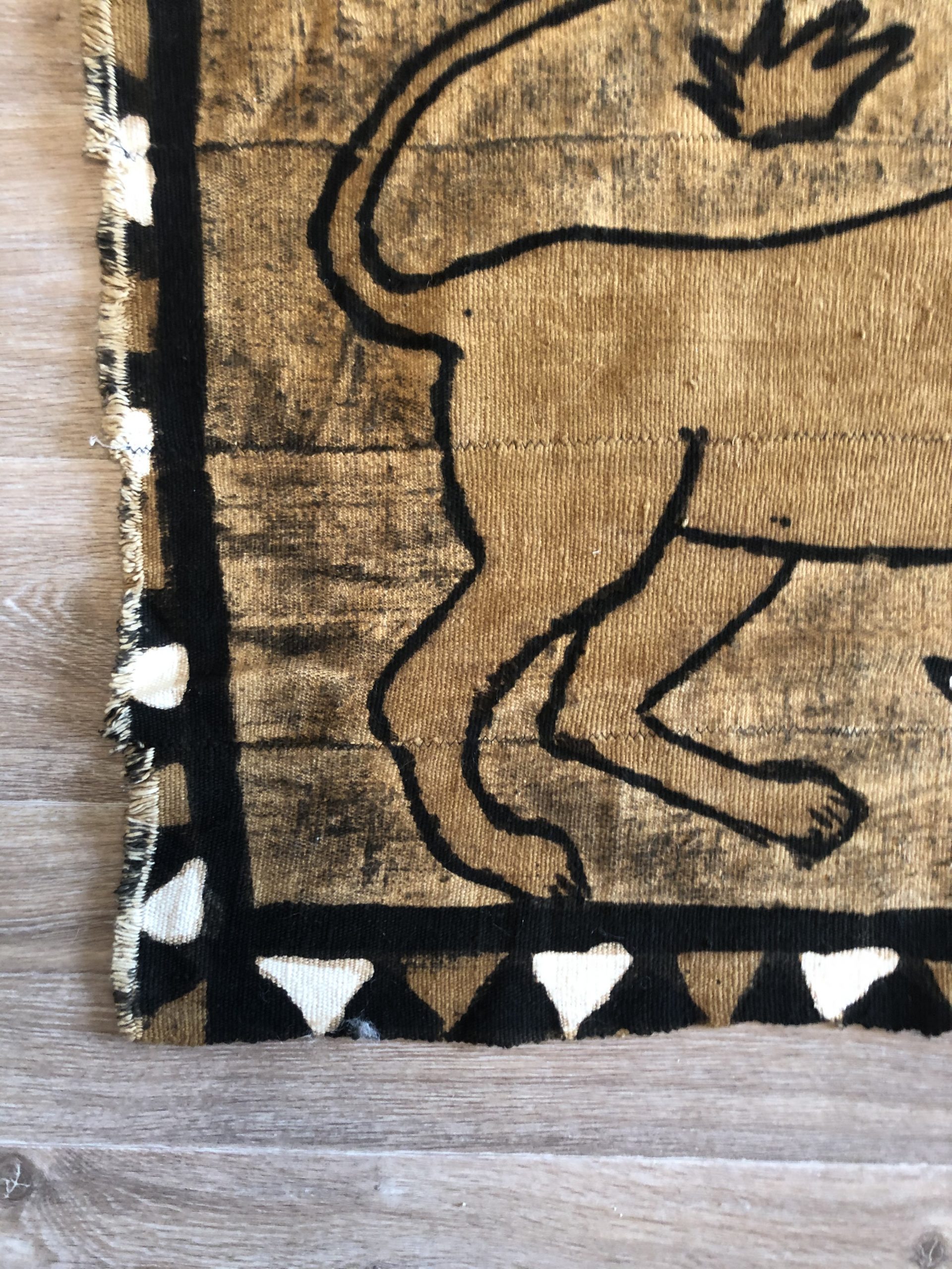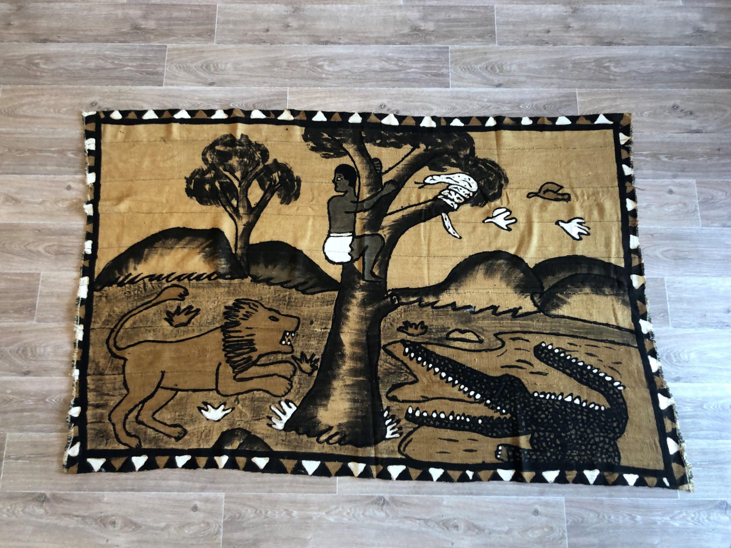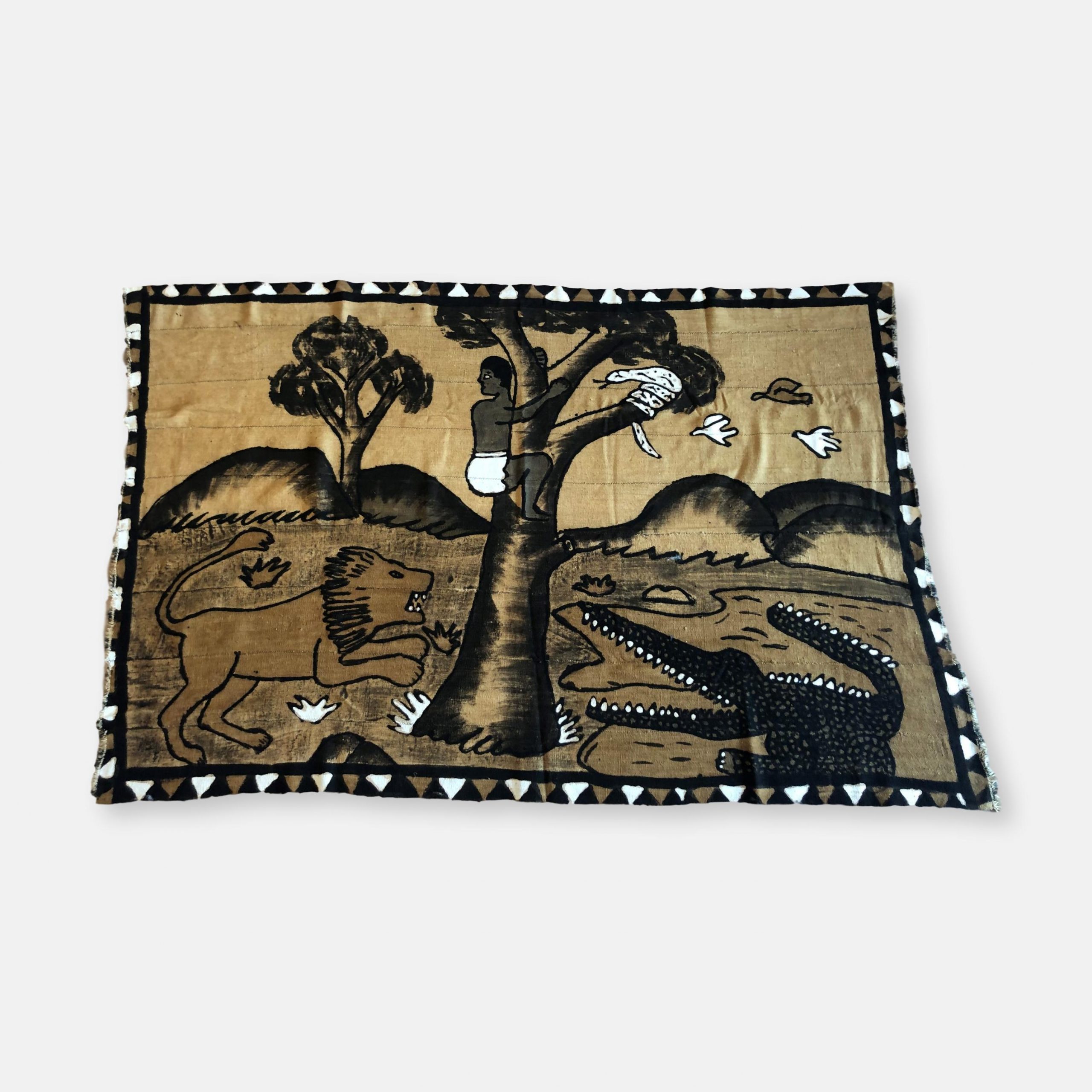 Produit venduSuperbe bogolan du Mali en cotton tissé représentant une scène plutôt drôle ou un jeune homme grimpe sur un arbre pour tenter d’échapper aux animaux qui le poursuivent. Belles dimensions pour cette tenture originale qui peut servir de tete ou jeté de lit, tenture murale et donnera une touche ethnique à votre intérieur. Le bogolan est un tissu Malien réalisé artisanalement et teint avec des peintures végétales (boue, feuilles de bouleau, écorce de mpécou etc). Objet symbolique utilisé dans les rites traditionnels, issu de la terre, il est considéré comme porteur d’énergie vitale et protège celui qui le porte.