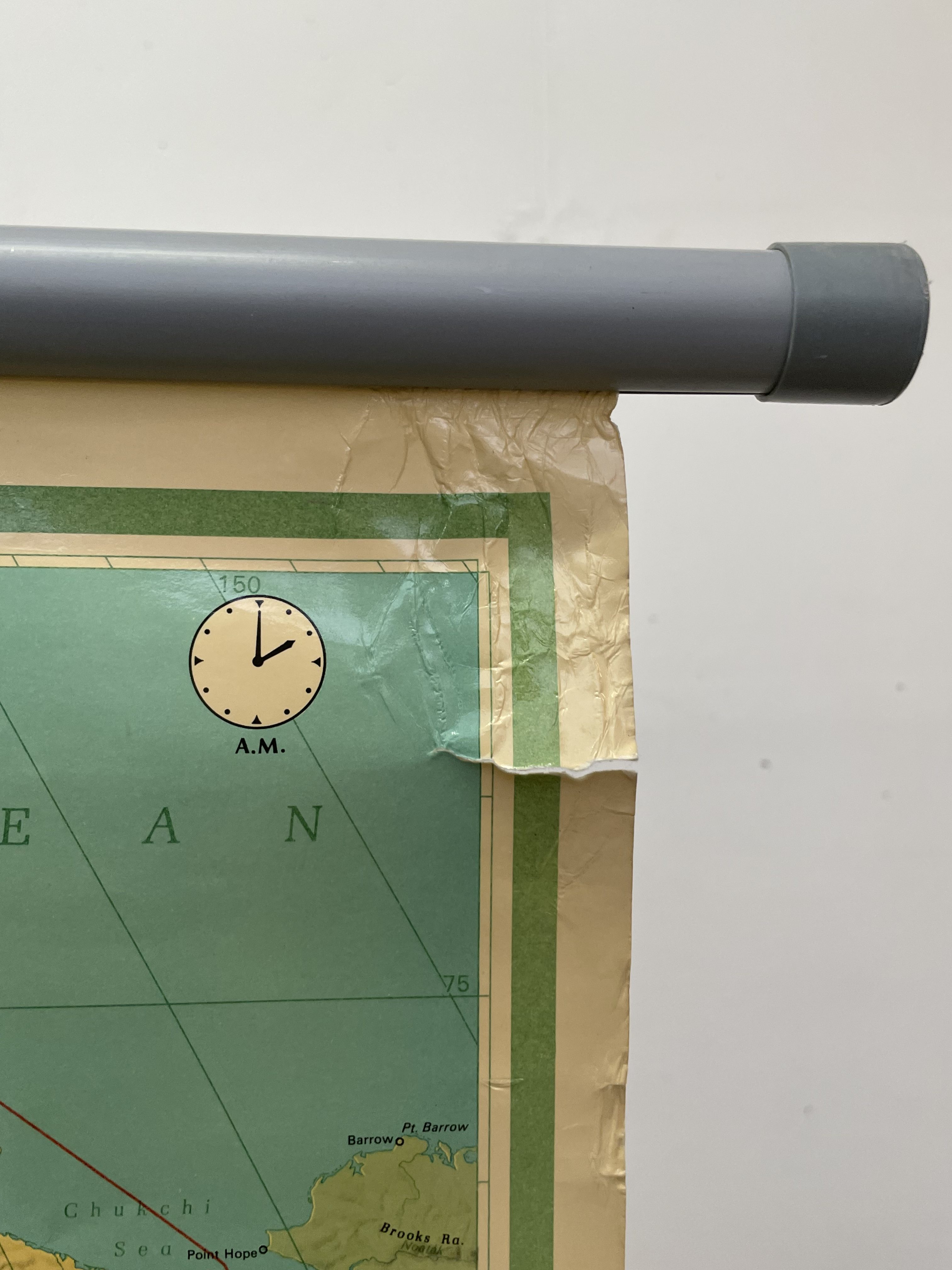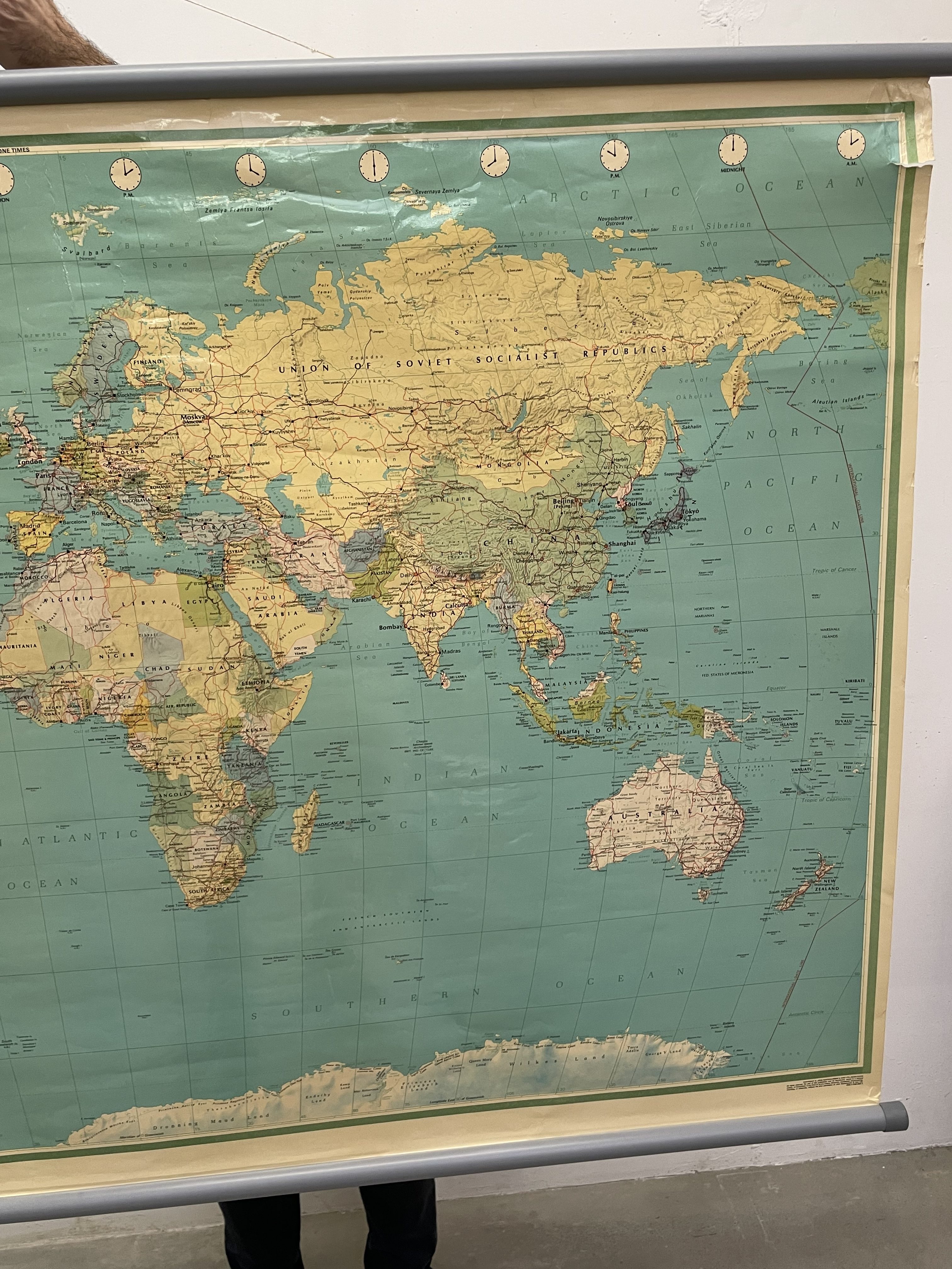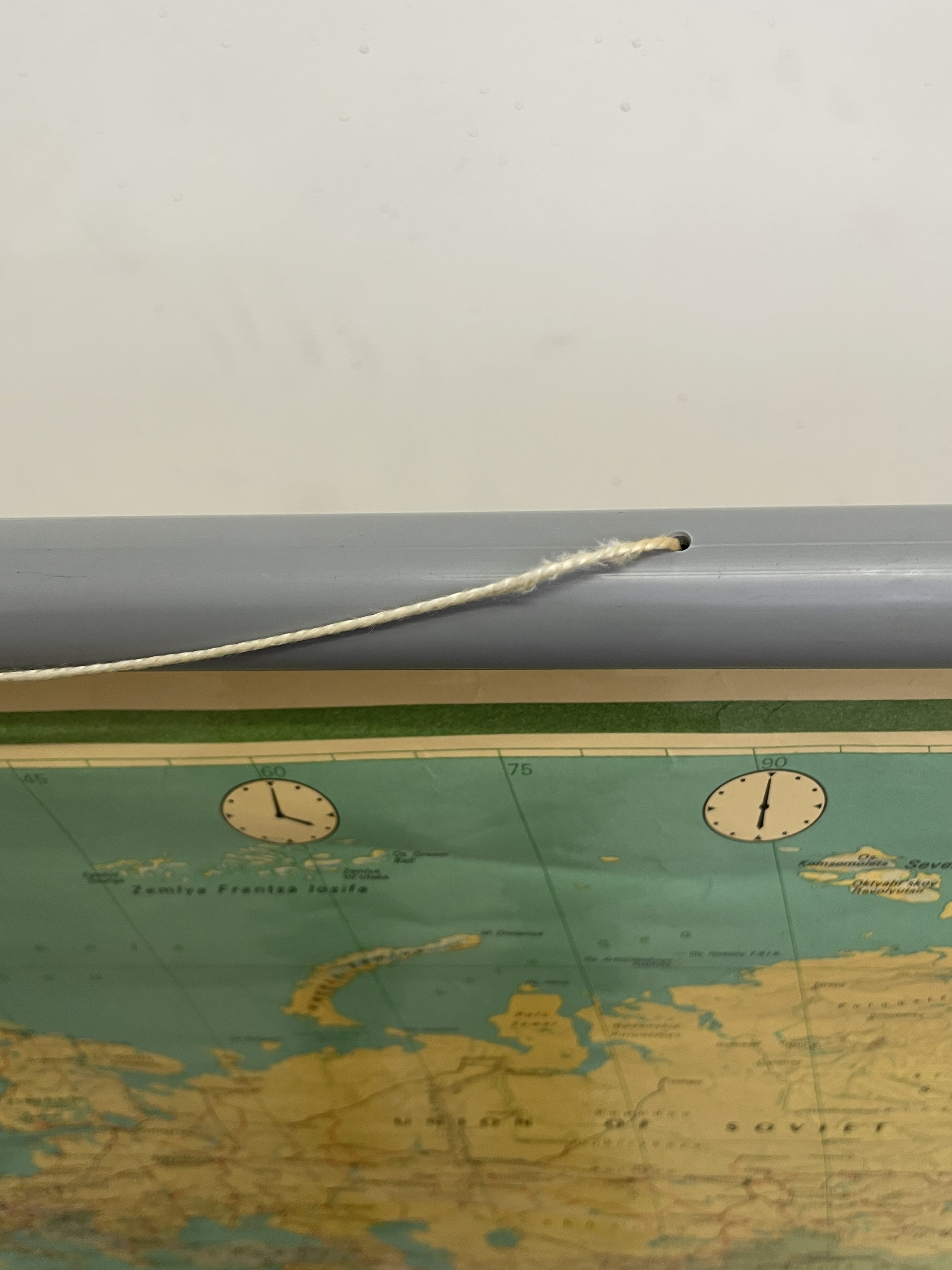 Carte du monde datant environ des années 80. Une ficelle permet de l’accrocher au mur. Les 2 tubes gris sont en plastique.
