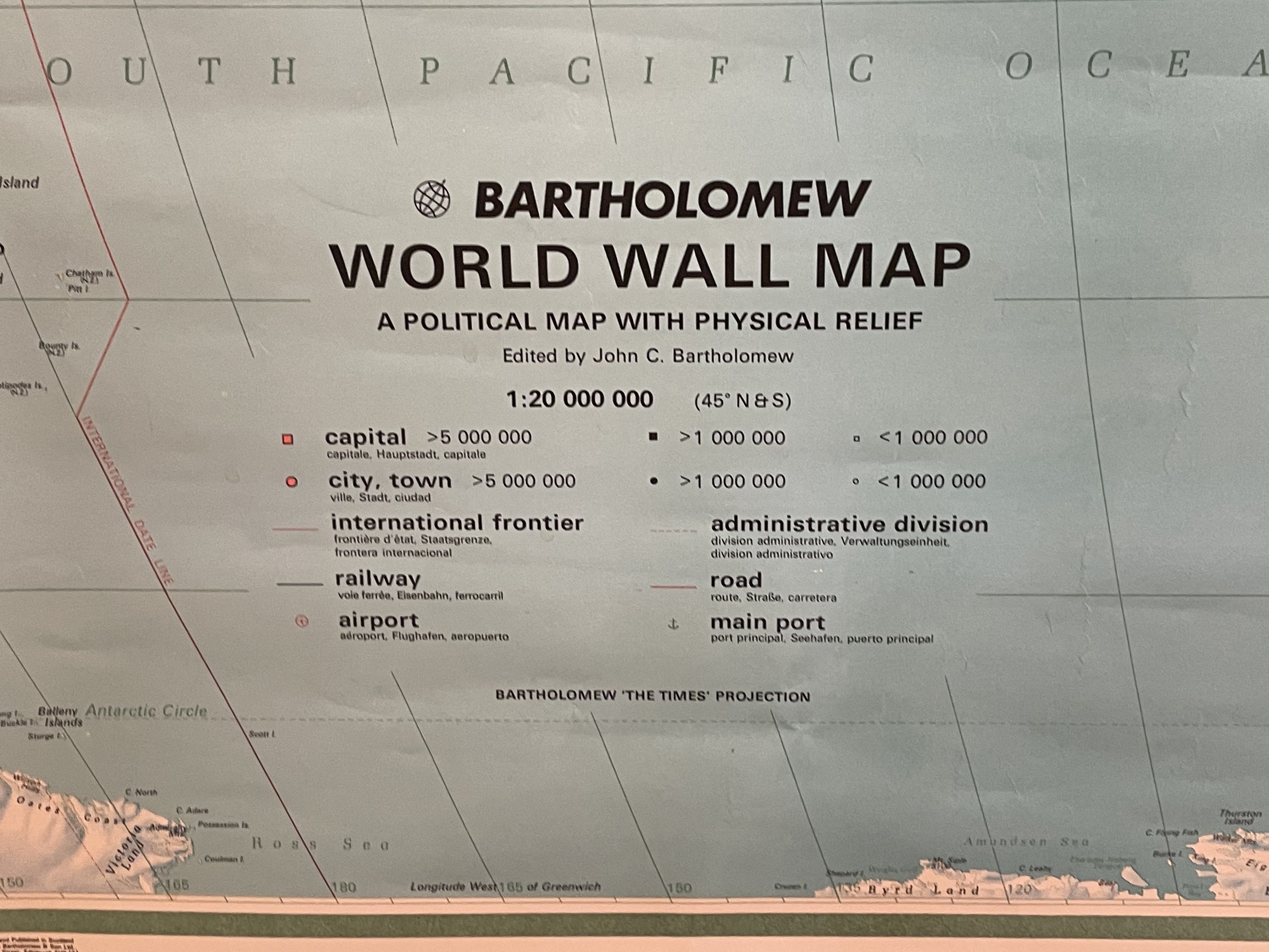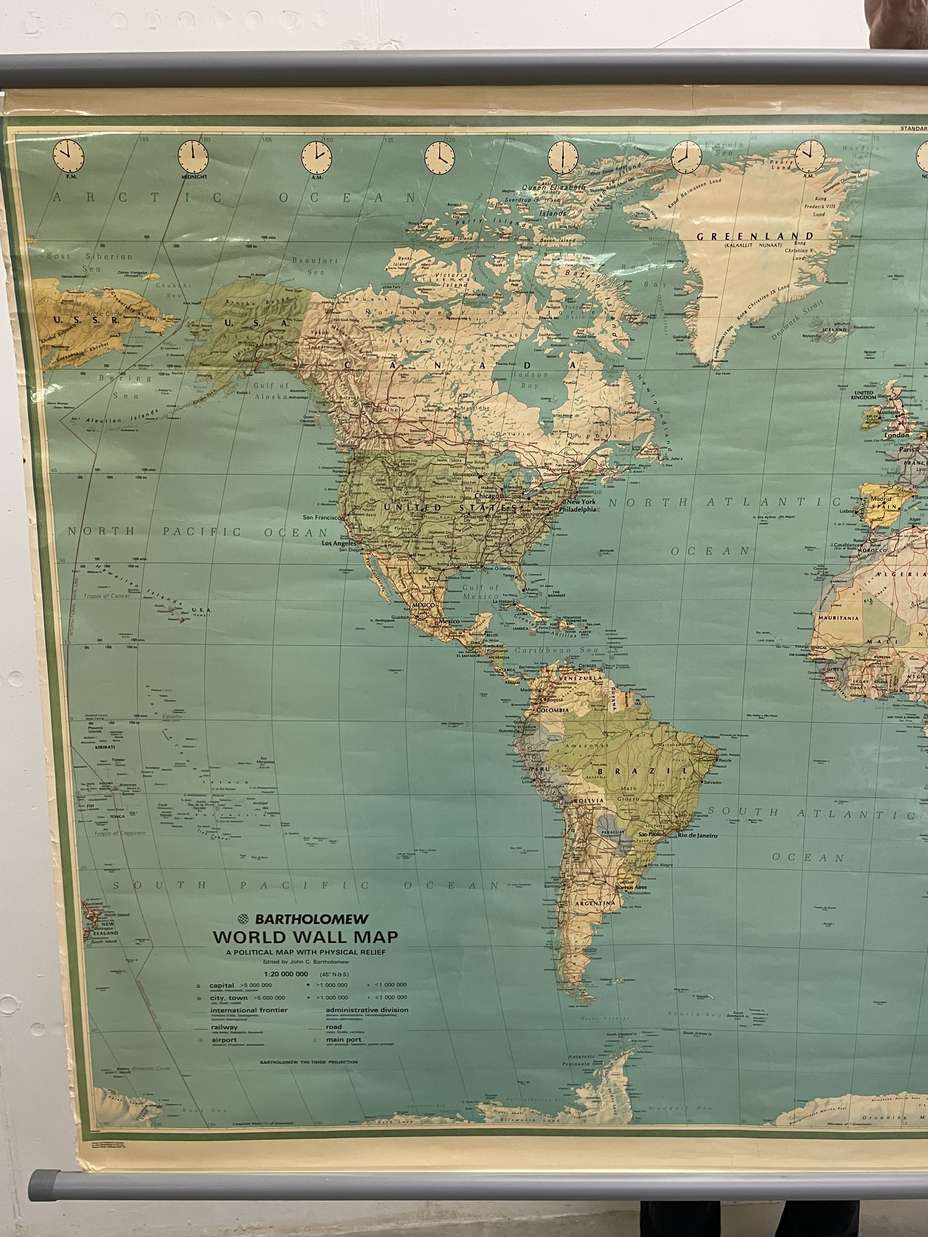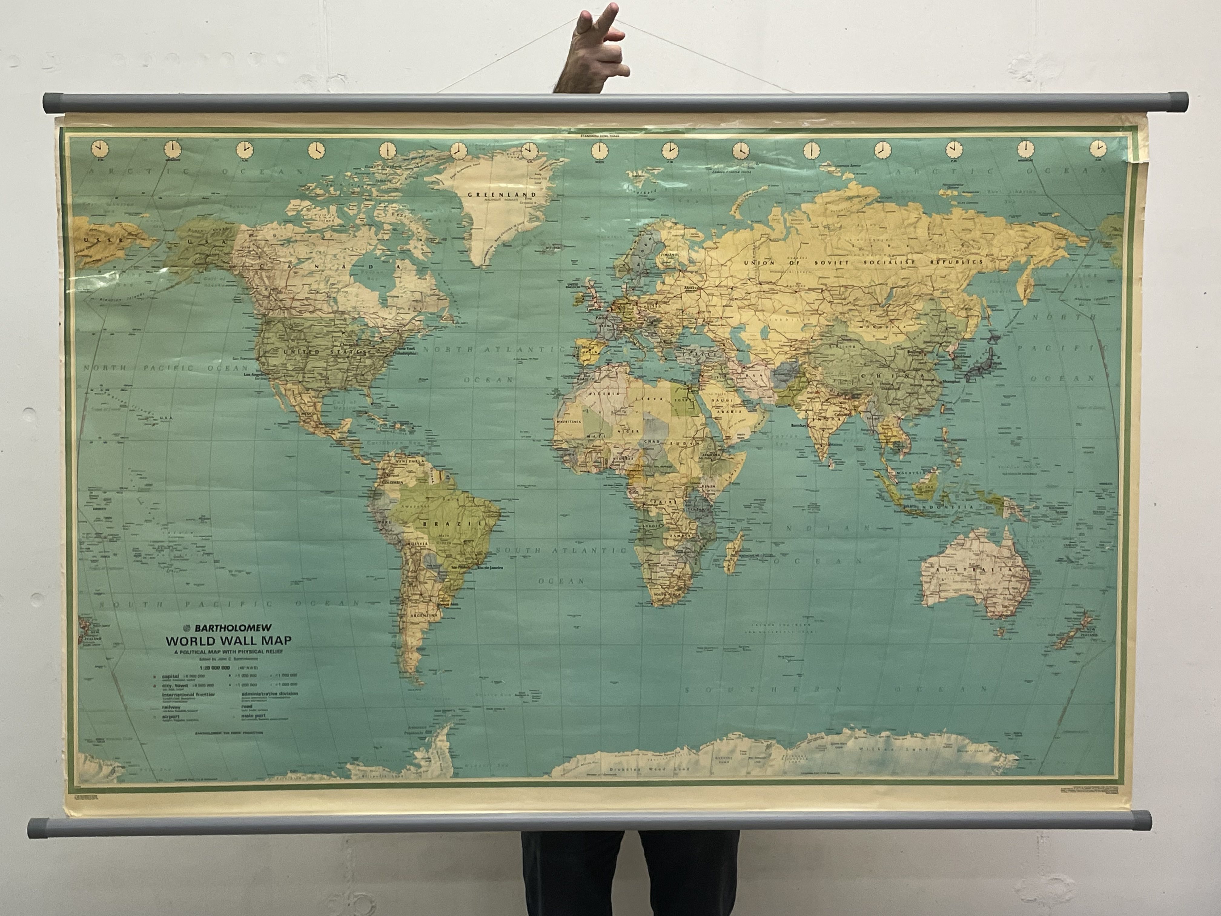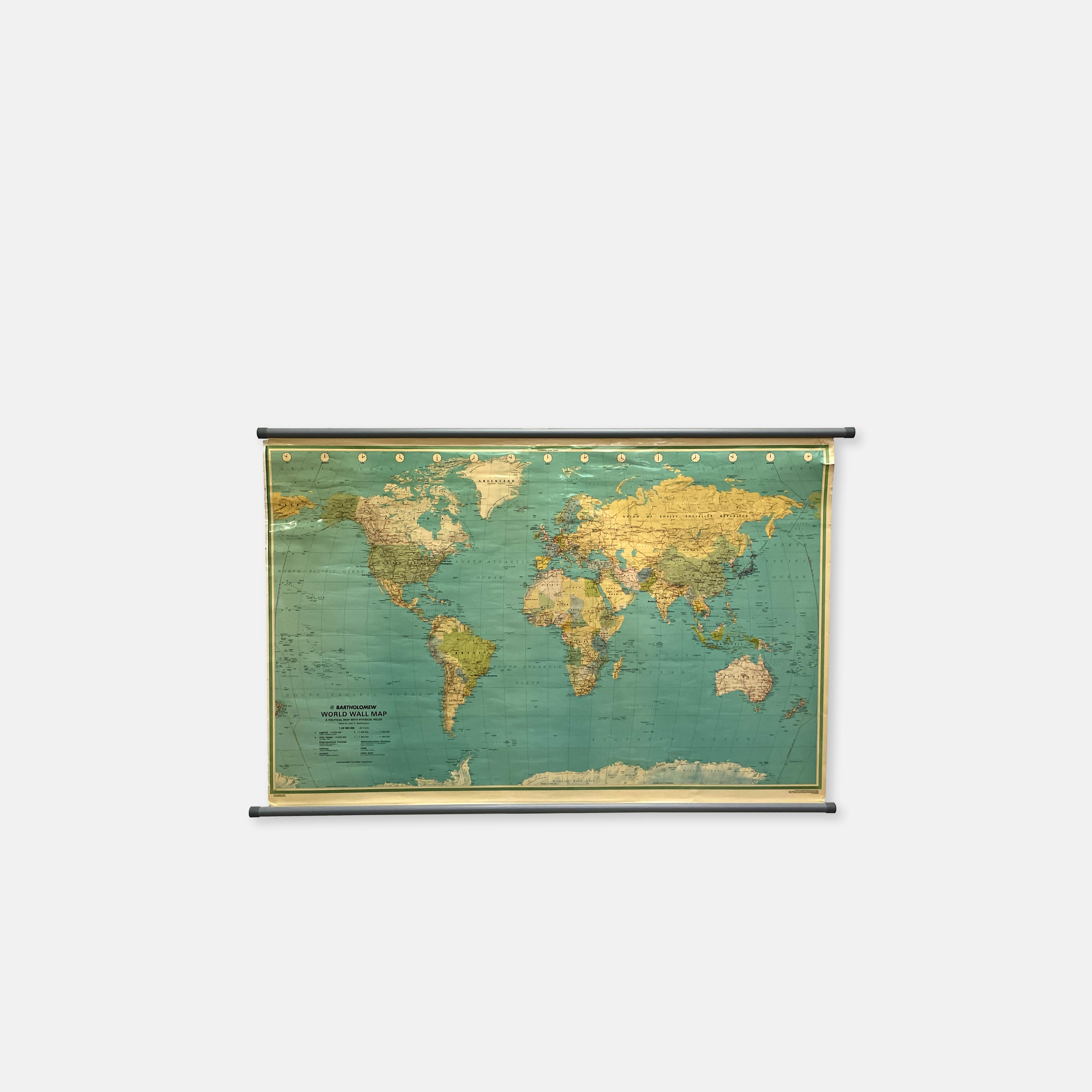 Carte du monde datant environ des années 80. Une ficelle permet de l’accrocher au mur. Les 2 tubes gris sont en plastique.