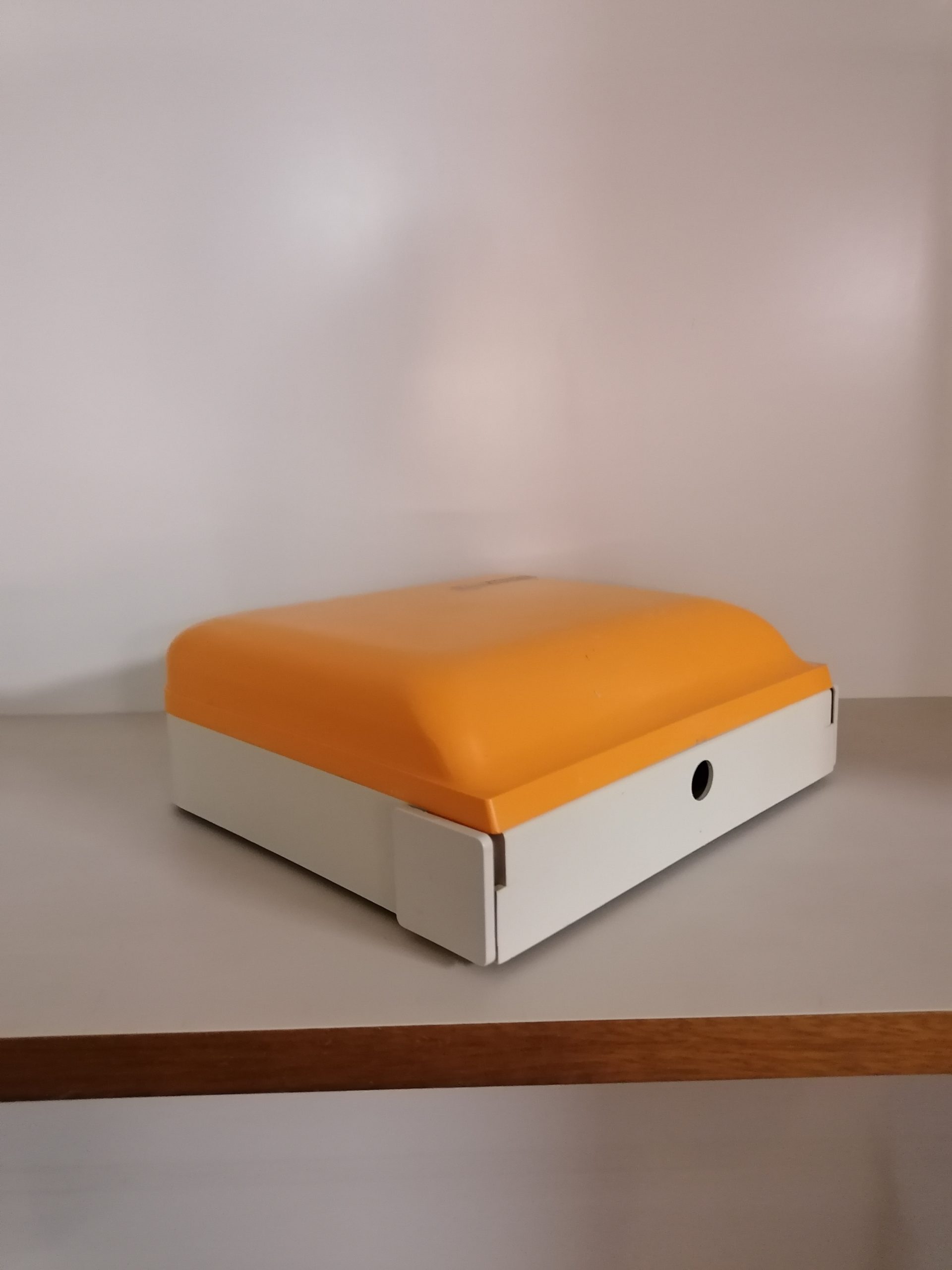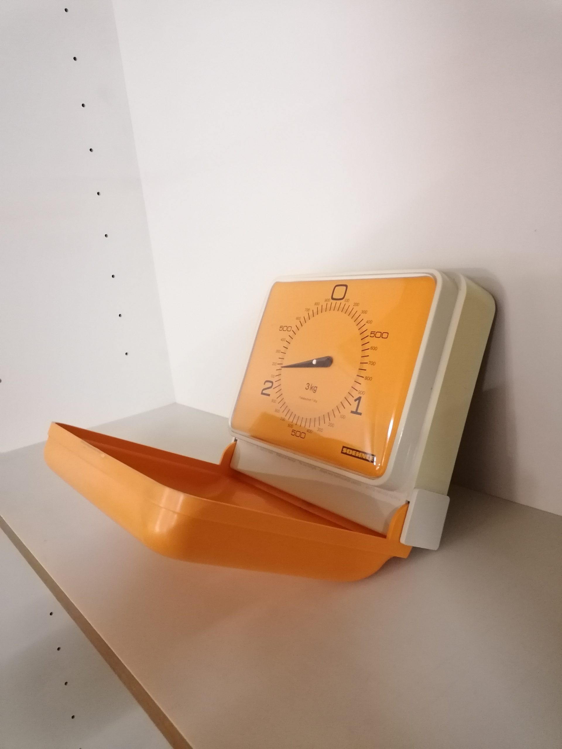 Produit venduBalance vintage en plastique et métal. Produite par l’entreprise allemande Soehnle. Belle couleur orange. La balance s’accroche au mur et le plateau se déplie pour être utilisé. Poids max : 3 kg.