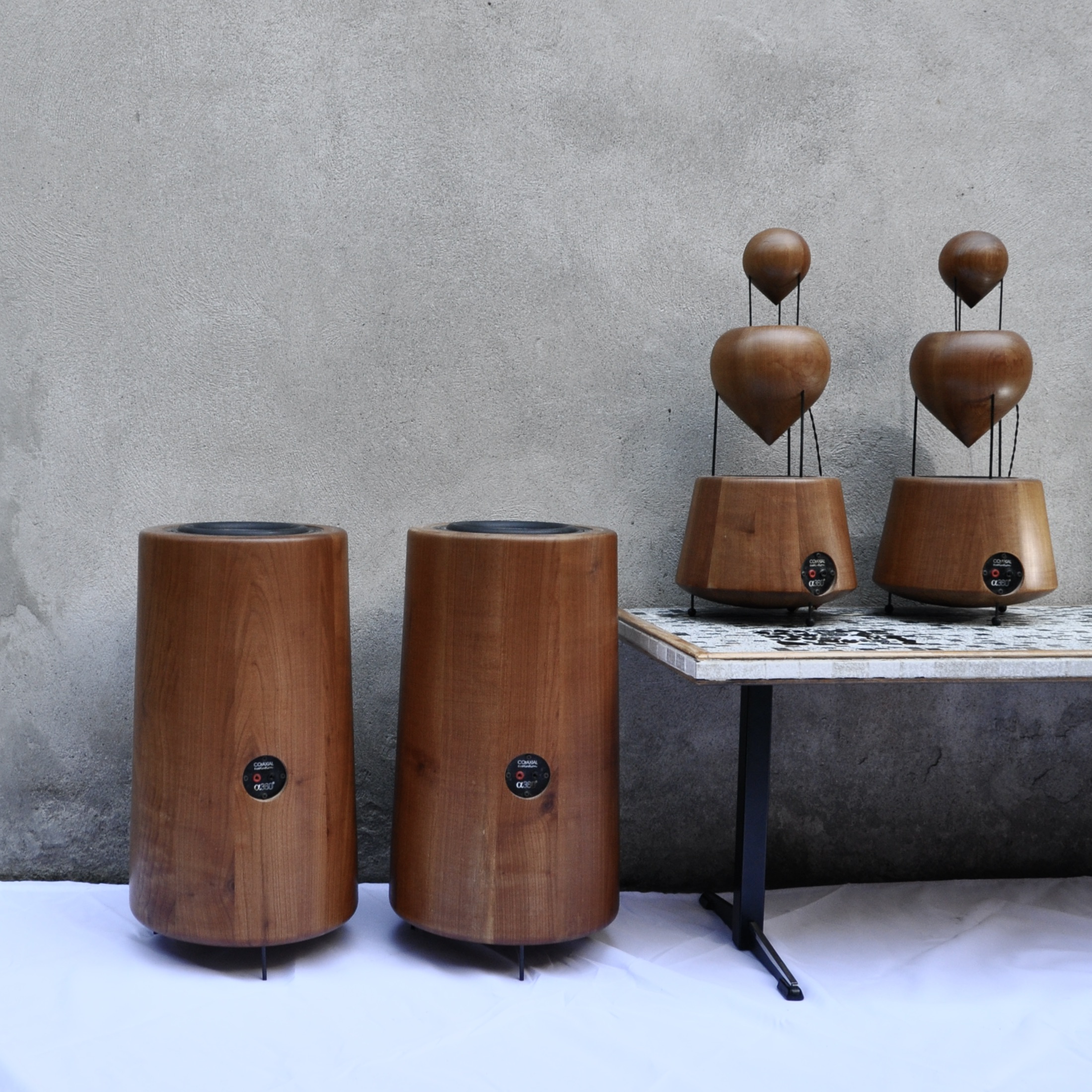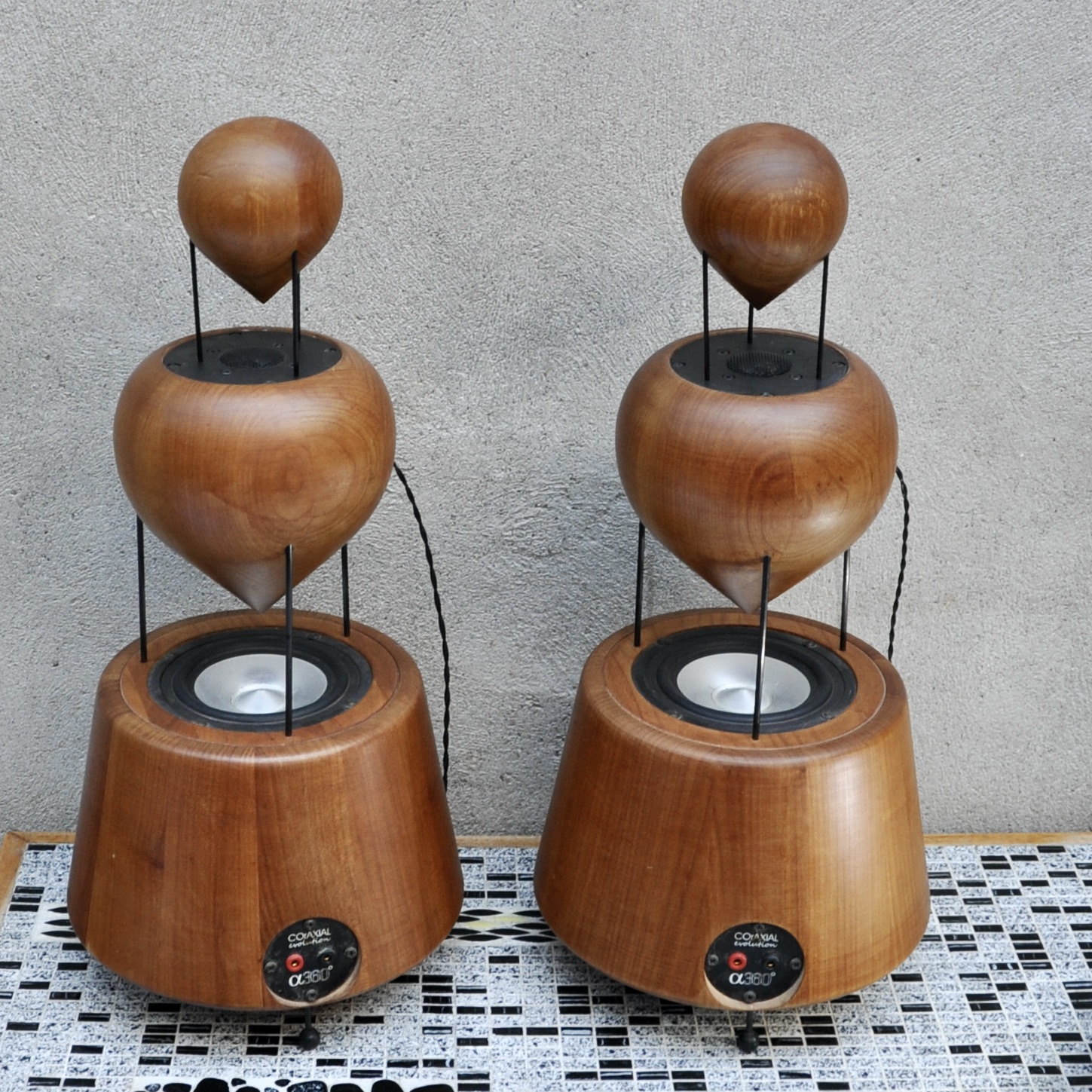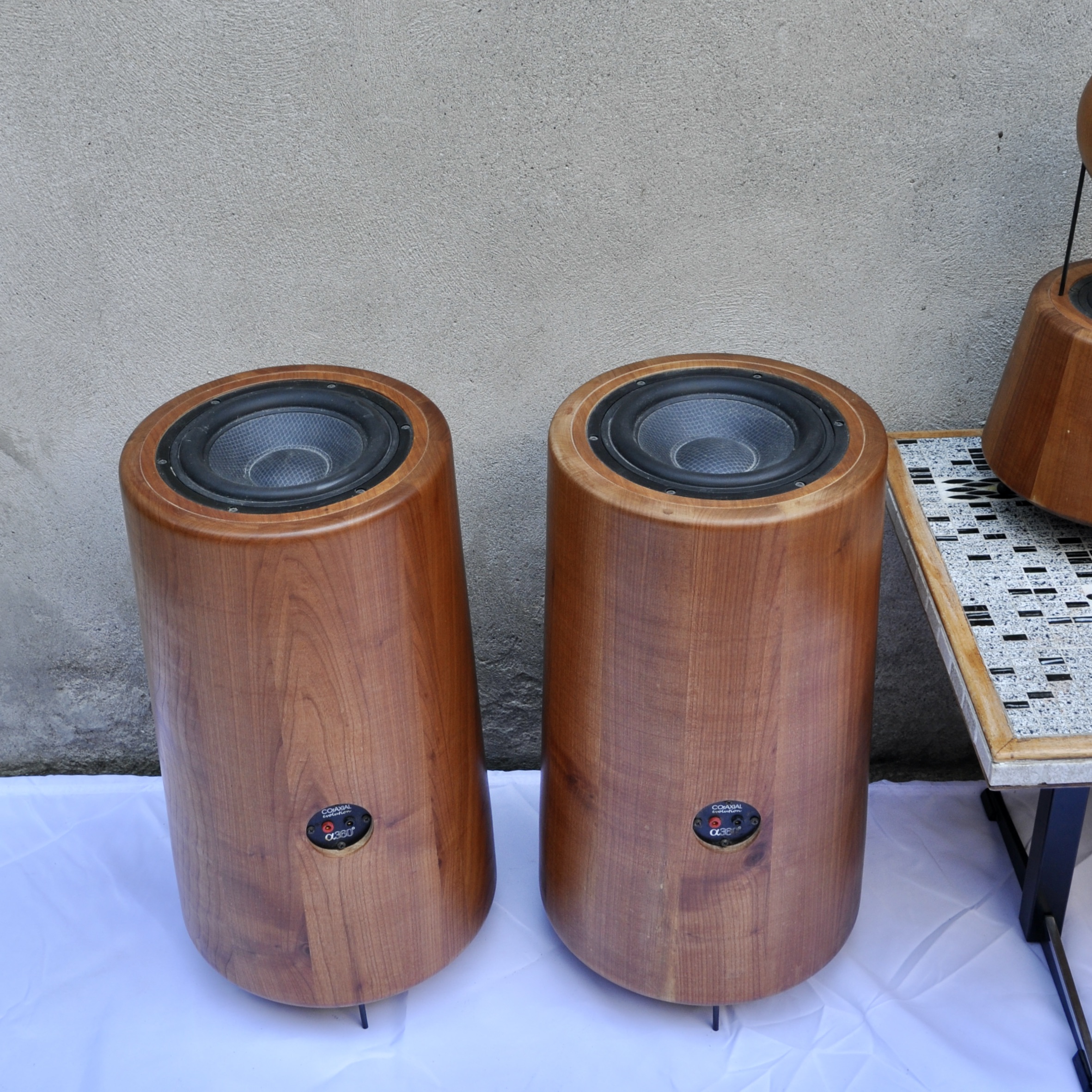Ensemble de haut-parleurs de la marque dB360°, un concept audio complètement innovant de fabrication suisse. Après 7 ans de recherche, Daniel Brand a inventé un boîtier, évent & têtes réfléchissantes à 360°, le R&D dB360°. Avec optimisation des caractéristiques physiques & acoustiques de chaque élément, une conception & réalisation des pièces en bois nobles construites à la façon d’un tonneau, des transitoires ultra rapides, le respect des phases et un HP large bande haut de gamme, sans aucun filtre, la liberté de déplacement et l’émission de toutes les fréquences à 360°à partir d’un axe vertical. Il y a une enceinte par canal.