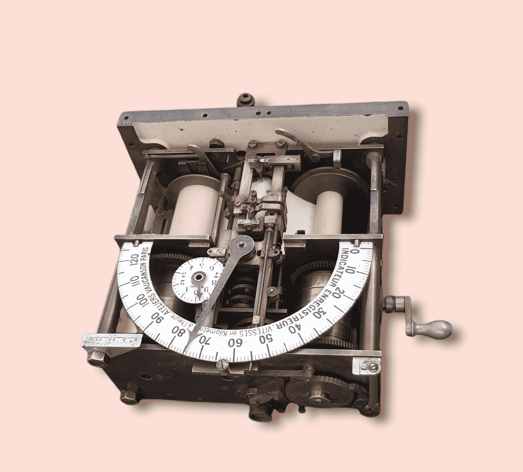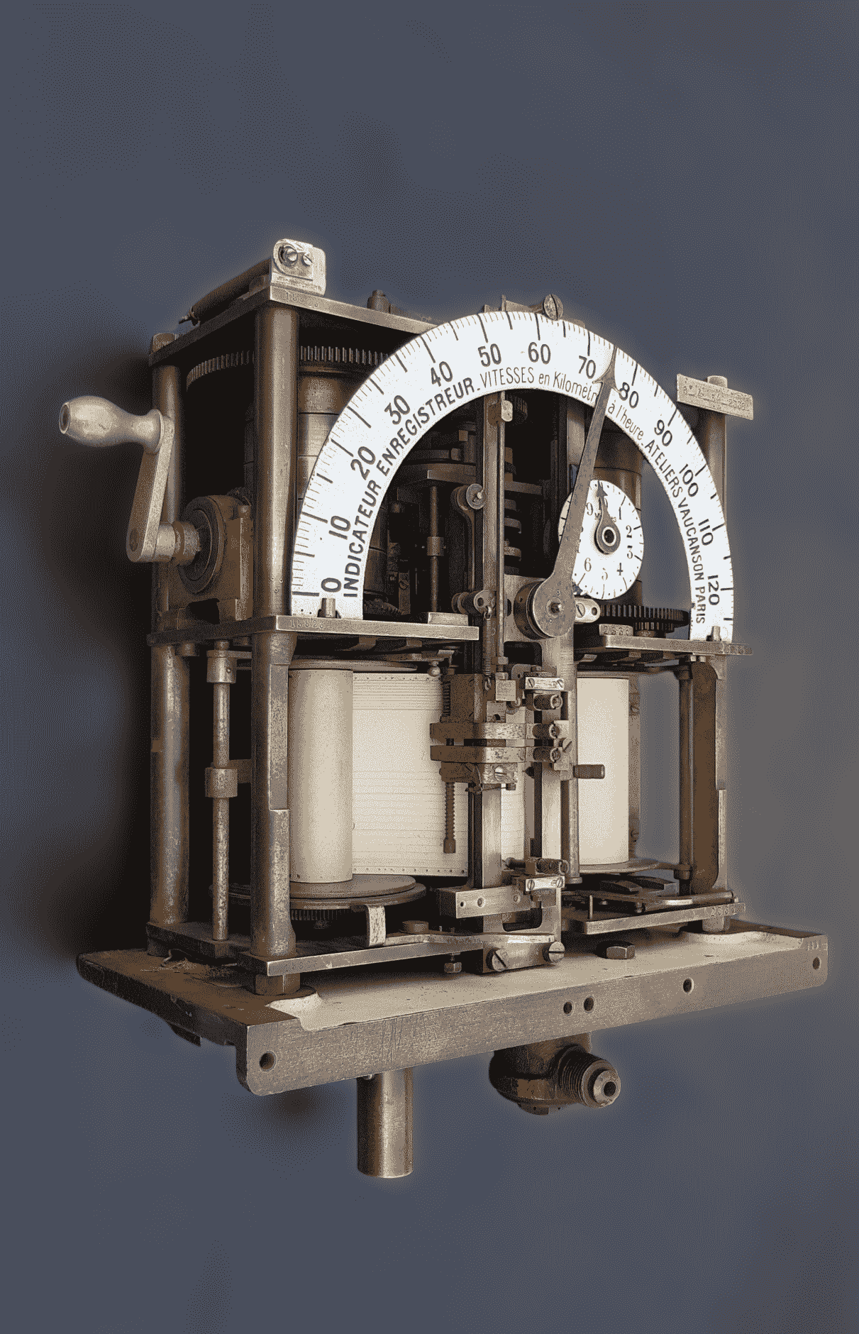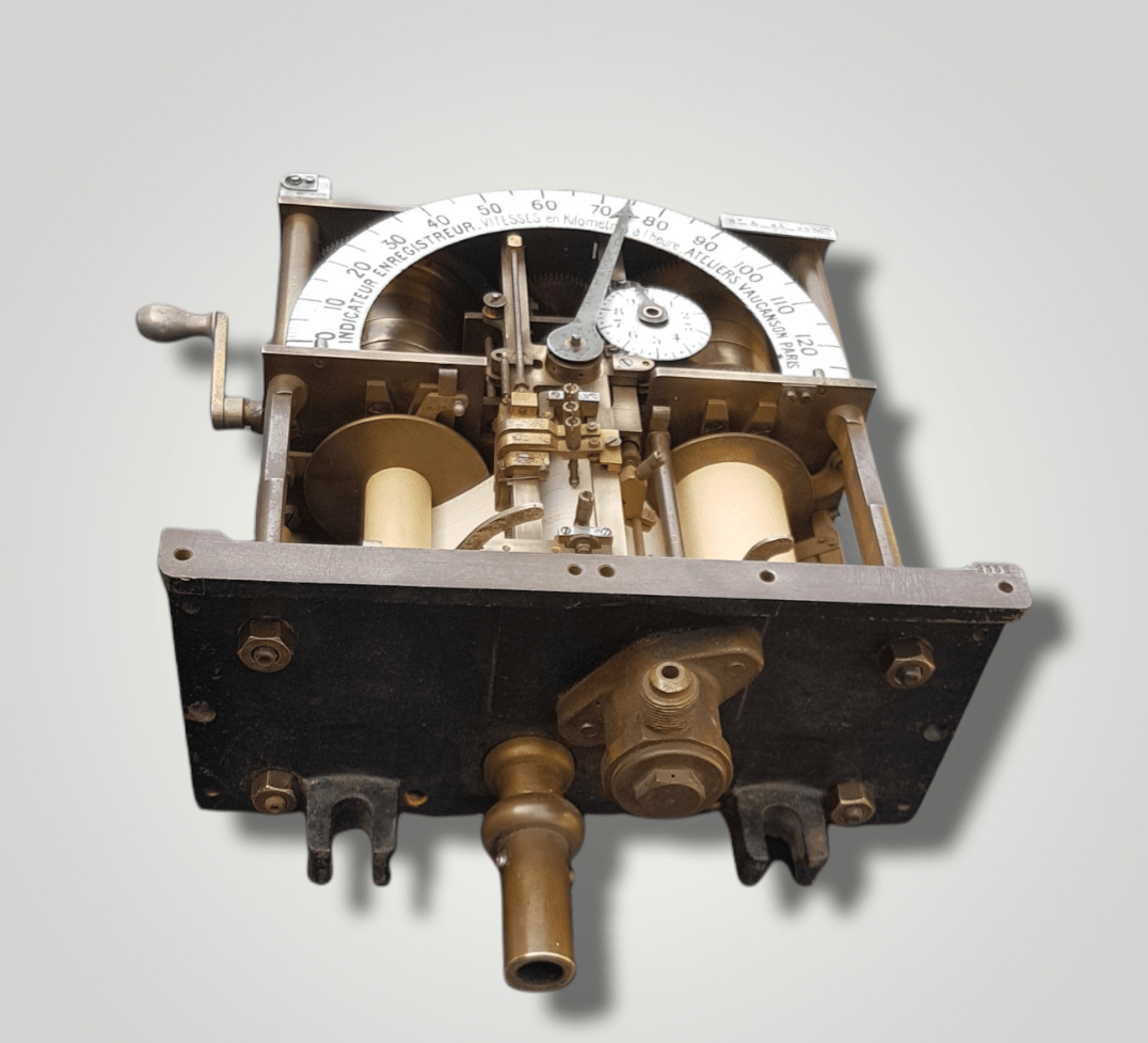 Produit venduMagnifique indicateur et enregistreur de vitesse des ateliers Vaucanson à Paris, des années 1950 environ. Manque le boîtier et le verre le recouvrant, mais sa mécanique est bien mise en valeur et les plaques émaillées des 2 compteurs sont en superbe état.