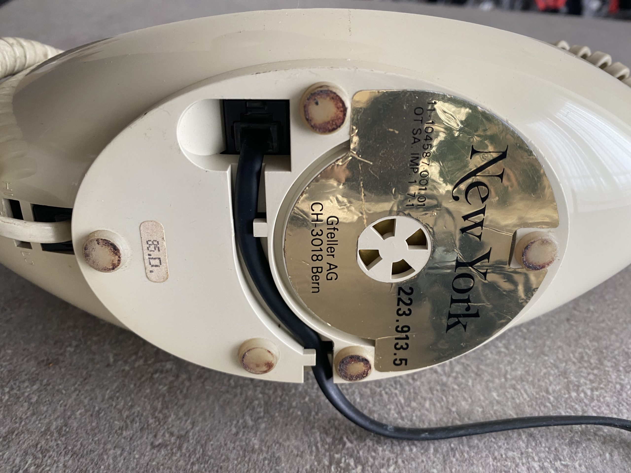 Produit venduTéléphone “New York” de la marque suisse Gfeller. Années 80. En plastique. Quelques très légères traces d’usures, mais excellent état général. Avec câble et prise ISDN. Livraison possible selon le lieu. Envoi postal possible.