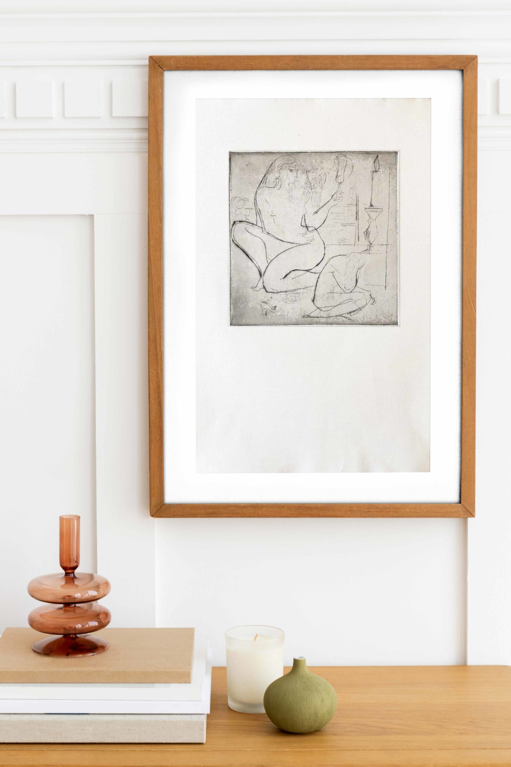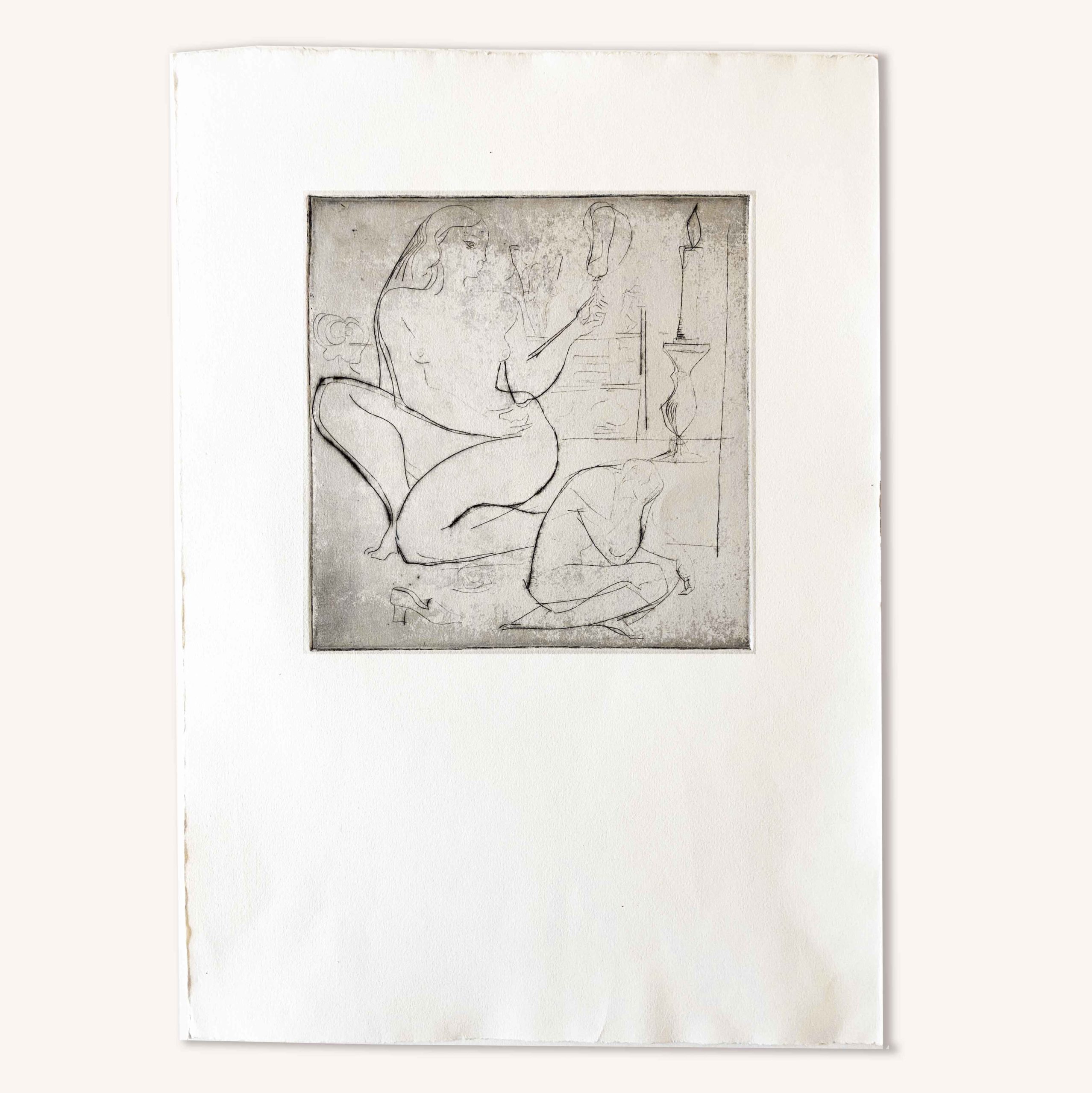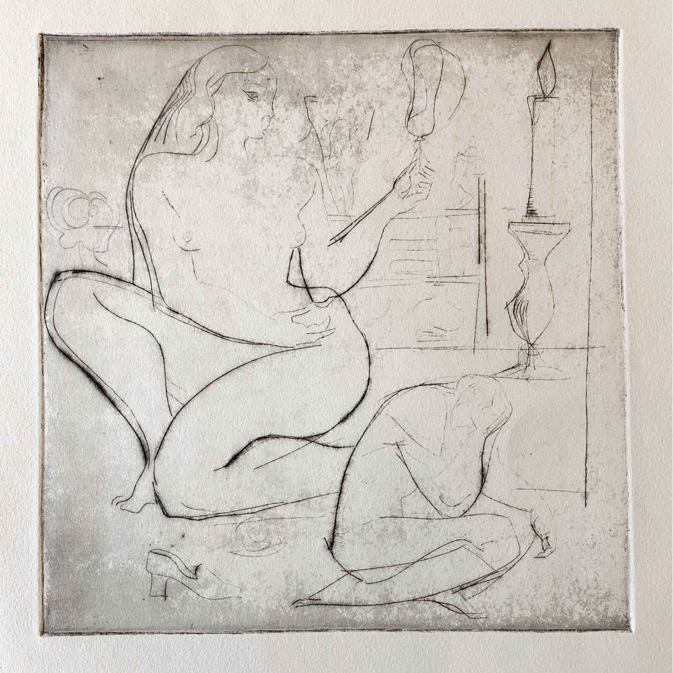 Gravure de Ferenc Bugyil avec une femme au miroir