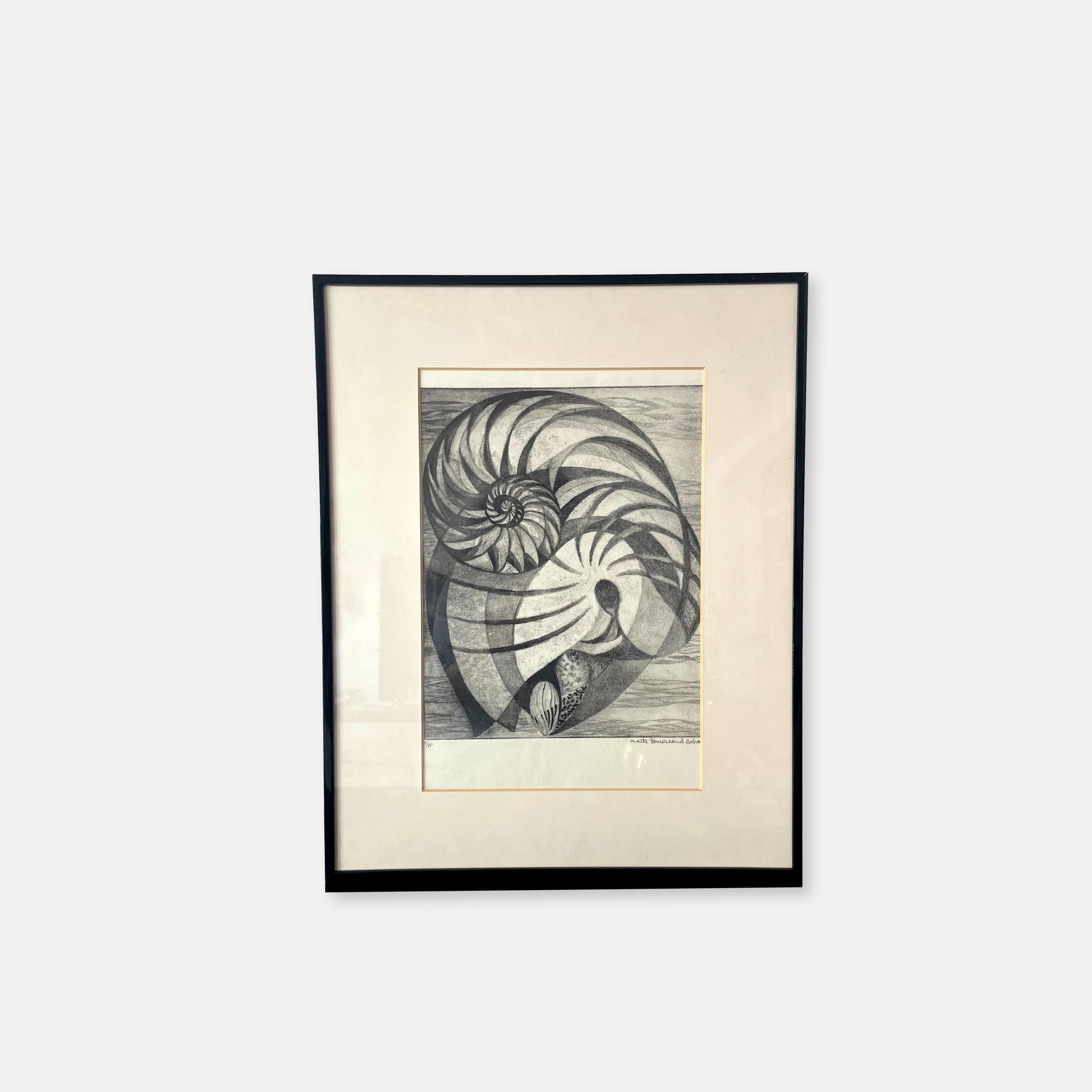 Grande gravure originale en noir et blanc sur papier BFK Rives de l’artiste Lausannoise Maite Bournoud-Schorp (1909-1997) au décor de coquillages, signée dans la planche et datée de 1980.