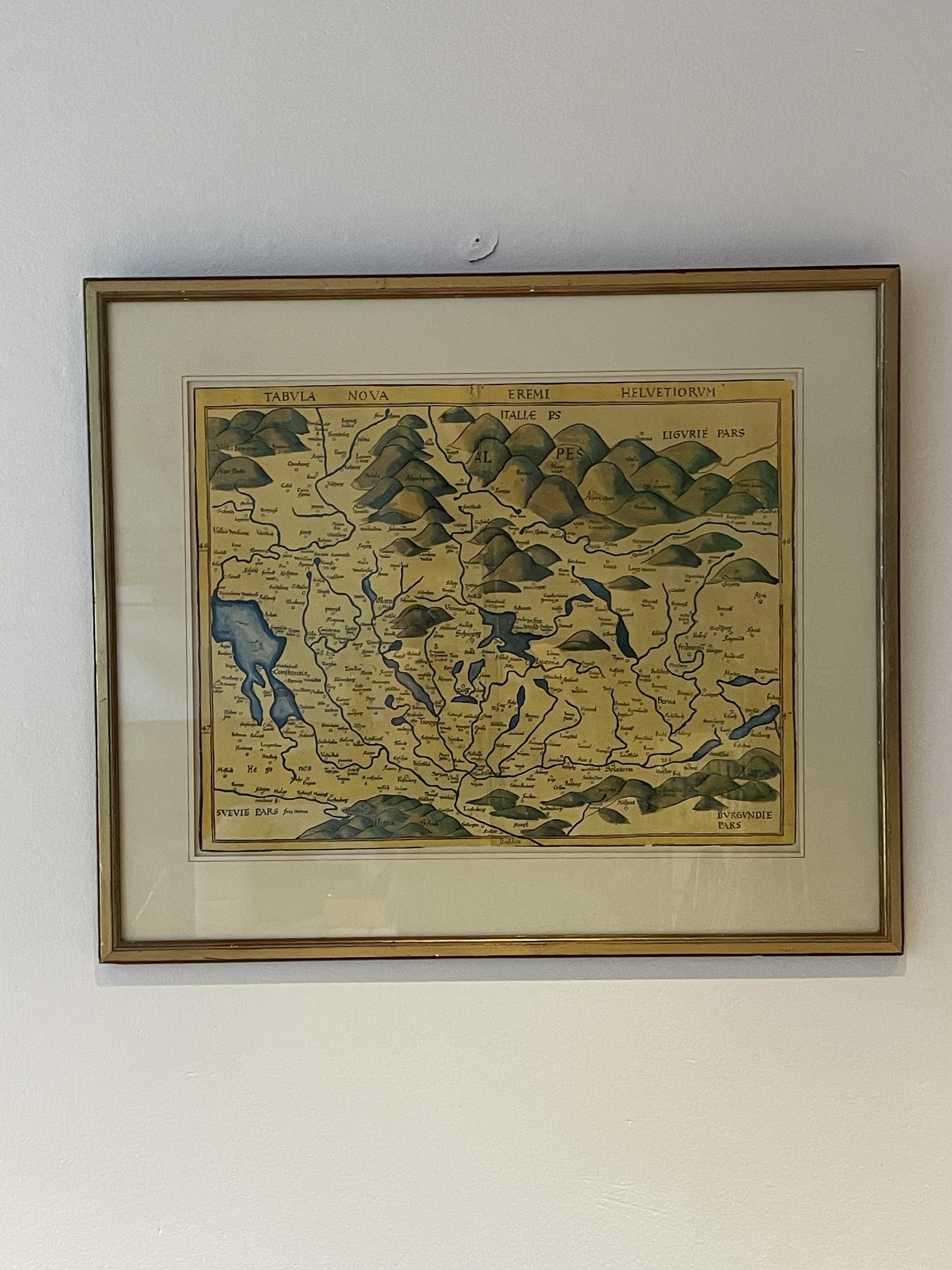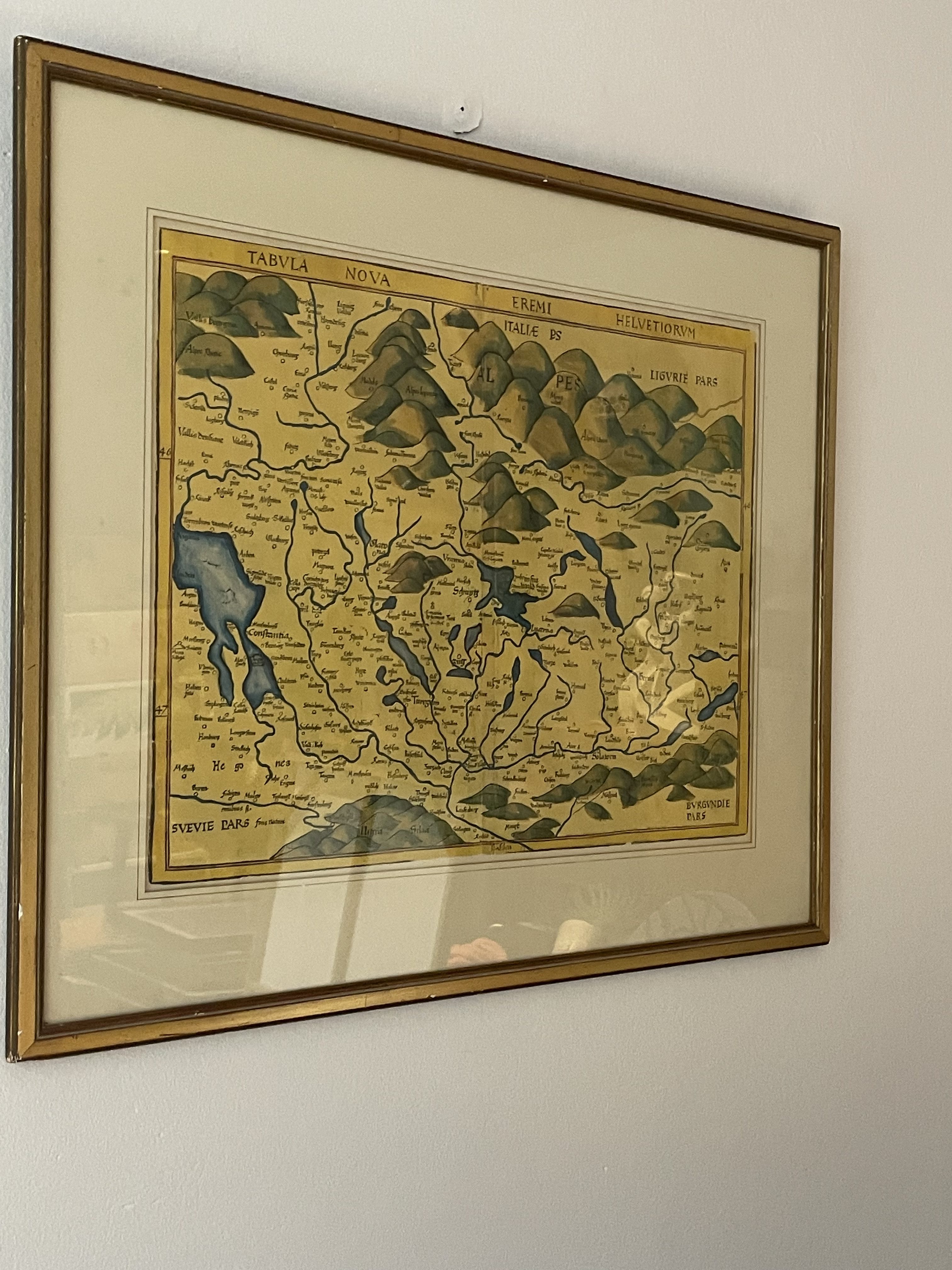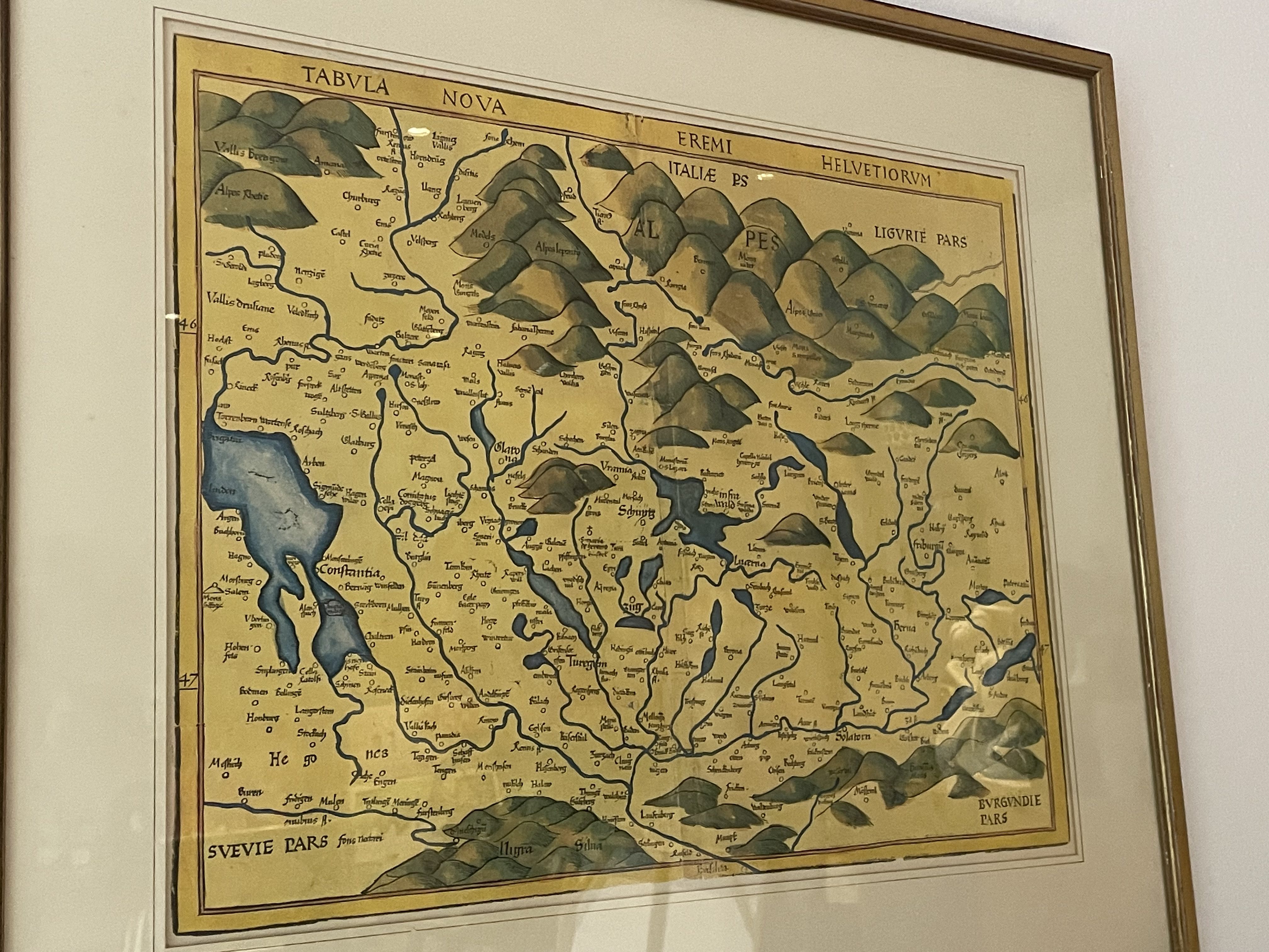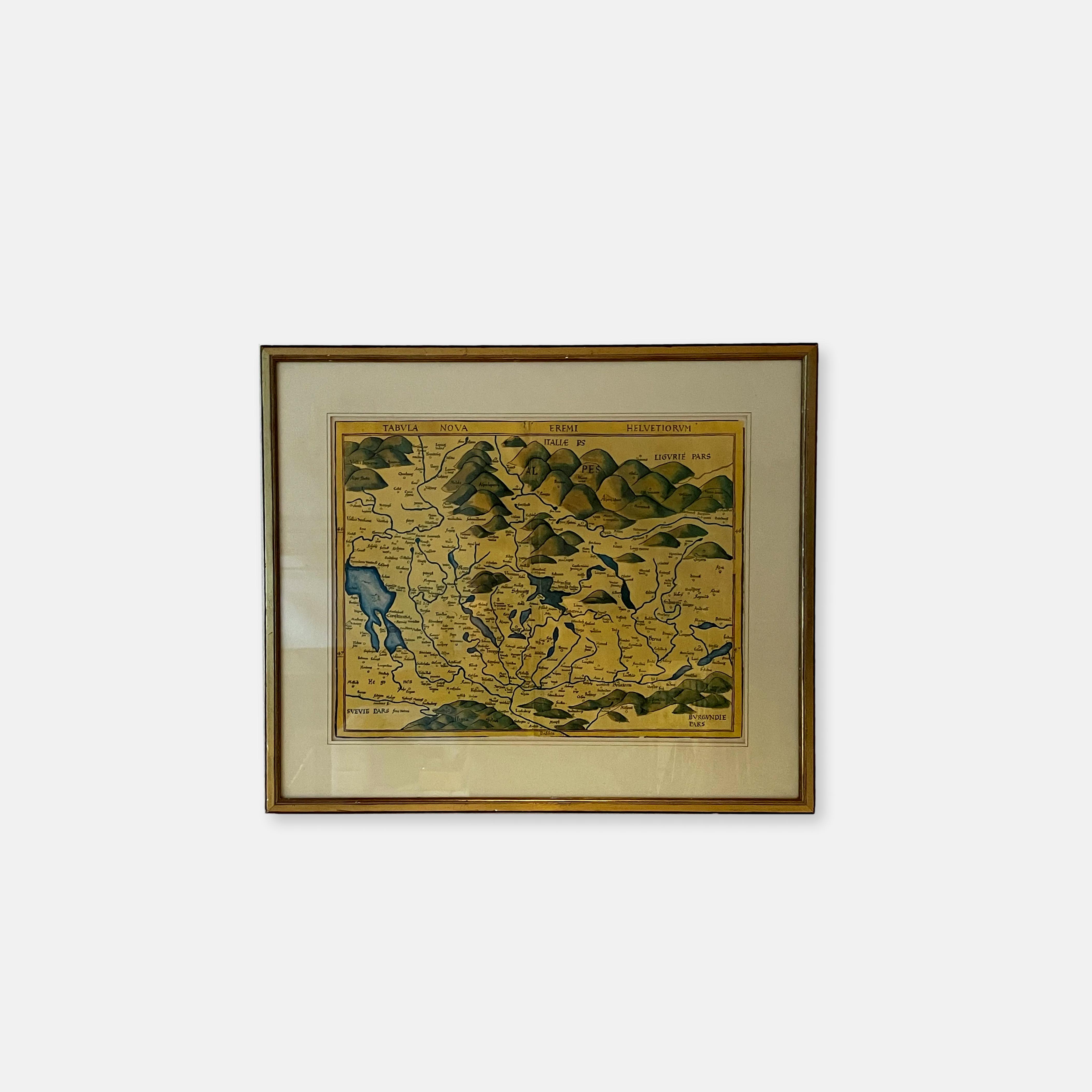Produit venduReproduction ancienne sous cadre d’une carte de Suisse du XVIe siècle de Martin Waldseemüller.
