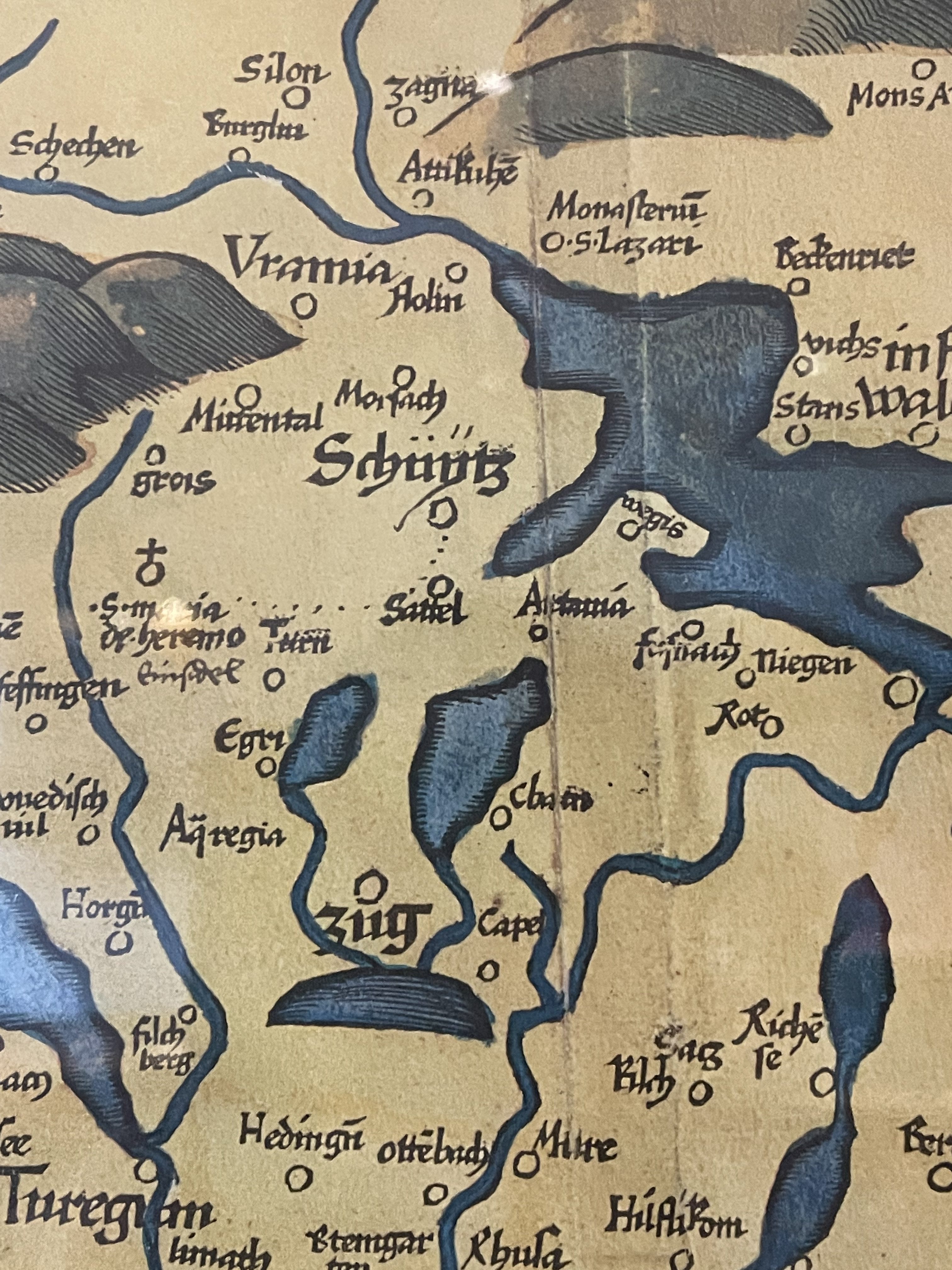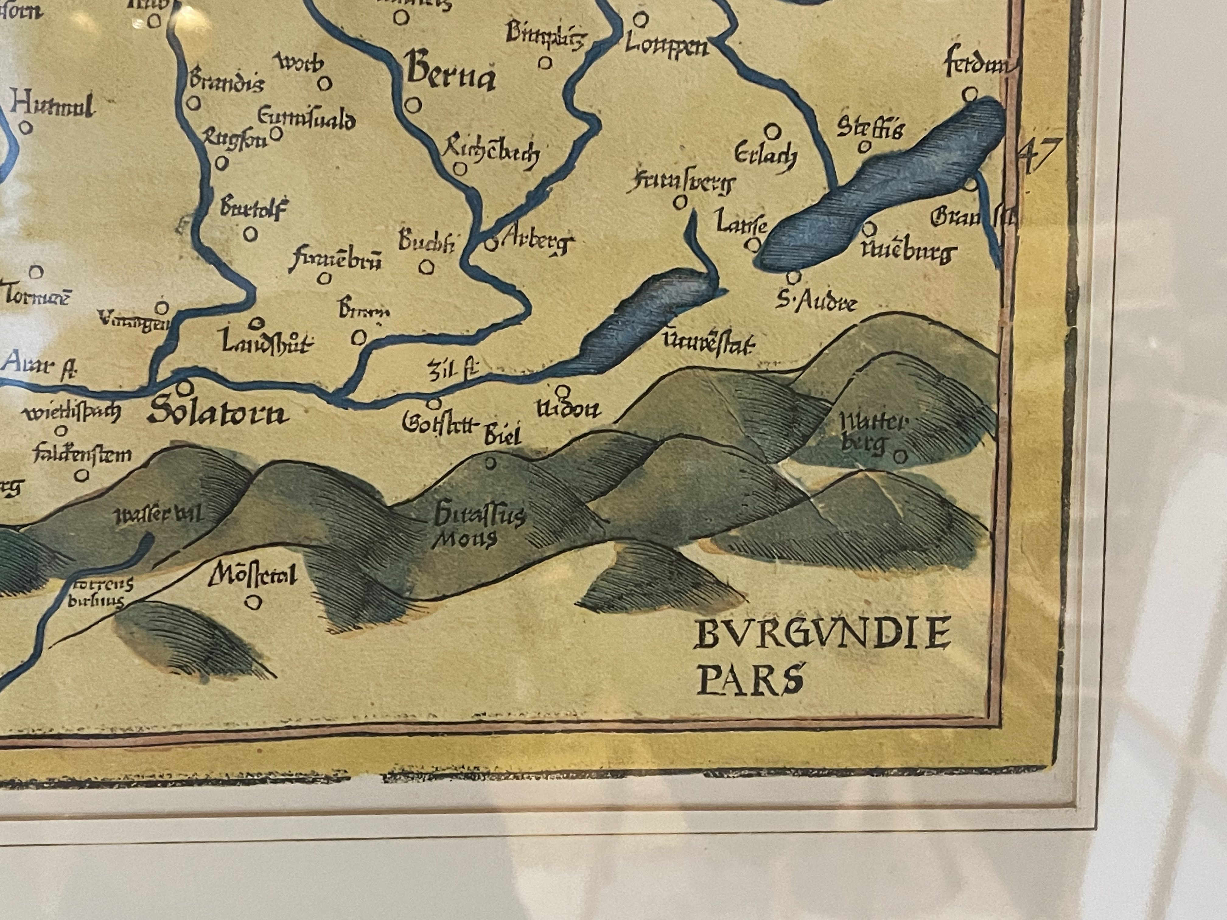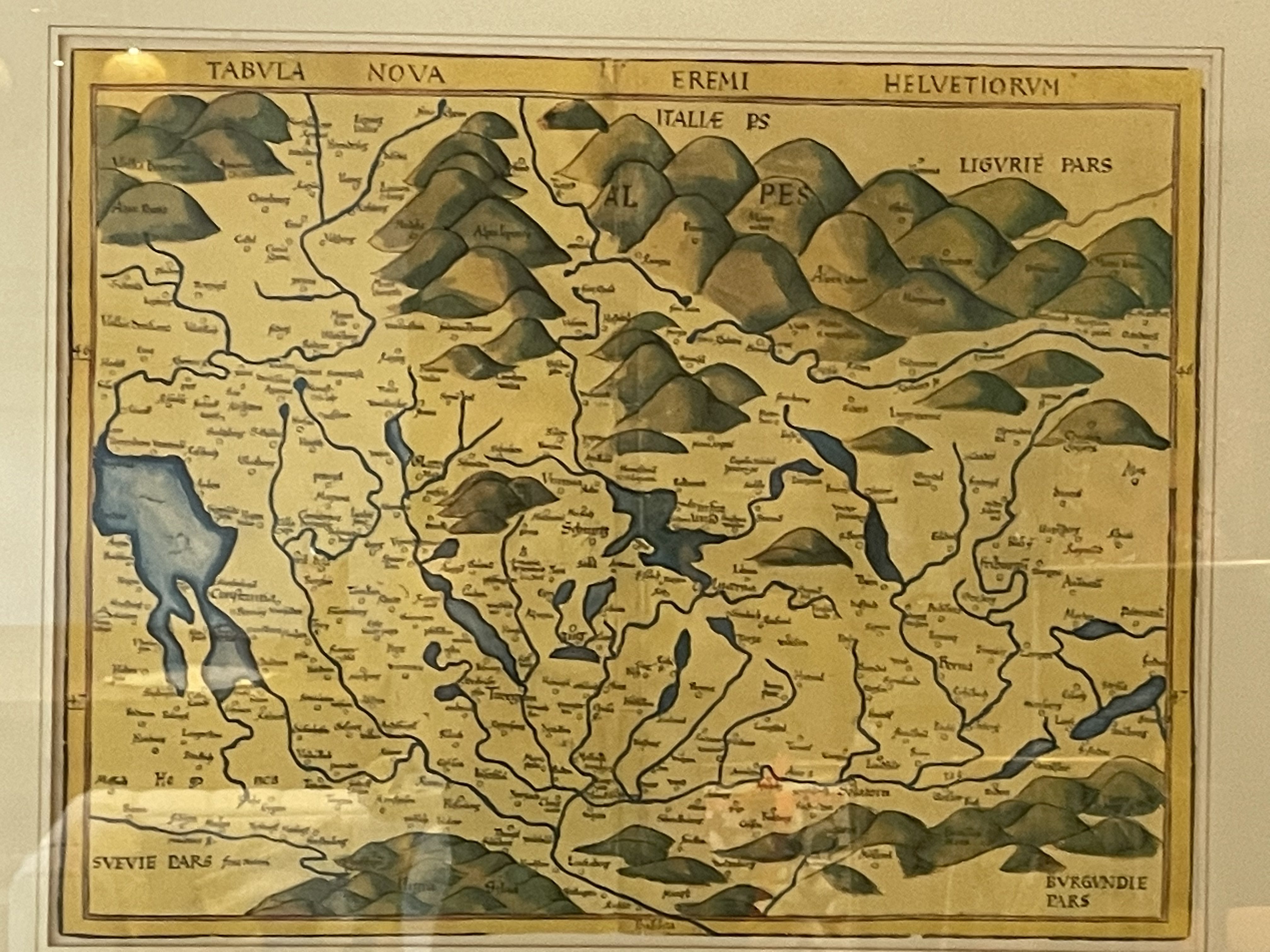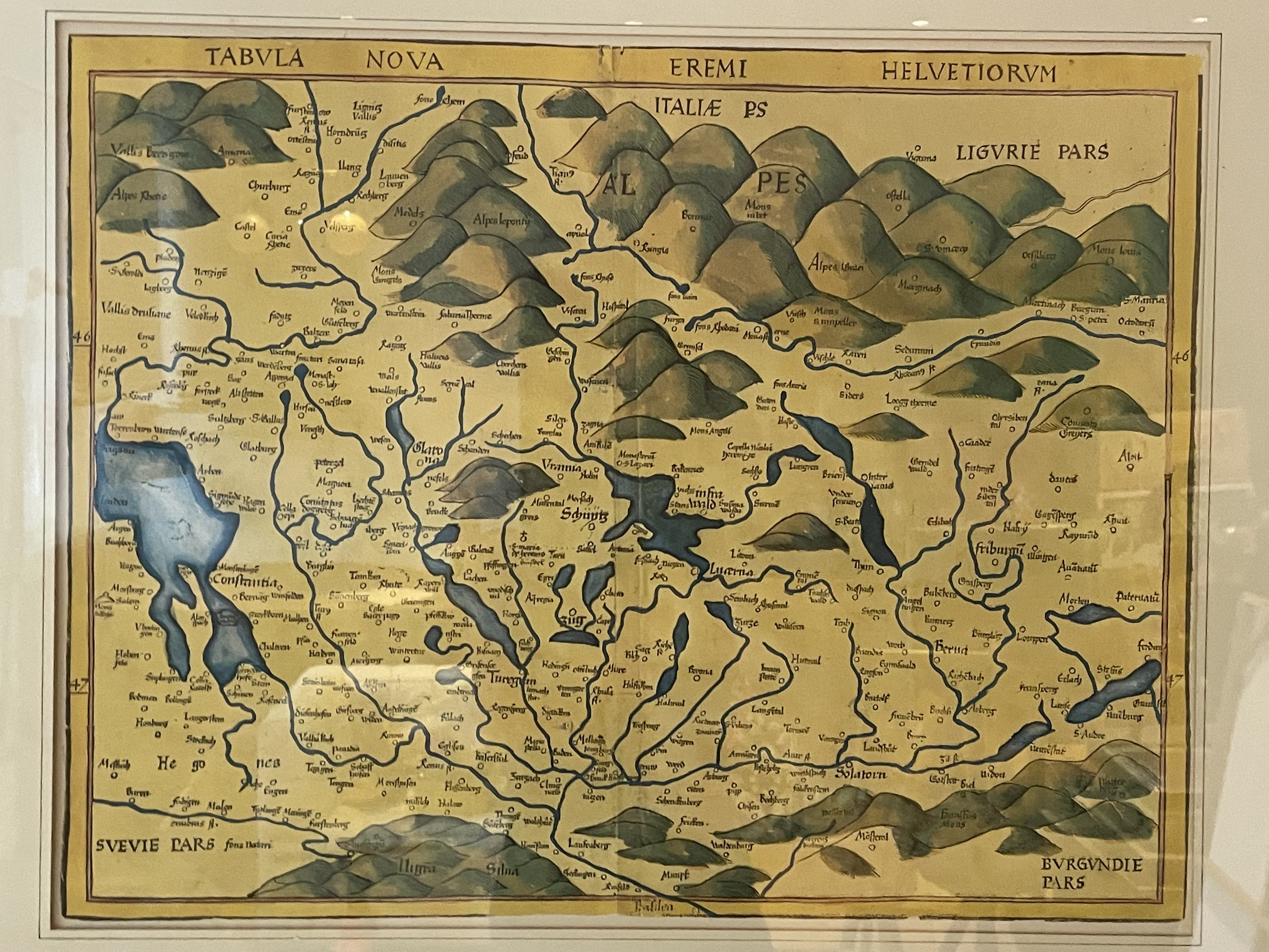 Produit venduReproduction ancienne sous cadre d’une carte de Suisse du XVIe siècle de Martin Waldseemüller.