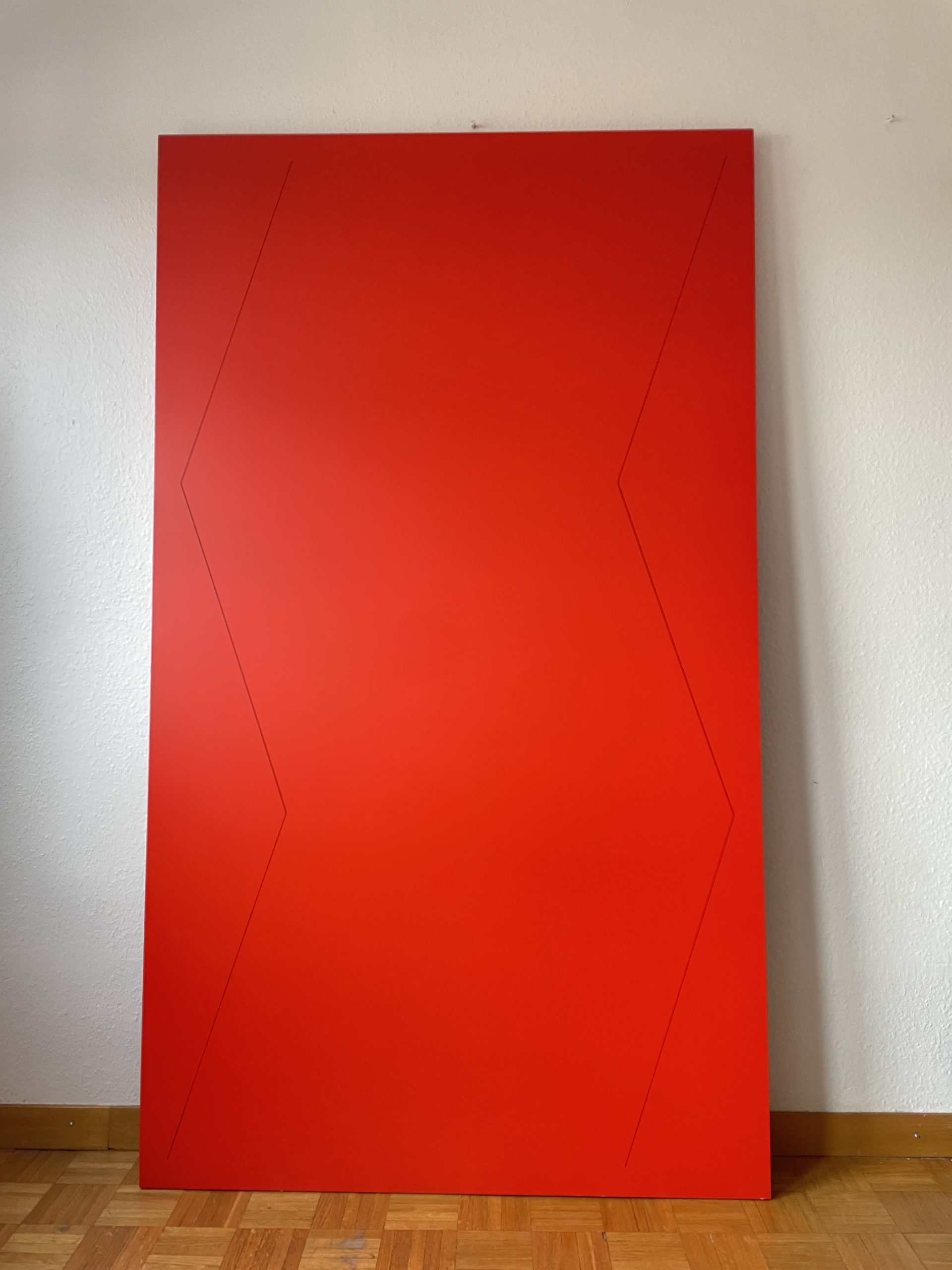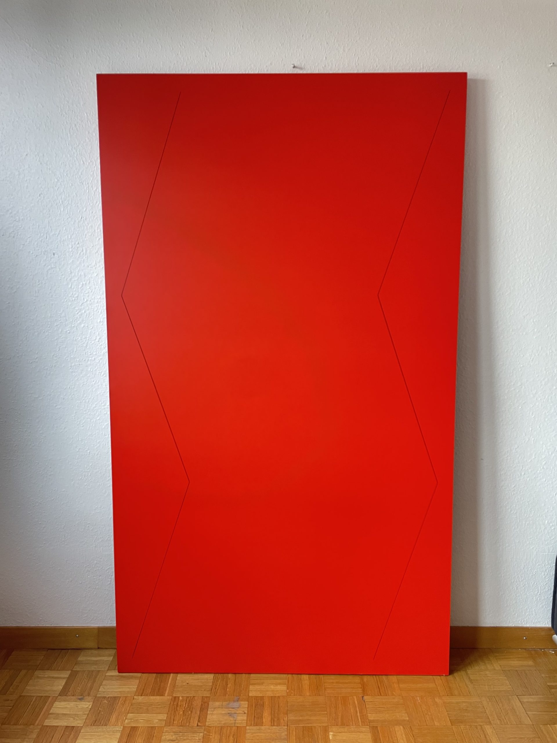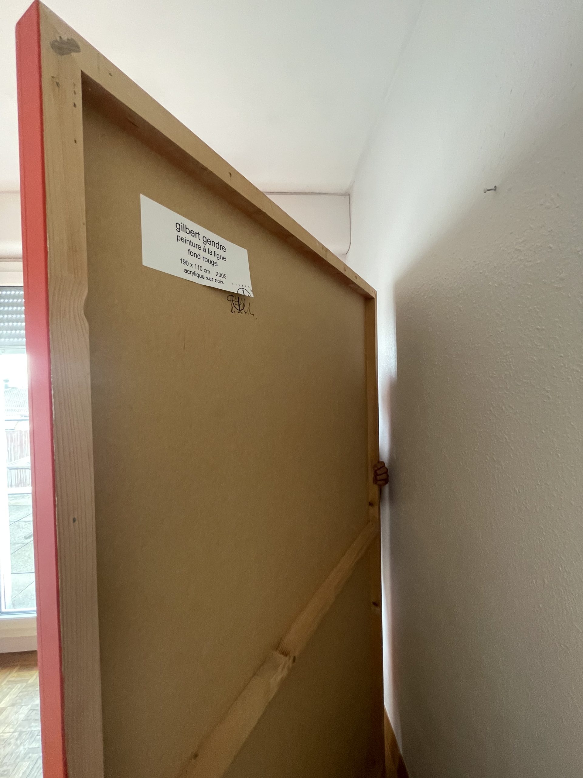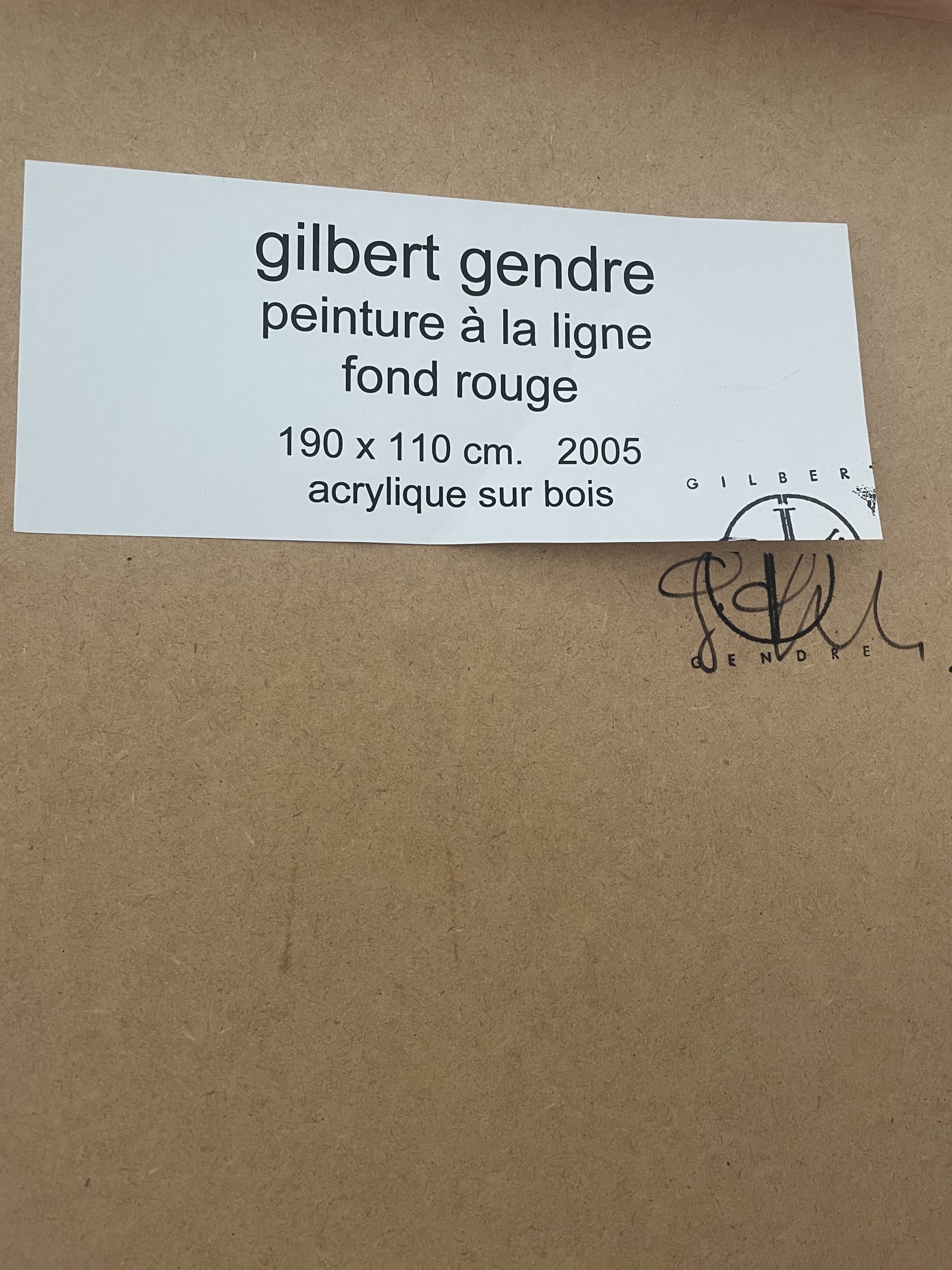 Produit venduGrand tableau de l’artiste Suisse Gilbert Gendre, intitulé “peinture à la ligne sur fond rouge”, daté de 2005, signé et estampillé par l’artiste au dos du tableau.